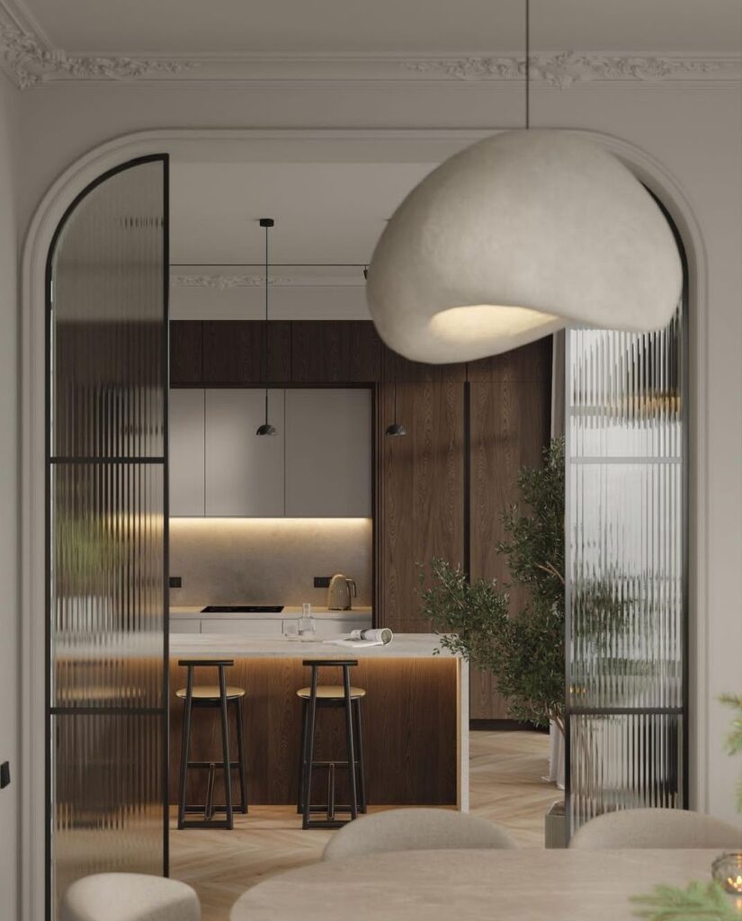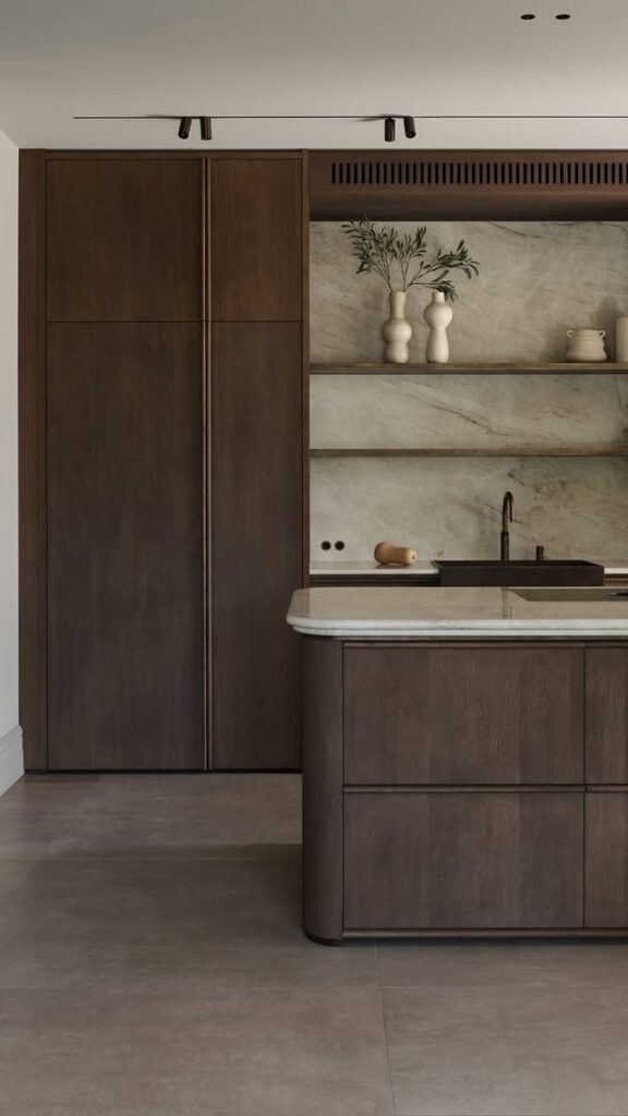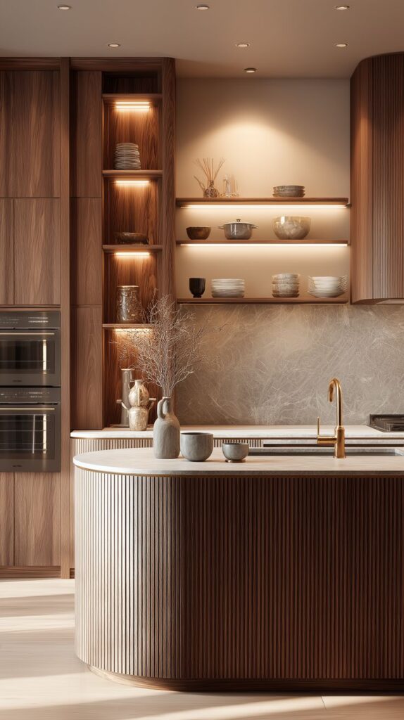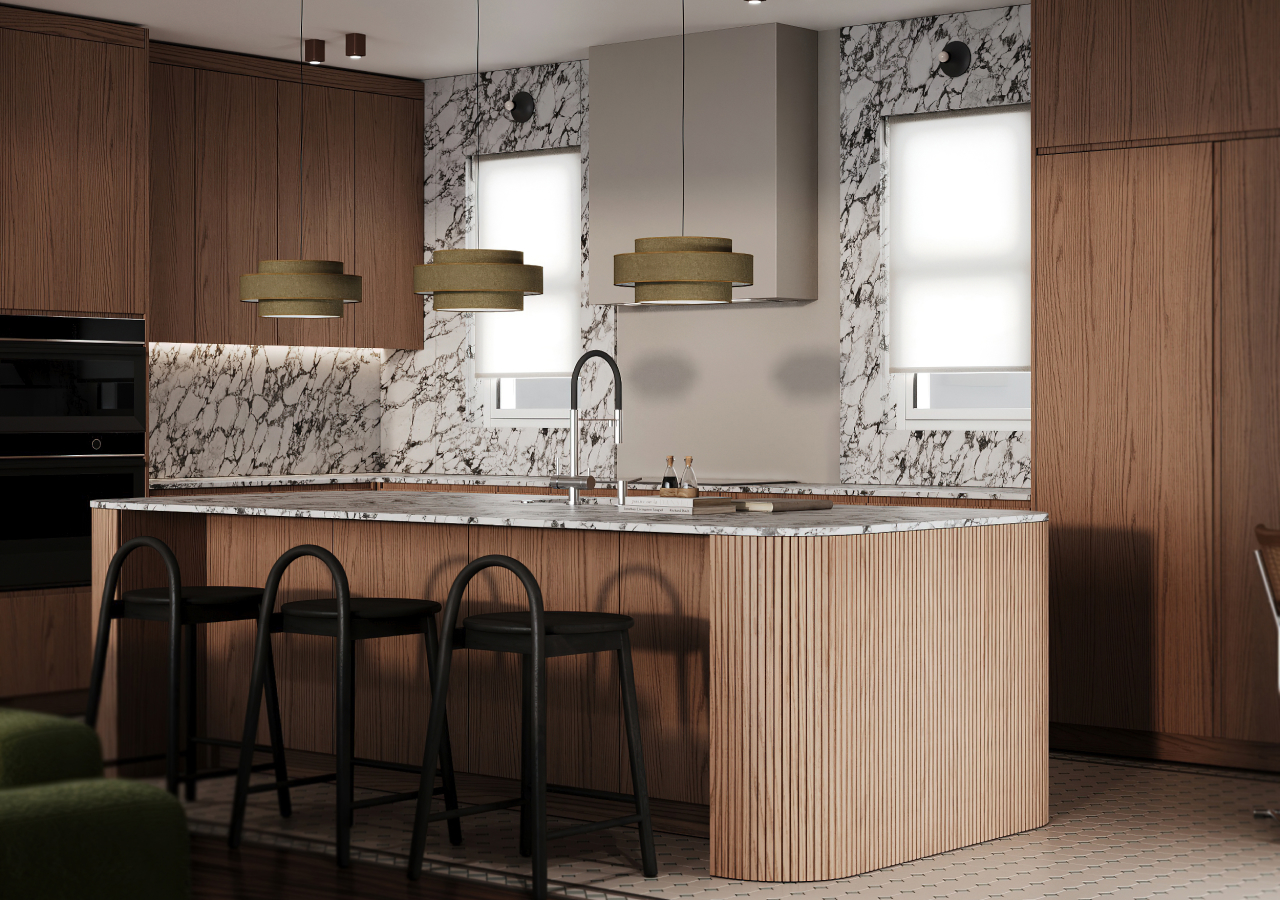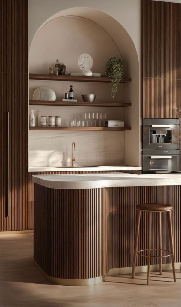 Bucătăriile din 2026 se remarcă prin combinații atent alese de texturi. Lemnul striat sau canelat este asociat cu piatra naturală, precum marmura sau travertinul, pentru a crea profunzime și contrast vizual.