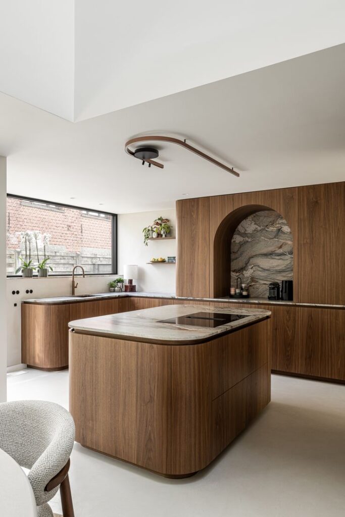 Formele organice se integrează mai bine în spațiile deschise și fac trecerea dintre bucătărie și living mai armonioasă. În același timp, ele contribuie la un design care nu obosește în timp și oferă o senzație de confort real, nu doar vizual. Marginile rotunjite sunt tot mai des alese nu doar din motive estetice, ci și pentru siguranță și ergonomie, mai ales în spațiile intens folosite.