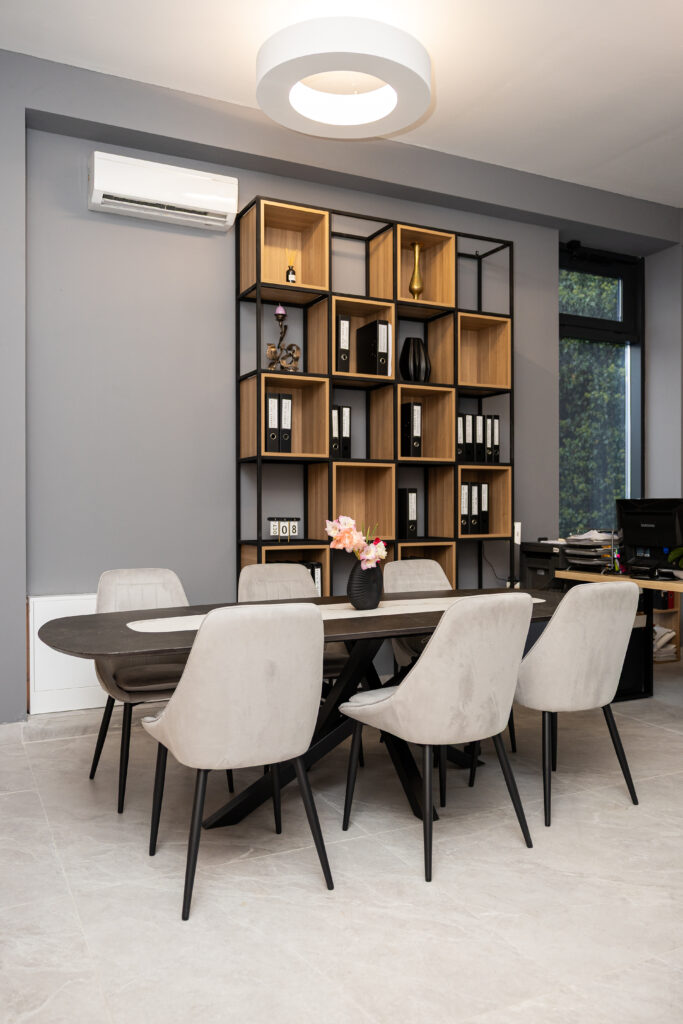 În zona destinată echipei, mobilierul a fost gândit pentru activitate intensivă, dar și pentru un aspect ordonat. Spațiile de depozitare pentru documente și mape sunt integrate discret, cu rafturi deschise și închise, iar poziționarea birourilor a fost adaptată astfel încât să beneficieze de lumină naturală și confort vizual pe parcursul zilei. Totul susține un flux de lucru logic și ușor de gestionat.