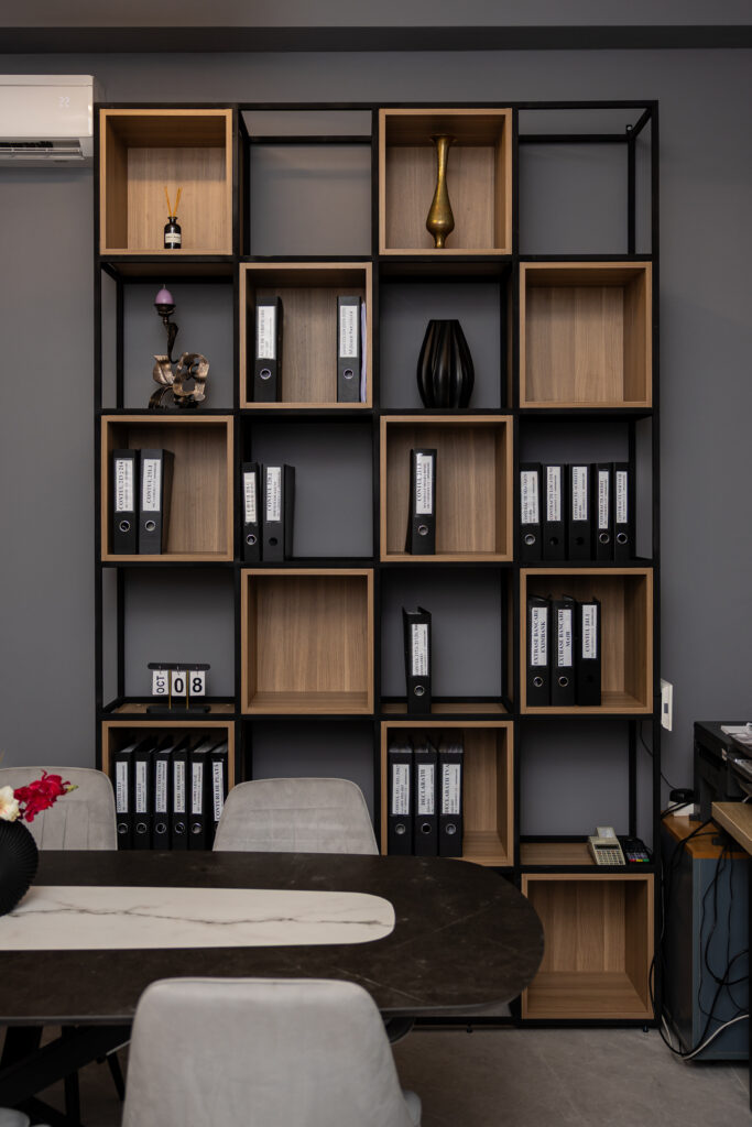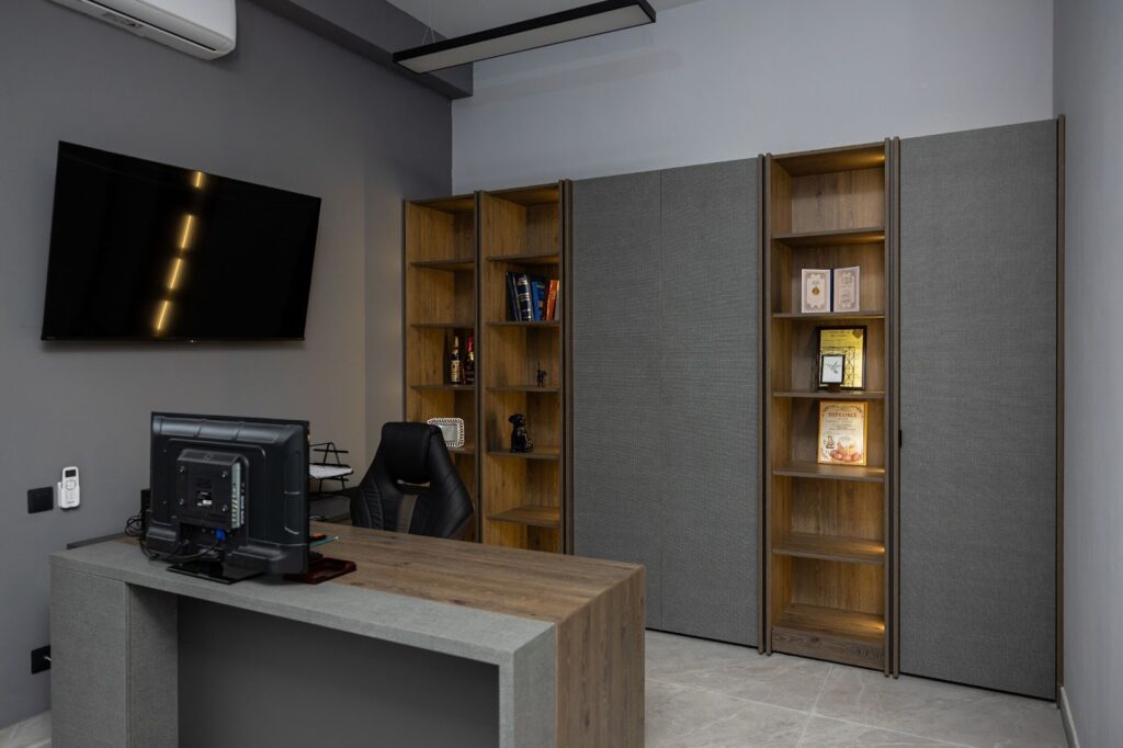 Biroul managerului principal a primit o abordare diferită, mai expresivă. Aici, am ales nuanțe mai profunde, inserții decorative elegante și zone de expunere cu iluminare LED integrată. Biblioteca și spațiile de depozitare creează un echilibru între autoritate și rafinament, conturând un spațiu care inspiră încredere și stabilitate.