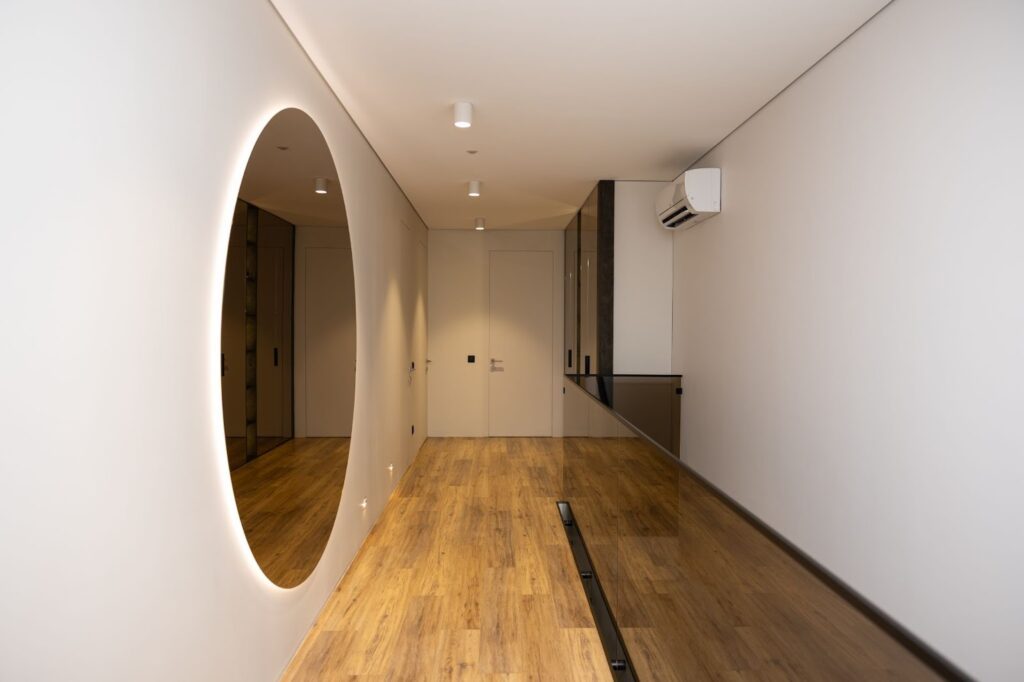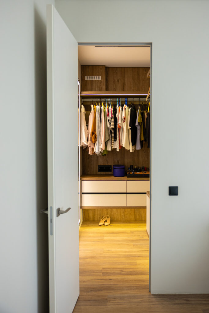 Holul de la etaj nu este doar o zonă de trecere, ci un spațiu funcțional în sine. Aici am integrat un dulap generos pentru depozitarea zilnică a lucrurilor copiilor – pentru a le avea mereu la îndemână și pentru ca dormitoarele să rămână aerisite, fără piese de mobilier suplimentare care aglomerează inutil spațiul. Designul dulapului completează armonios linia estetică a întregii case, păstrând unitatea stilistică a proiectului.