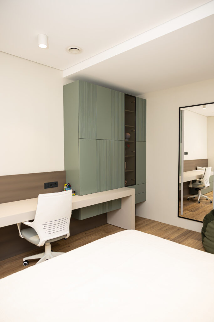 Dormitoarele copiilor au fost mobilate în funcție de vârsta și activitățile fiecăruia, cu spații dedicate pentru somn, studiu și relaxare. Mobilierul este personalizat pentru a se adapta ritmului lor de creștere și vine cu multiple soluții de organizare: rafturi deschise, dulapuri compartimentate, sertare adânci.