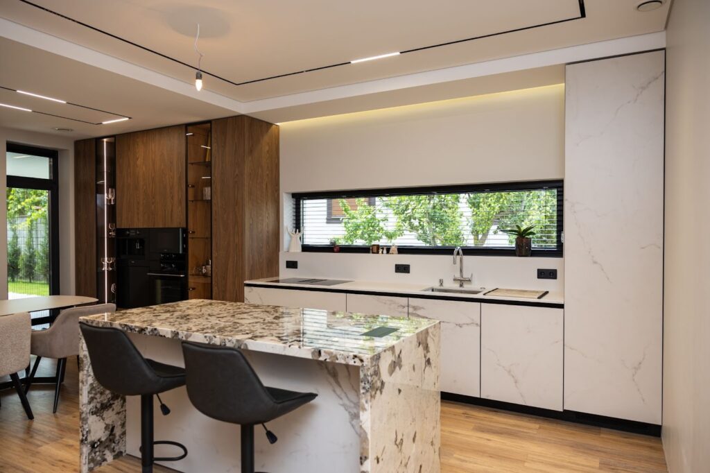La parter, am integrat complet bucătăria și livingul într-un open space elegant, cu mobilă gândită pe verticală și spații de depozitare ascunse, care nu aglomerează vizual. Bucătăria este dotată cu mecanisme de tip servo drive,, sertare cu amortizare soft-close, corpuri cu deschidere lift-up), tocător de resturi alimentare, hotă încorporată în plita cu inducție, precum și compartimentări inteligente pentru veselă, condimente, coșuri de gunoi și electrocasnice. Totul este ușor accesibil, dar perfect organizat.