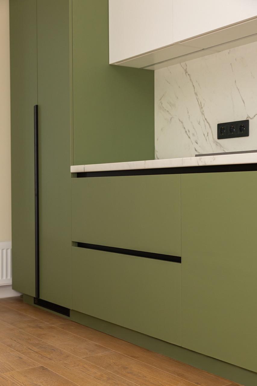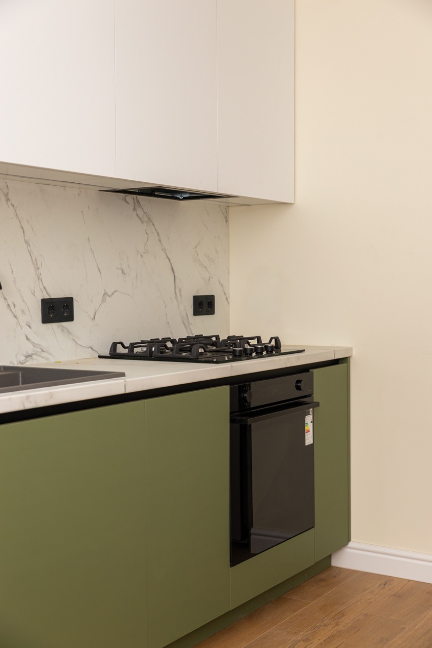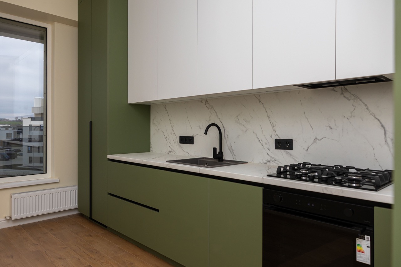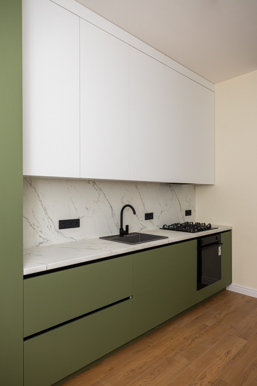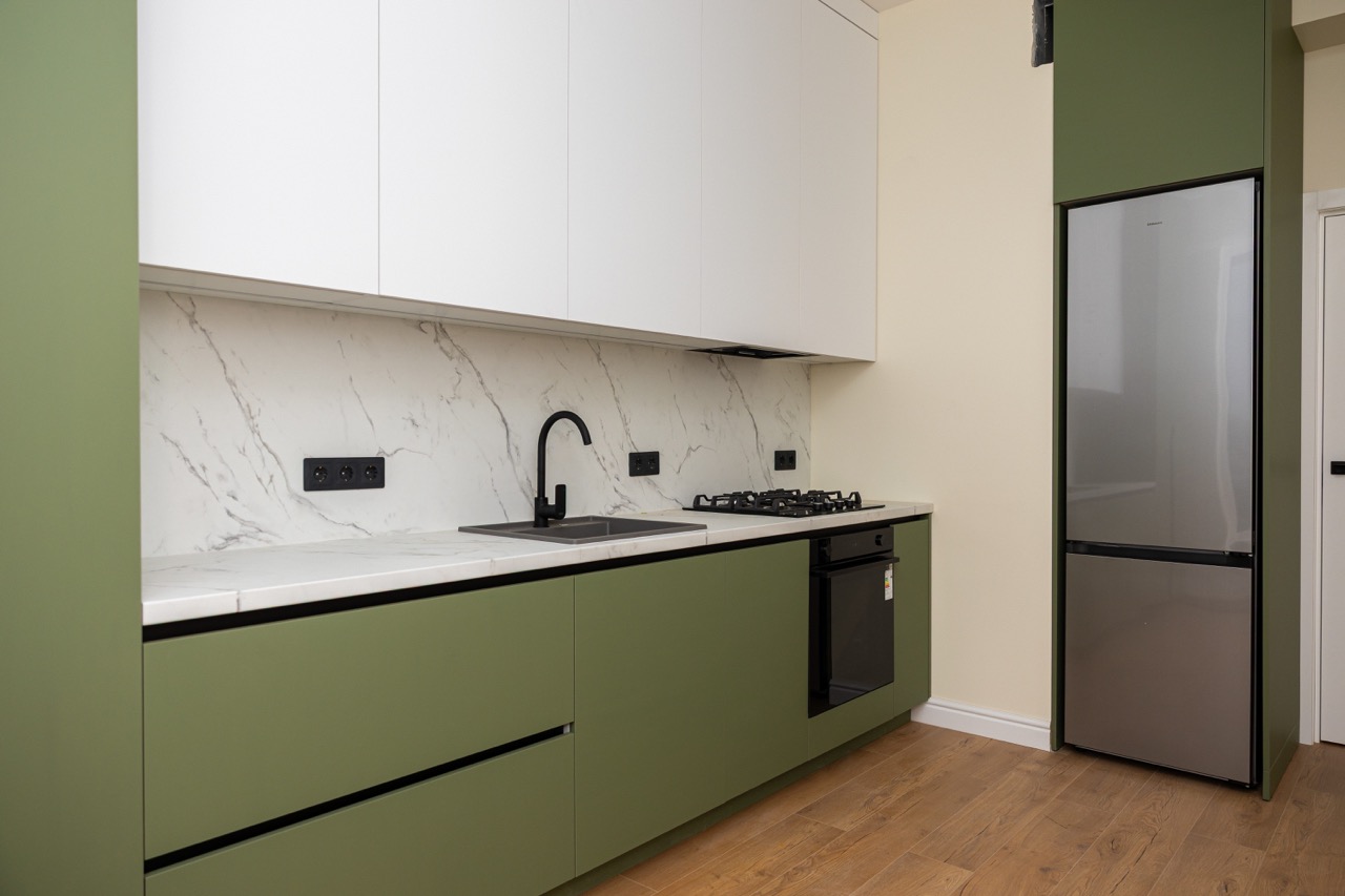 Această bucătărie iese în evidență printr-o abordare diferită, în care culoarea devine elementul principal de design. Fronturile inferioare în nuanță de verde oferă personalitate spațiului, în timp ce corpurile superioare albe păstrează echilibrul vizual și luminozitatea. Contrastul este completat de accentele negre, care adaugă un aer modern și bine definit. Blatul cu aspect de marmură deschisă contribuie la un aspect curat și elegant, dar și practic în utilizare. Iluminarea integrată sub corpurile suspendate pune în valoare zona de lucru și creează o atmosferă plăcută. Totul este organizat simplu și eficient, cu electrocasnice integrate și spații de depozitare bine gândite, astfel încât bucătăria să fie nu doar estetică, ci și foarte ușor de folosit zilnic.
