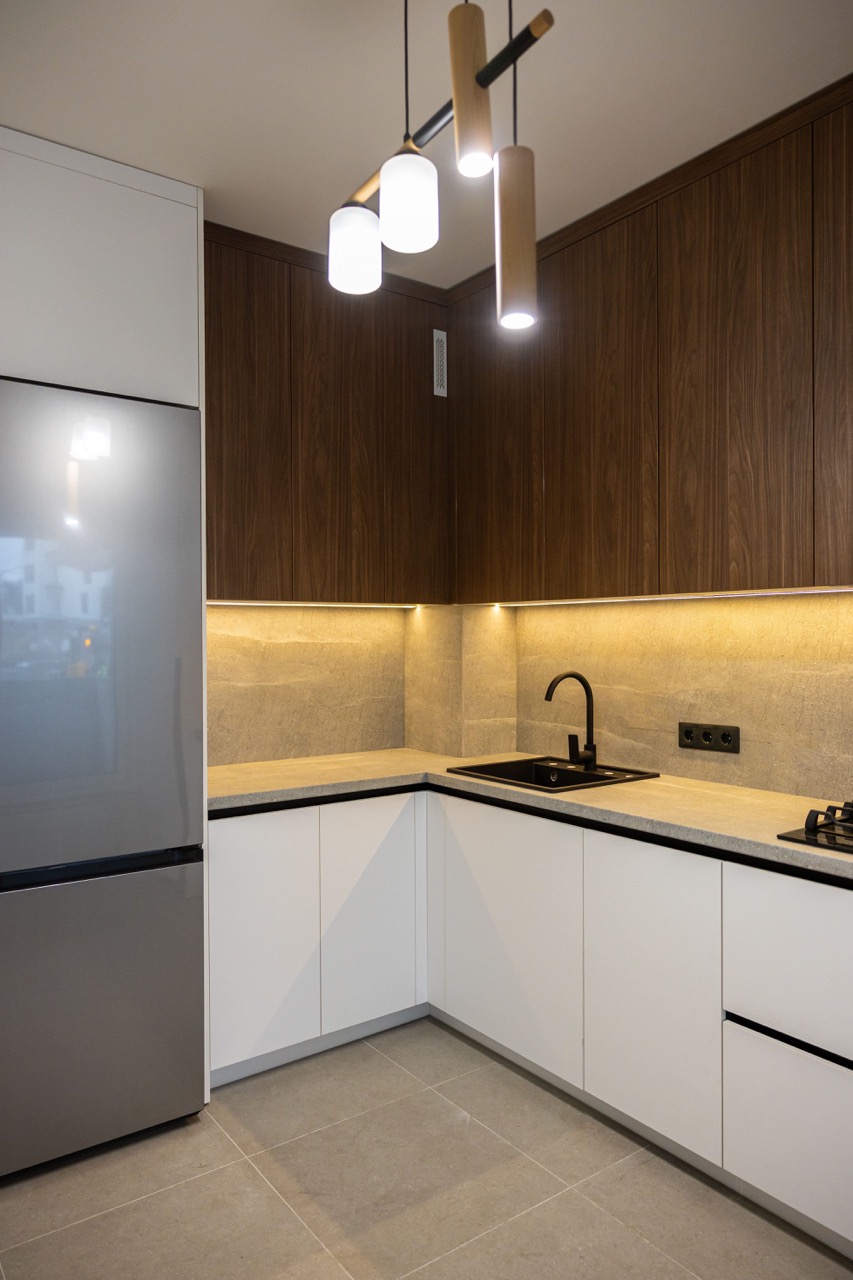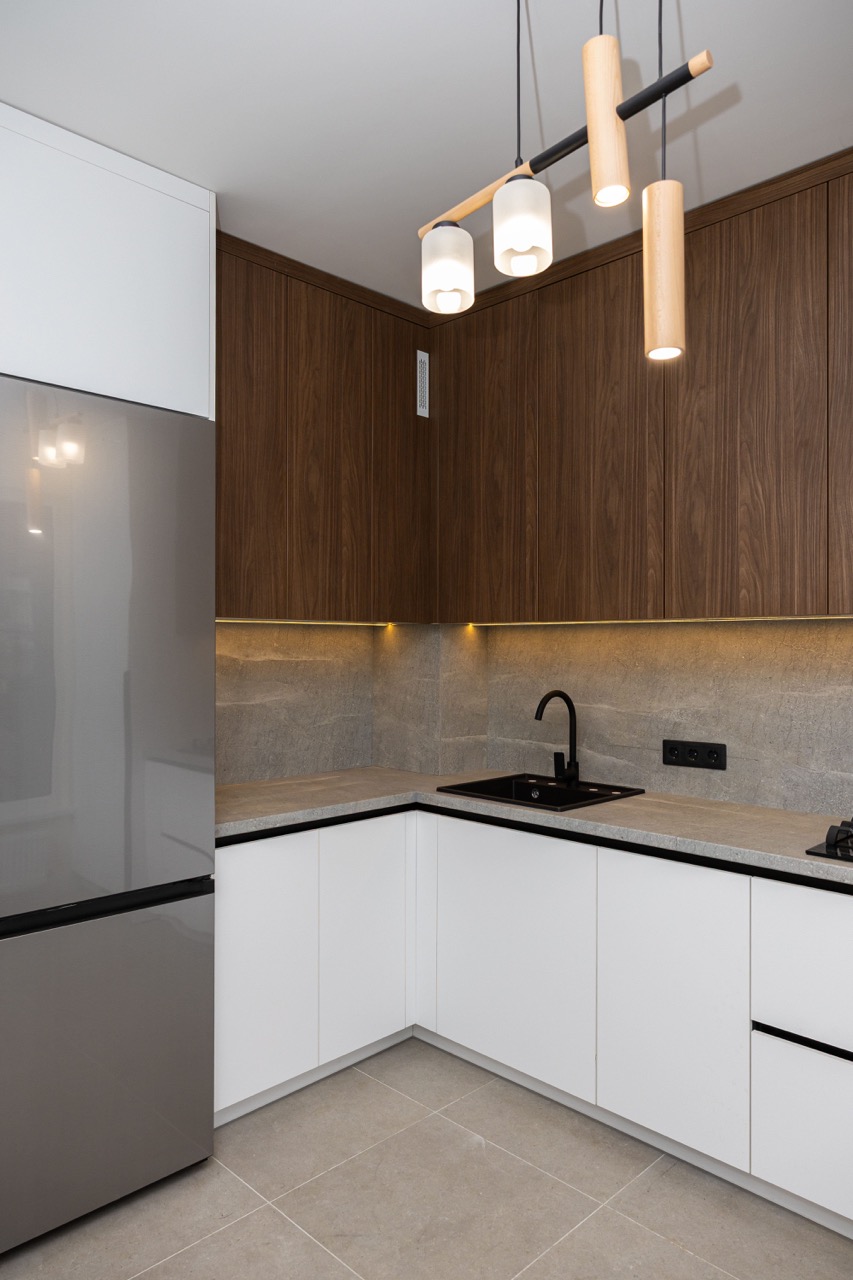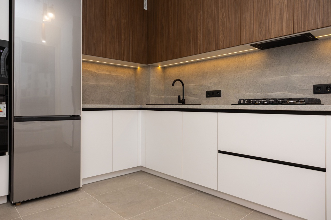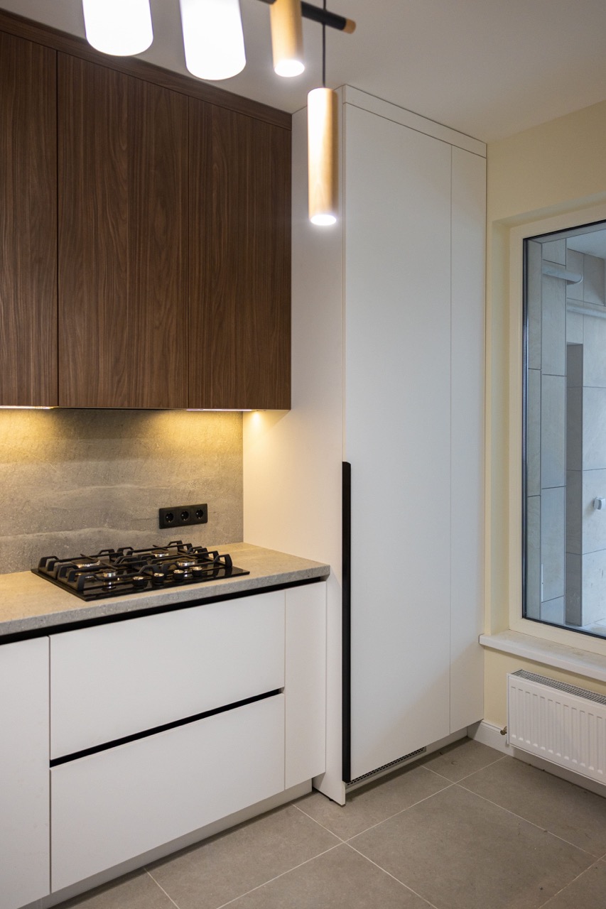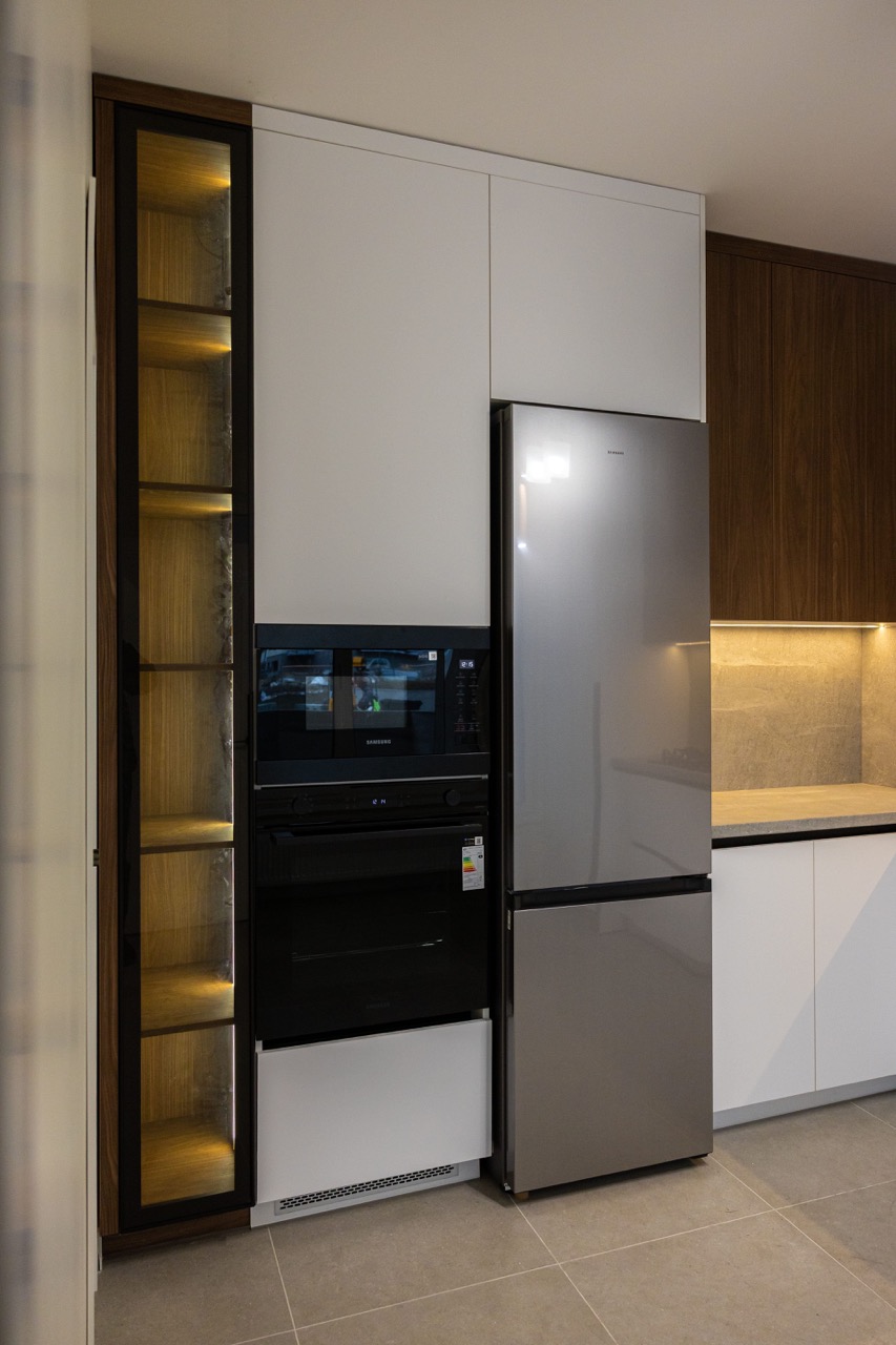 În această bucătărie designul este definit de contrastul dintre fronturile albe, minimaliste, și textura caldă a lemnului, care adaugă profunzime și caracter spațiului. Electrocasnicele sunt complet integrate, iar organizarea este gândită astfel încât fiecare element să fie ușor accesibil și logic poziționat. Zona de lucru este optimizată printr-un blat continuu și un backsplash în tonuri neutre, completate de iluminare LED, care oferă atât vizibilitate, cât și un ambient plăcut. Chiuveta și plita sunt poziționate ergonomic, pentru un flux de lucru eficient.