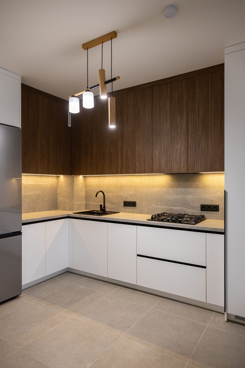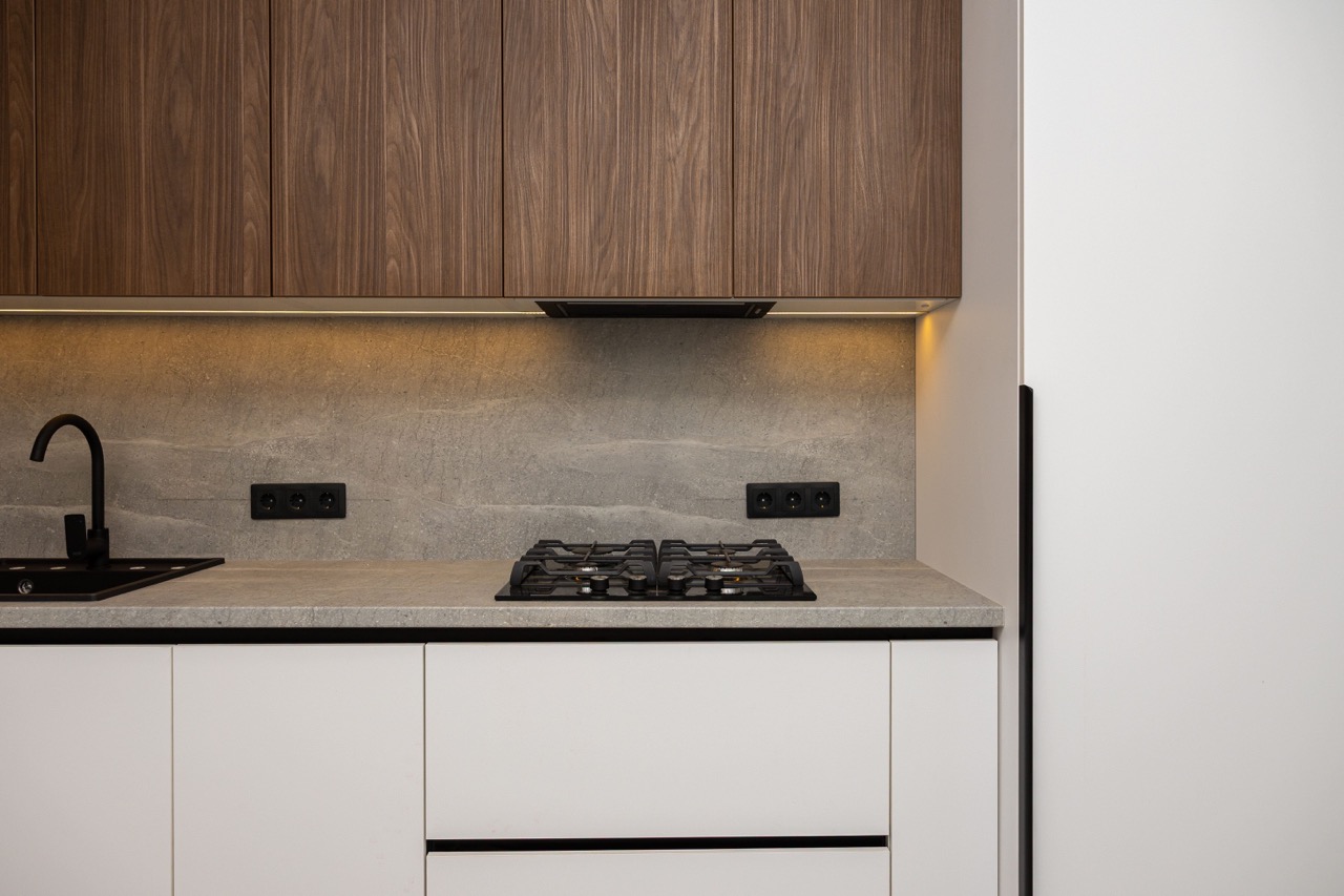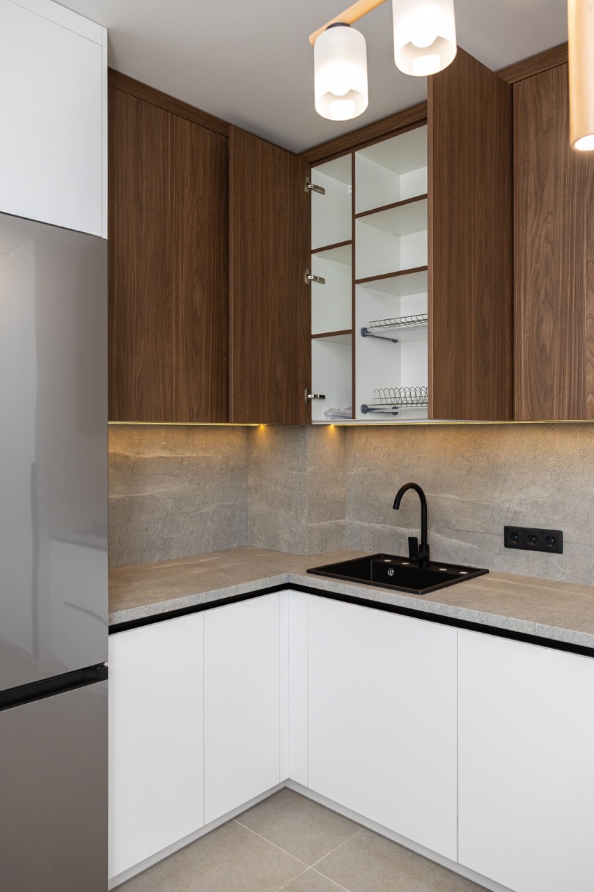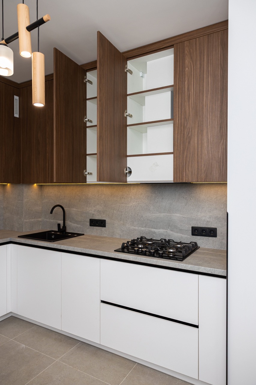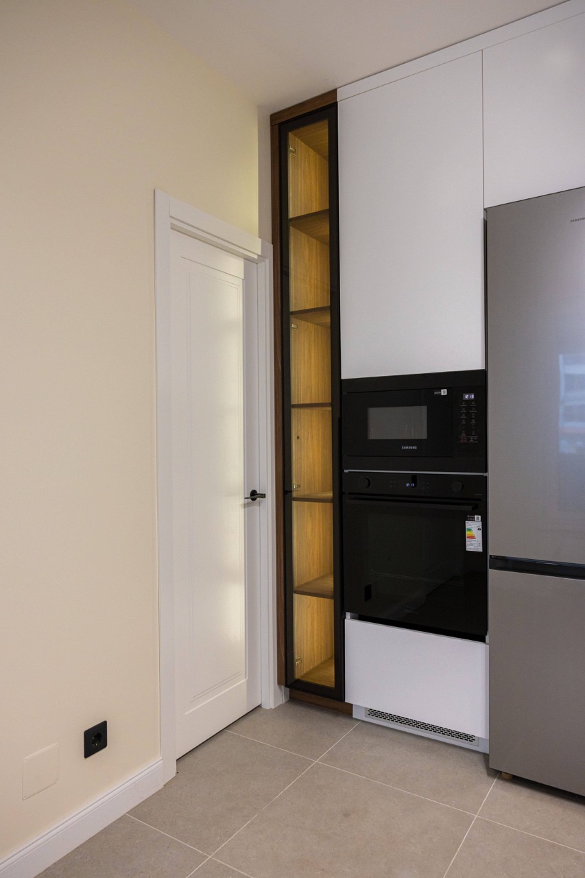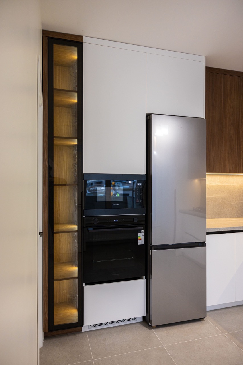 În această bucătărie designul este definit de contrastul dintre fronturile albe, minimaliste, și textura caldă a lemnului, care adaugă profunzime și caracter spațiului. Electrocasnicele sunt complet integrate, iar organizarea este gândită astfel încât fiecare element să fie ușor accesibil și logic poziționat. Zona de lucru este optimizată printr-un blat continuu și un backsplash în tonuri neutre, completate de iluminare LED, care oferă atât vizibilitate, cât și un ambient plăcut. Chiuveta și plita sunt poziționate ergonomic, pentru un flux de lucru eficient.