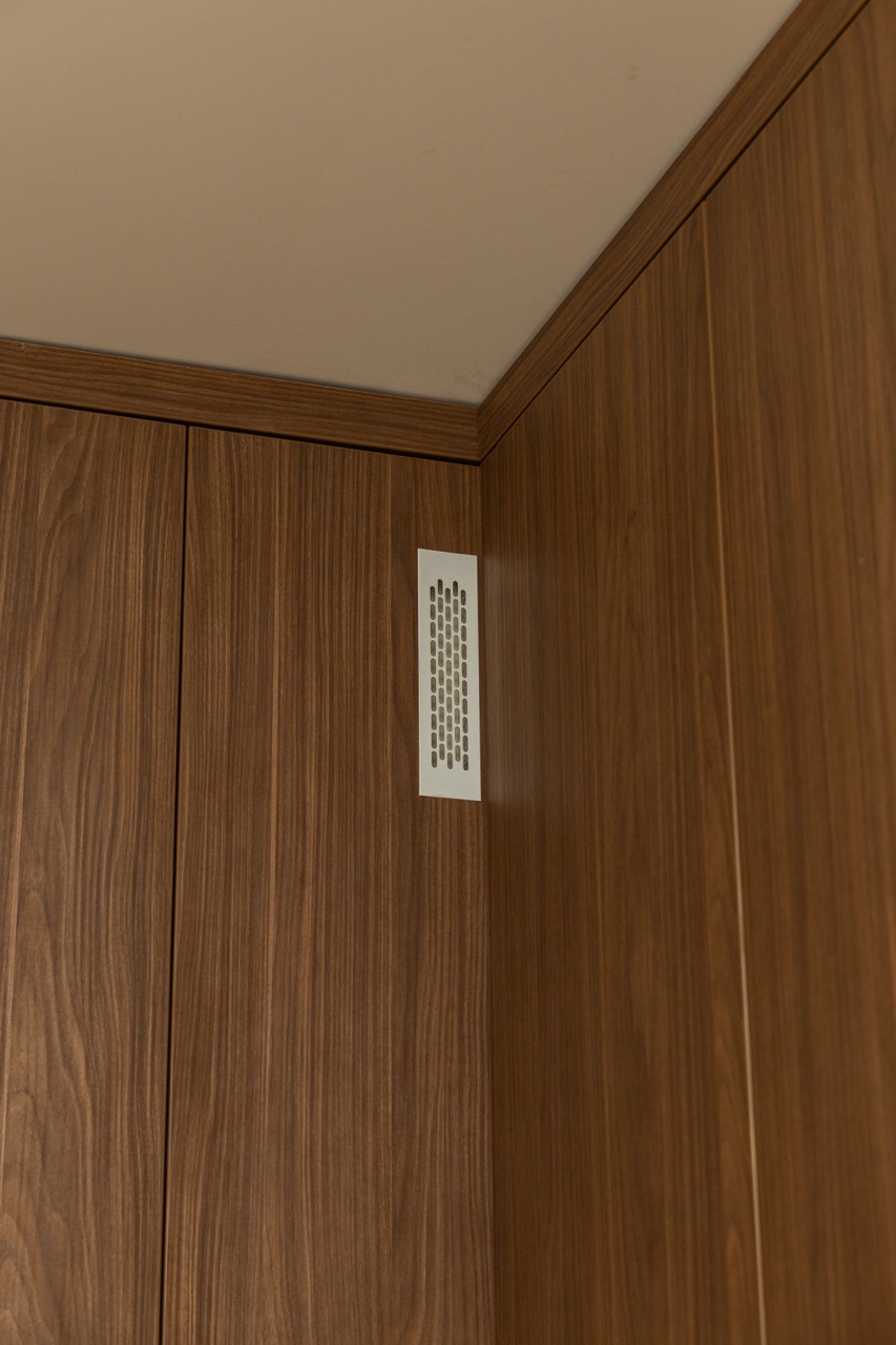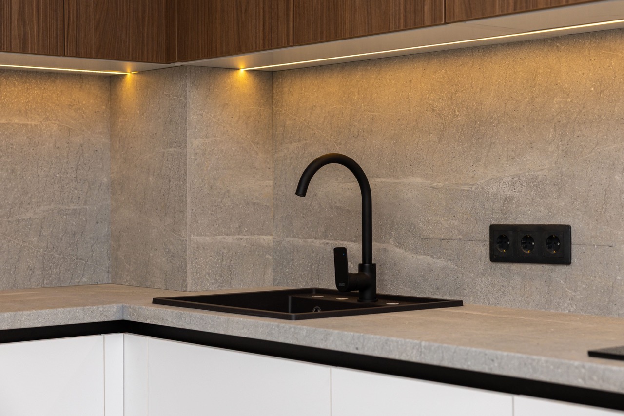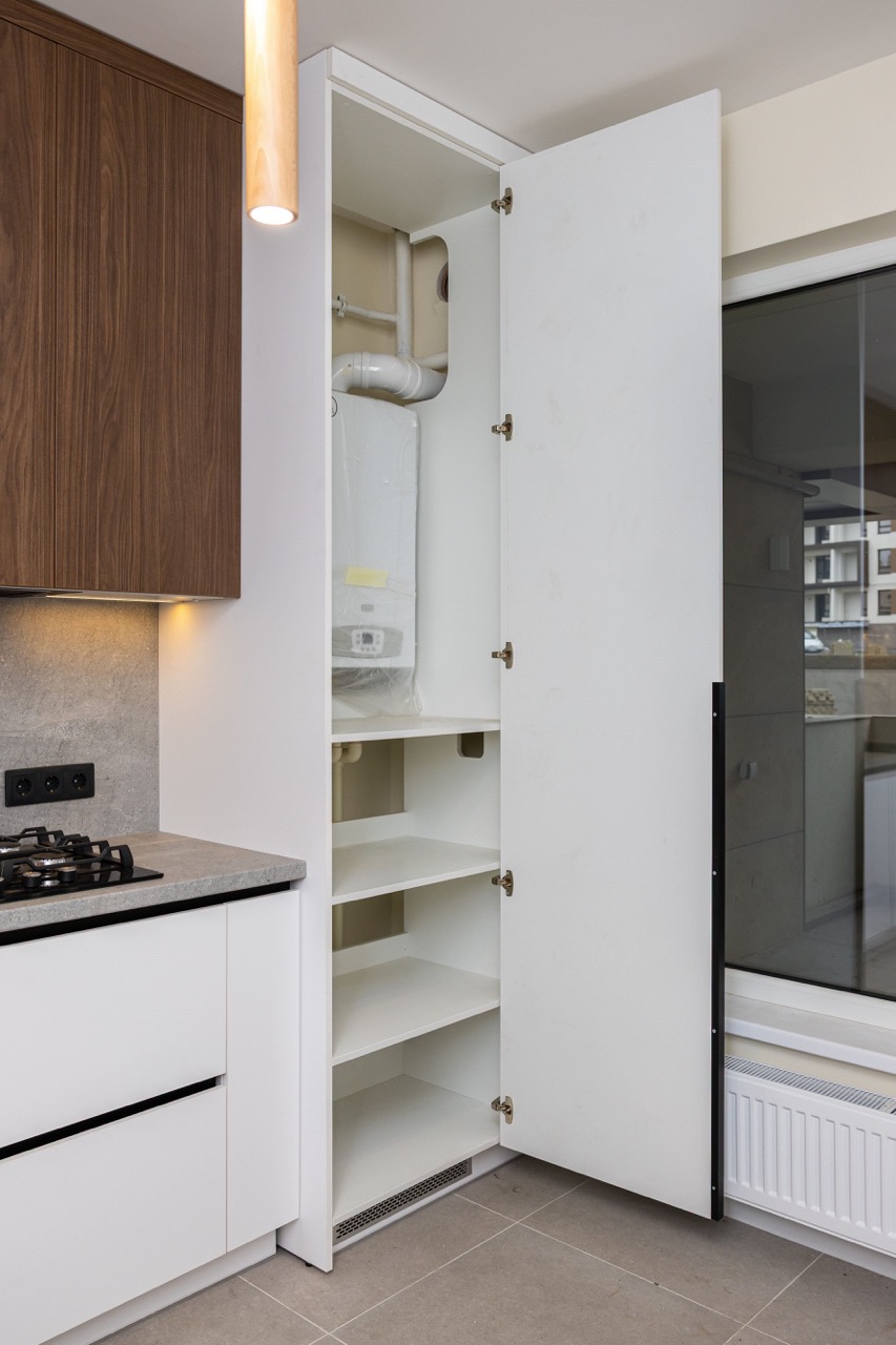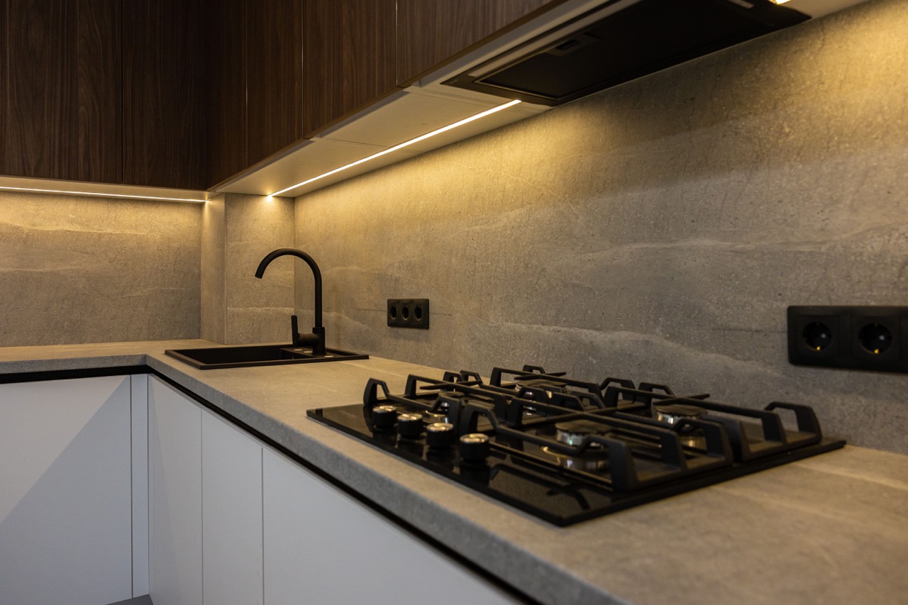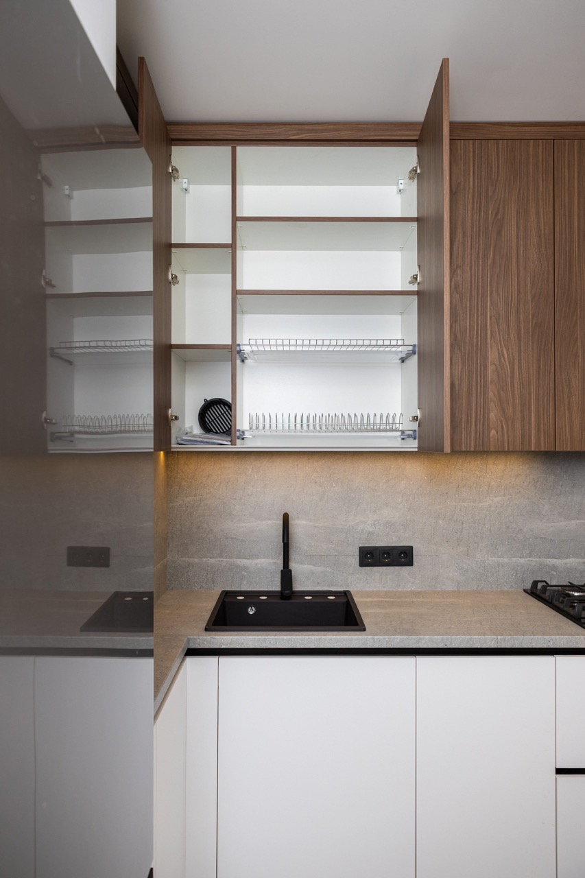 În această bucătărie designul este definit de contrastul dintre fronturile albe, minimaliste, și textura caldă a lemnului, care adaugă profunzime și caracter spațiului. Electrocasnicele sunt complet integrate, iar organizarea este gândită astfel încât fiecare element să fie ușor accesibil și logic poziționat. Zona de lucru este optimizată printr-un blat continuu și un backsplash în tonuri neutre, completate de iluminare LED, care oferă atât vizibilitate, cât și un ambient plăcut. Chiuveta și plita sunt poziționate ergonomic, pentru un flux de lucru eficient.