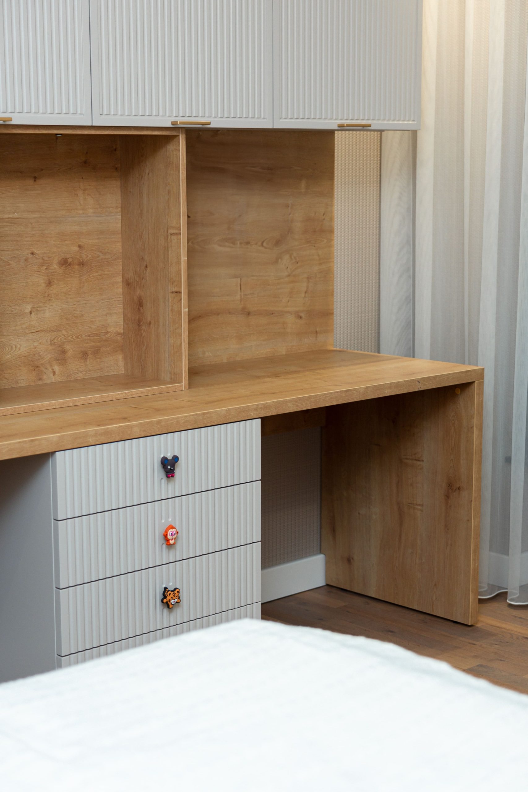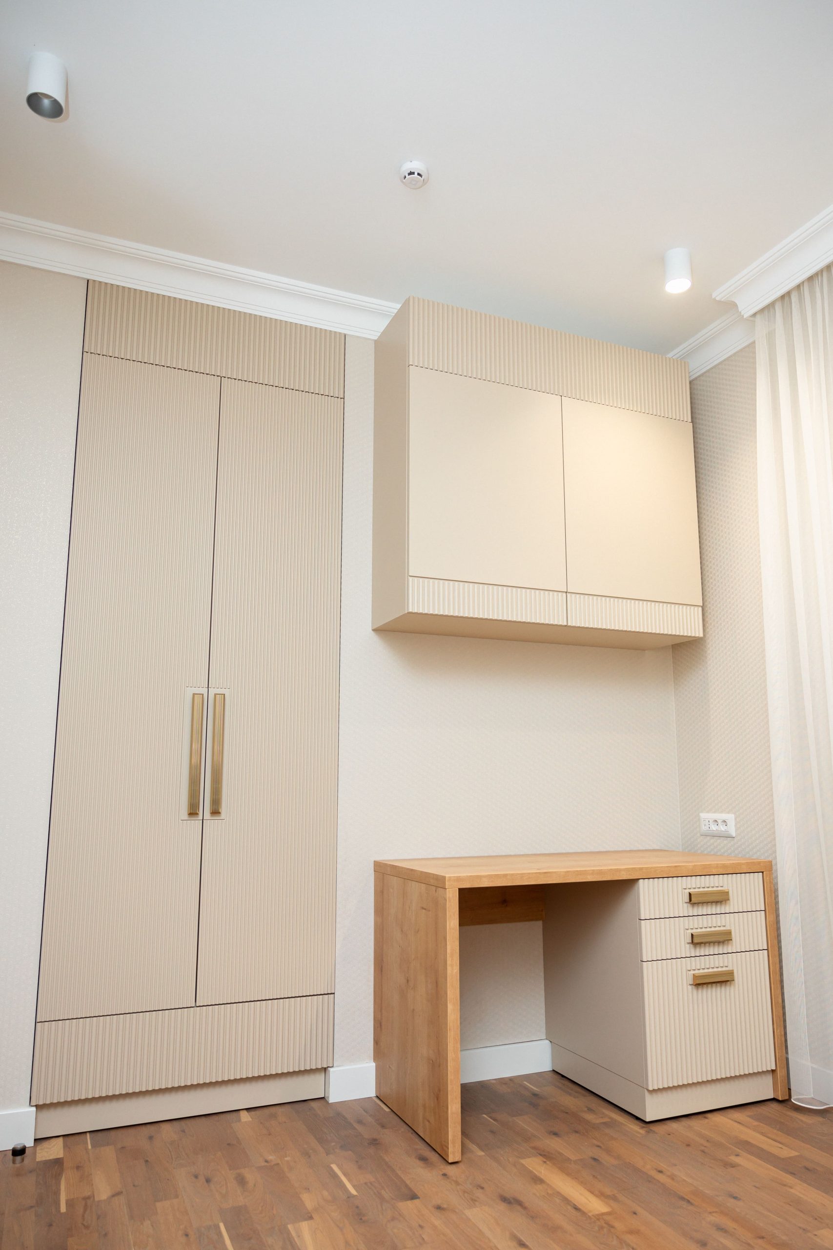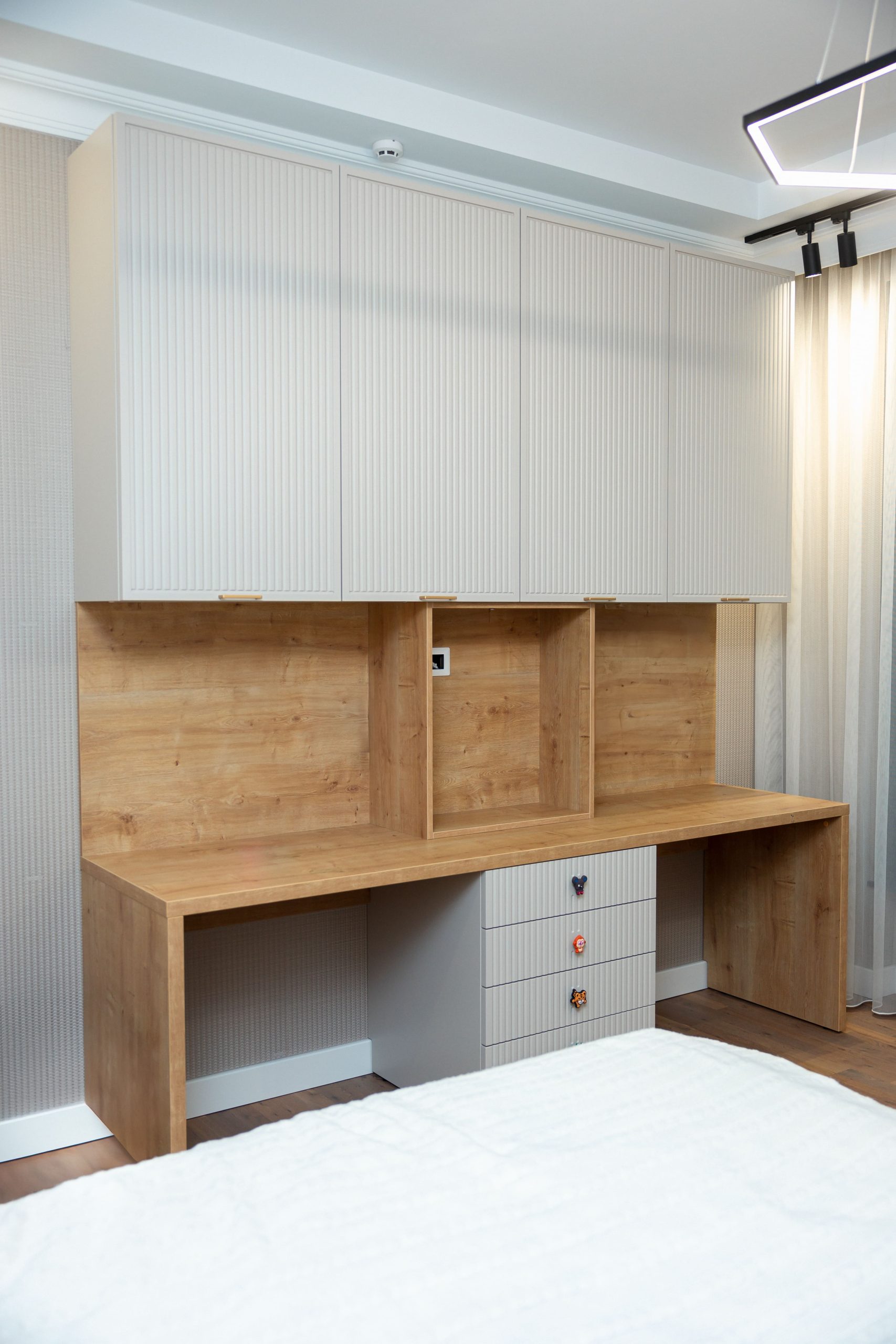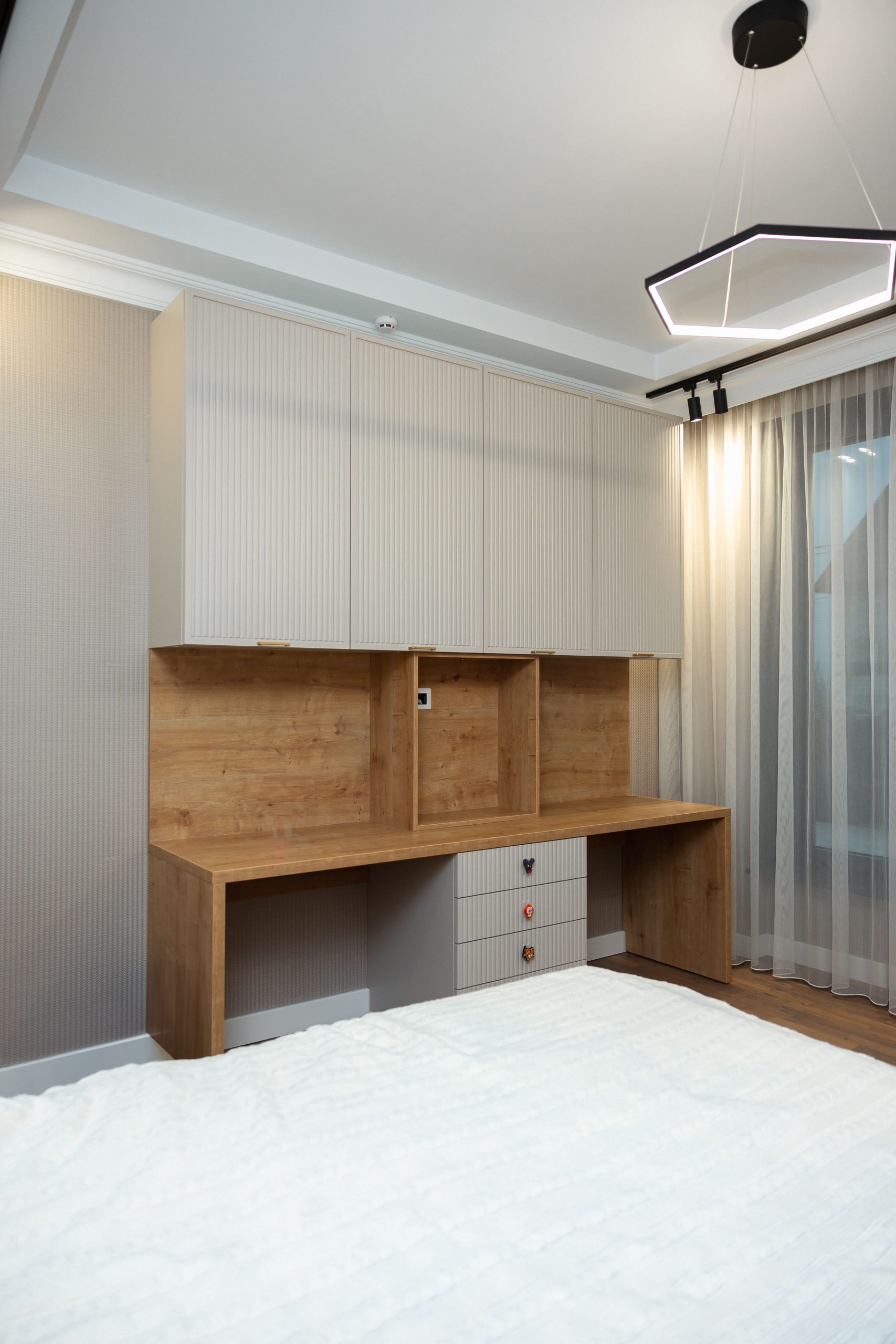 În acest proiect am dotat cu mobilier 2 dormitoare, care se evidențiază printr-un design elegant și bine echilibrat. Paleta cromatică caldă, combinată cu texturile din lemn și fronturile riflate, creează un ambient relaxant și modern. Zona de depozitare este inteligent integrată prin dulapuri spațioase și corpuri suspendate, care păstrează un aspect aerisit și organizat. Biroul minimalist, realizat din aceleași materiale, oferă un spațiu practic de lucru, fără a încărca vizual încăperea. Detaliile fac diferența: mânerele metalice elegante, liniile curate și finisajele premium adaugă rafinament întregului concept. În același timp, compartimentarea eficientă permite utilizarea optimă a spațiului disponibil.