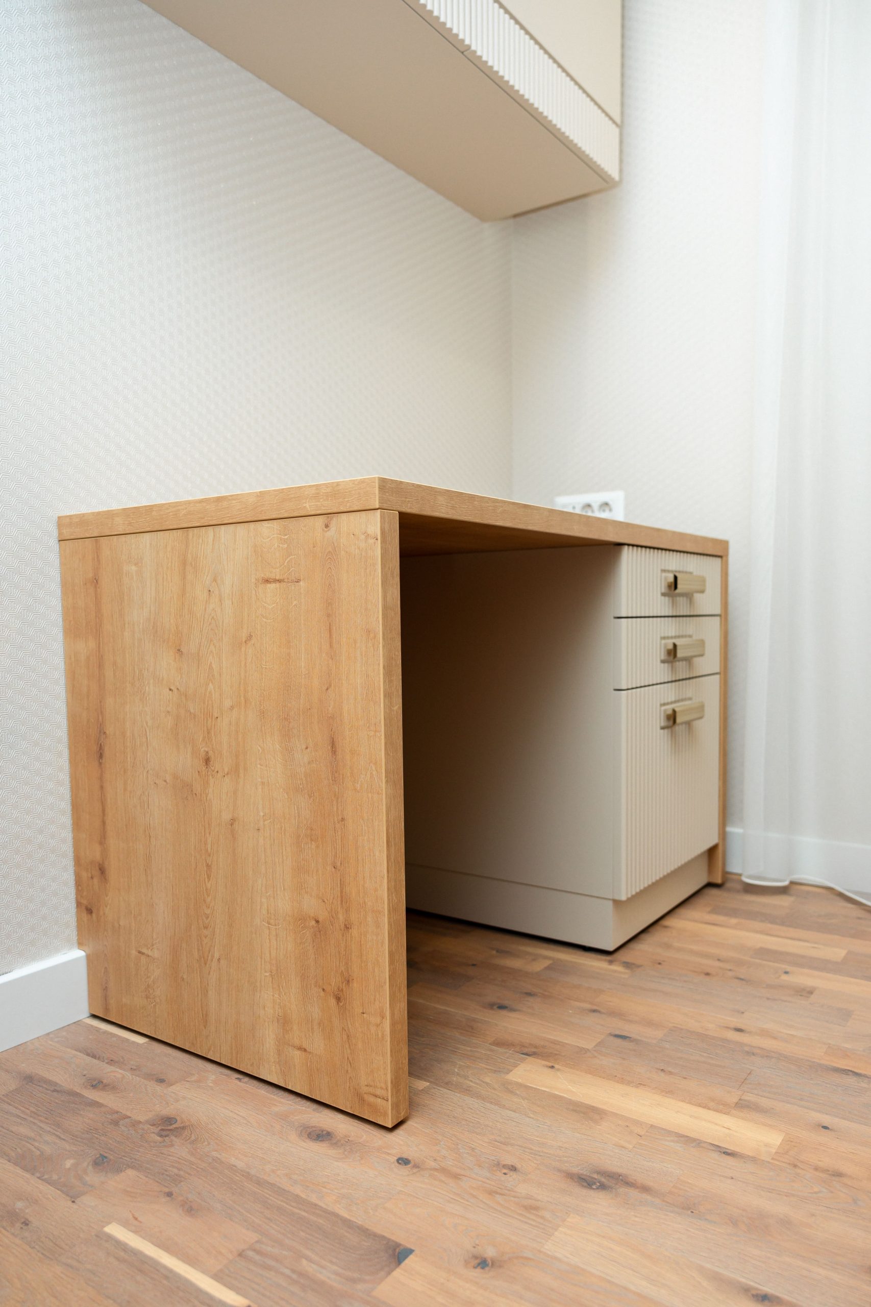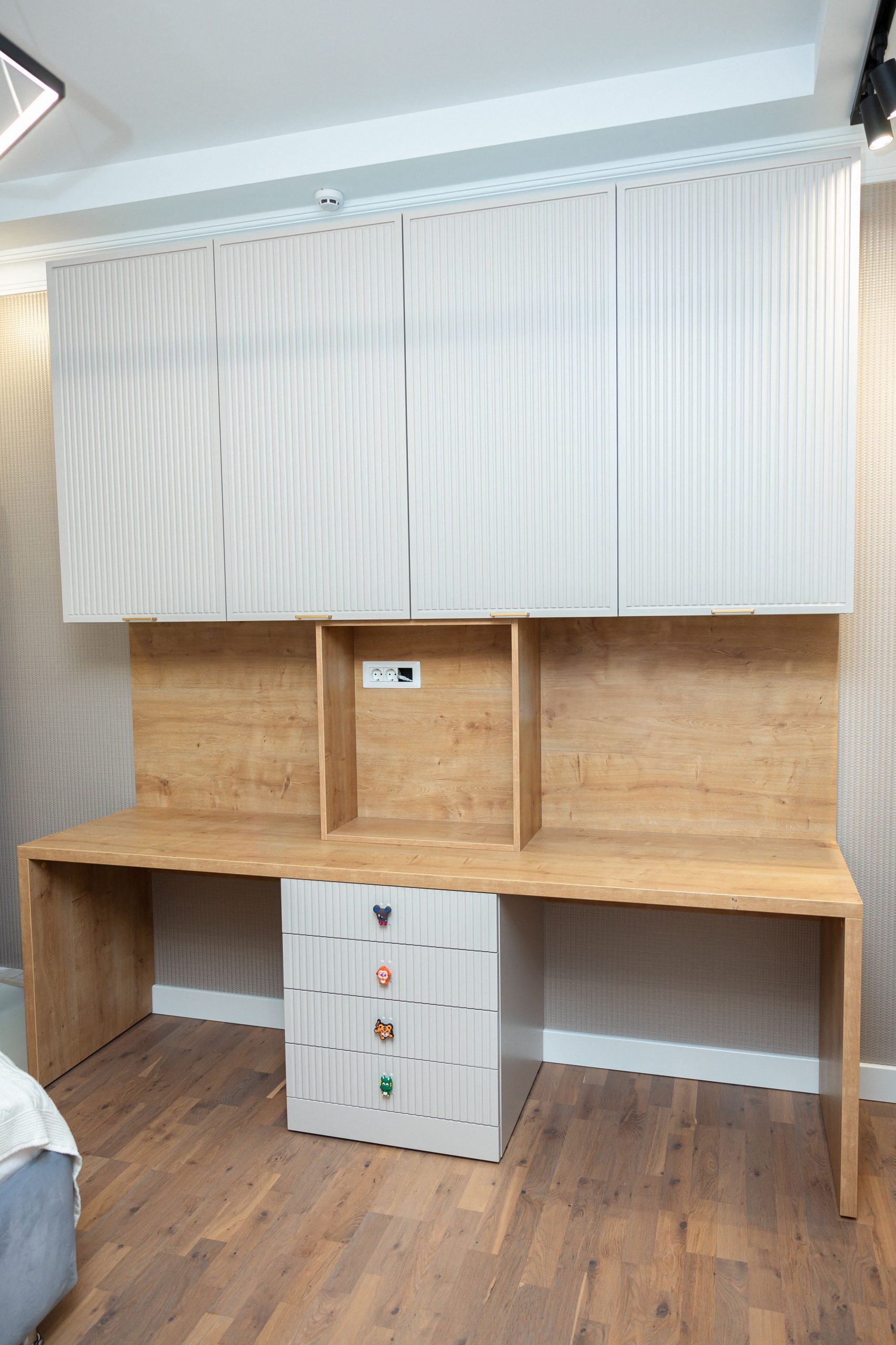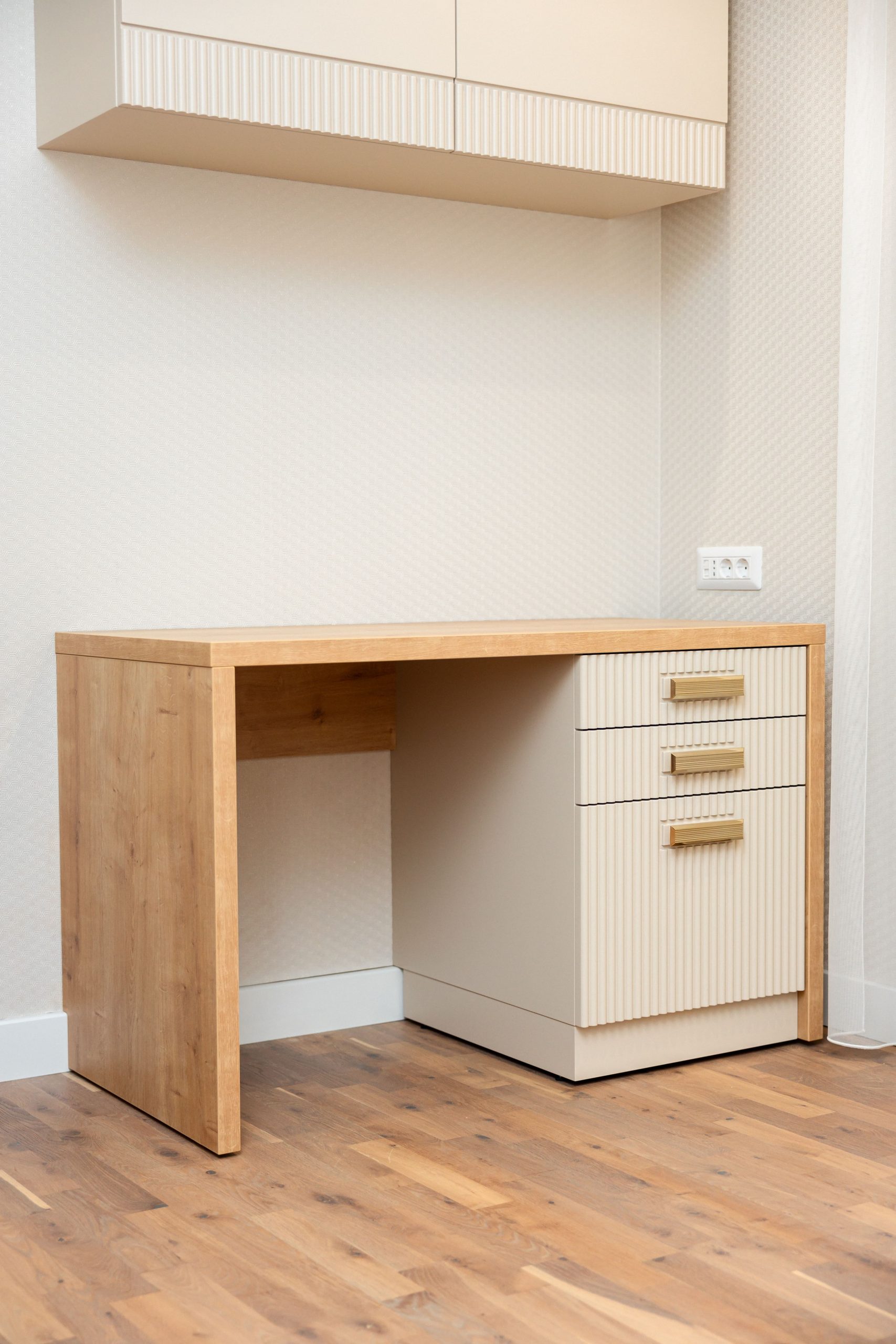 În acest proiect am dotat cu mobilier 2 dormitoare, care se evidențiază printr-un design elegant și bine echilibrat. Paleta cromatică caldă, combinată cu texturile din lemn și fronturile riflate, creează un ambient relaxant și modern. Zona de depozitare este inteligent integrată prin dulapuri spațioase și corpuri suspendate, care păstrează un aspect aerisit și organizat. Biroul minimalist, realizat din aceleași materiale, oferă un spațiu practic de lucru, fără a încărca vizual încăperea. Detaliile fac diferența: mânerele metalice elegante, liniile curate și finisajele premium adaugă rafinament întregului concept. În același timp, compartimentarea eficientă permite utilizarea optimă a spațiului disponibil.