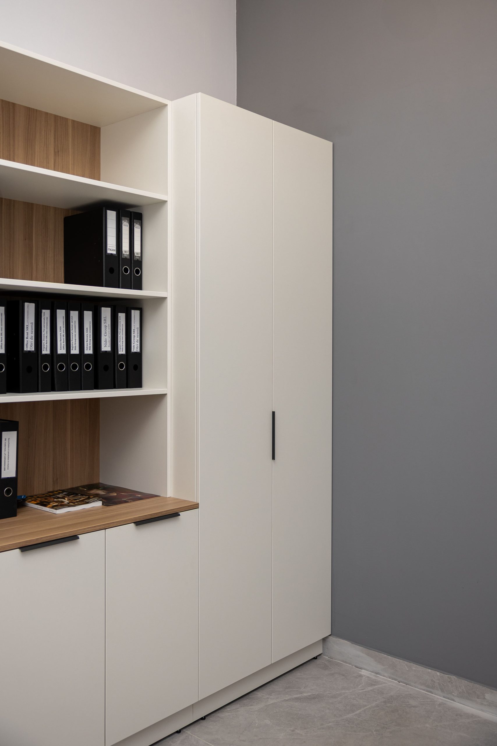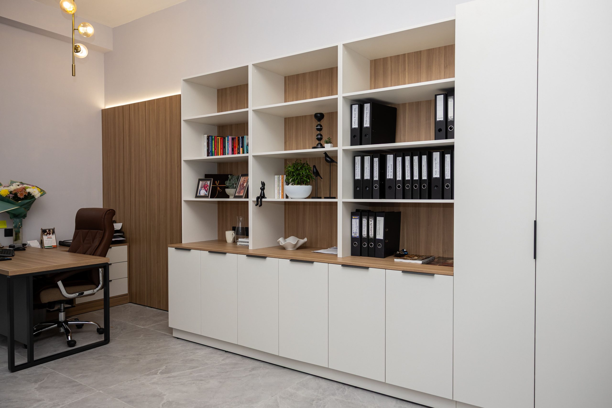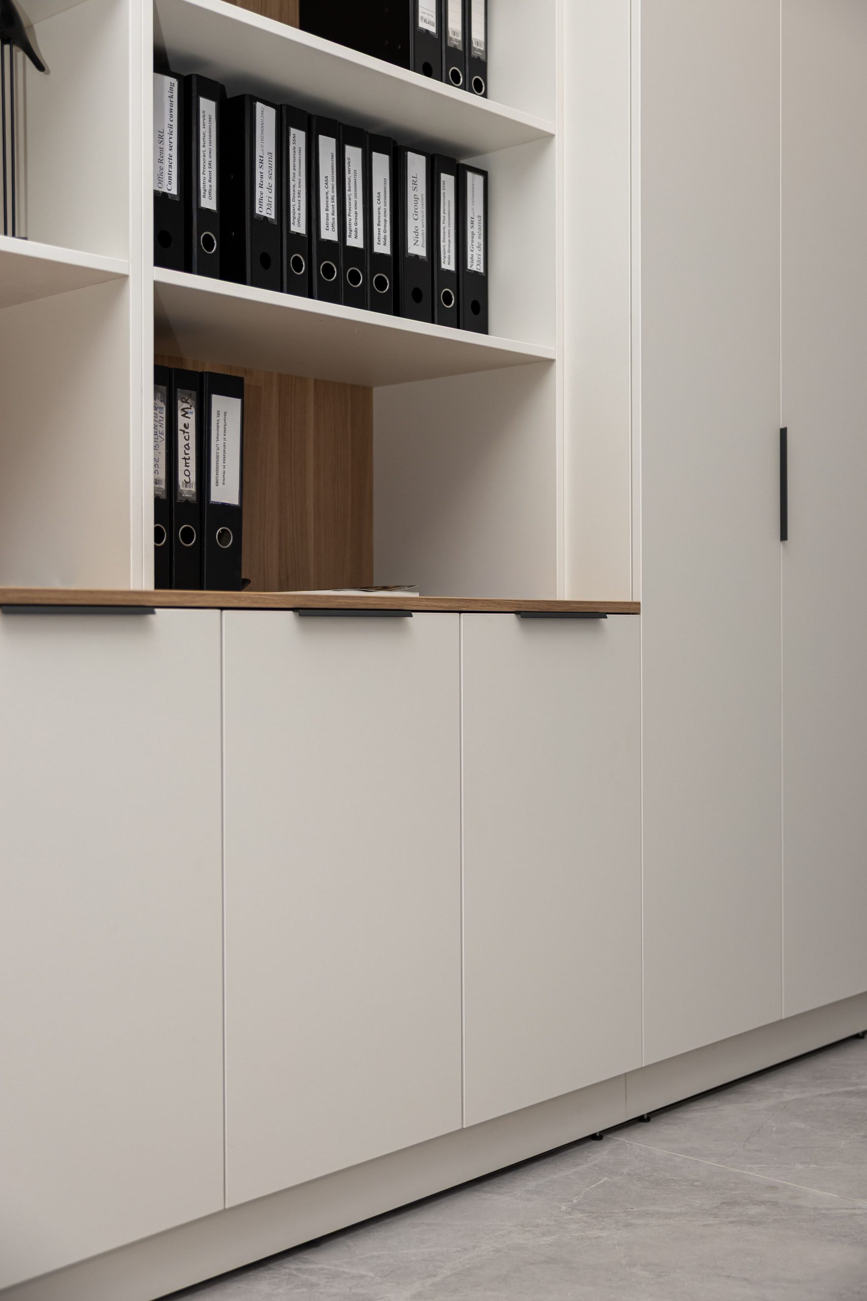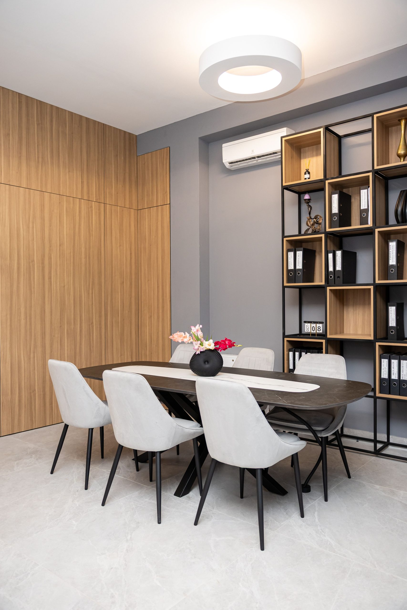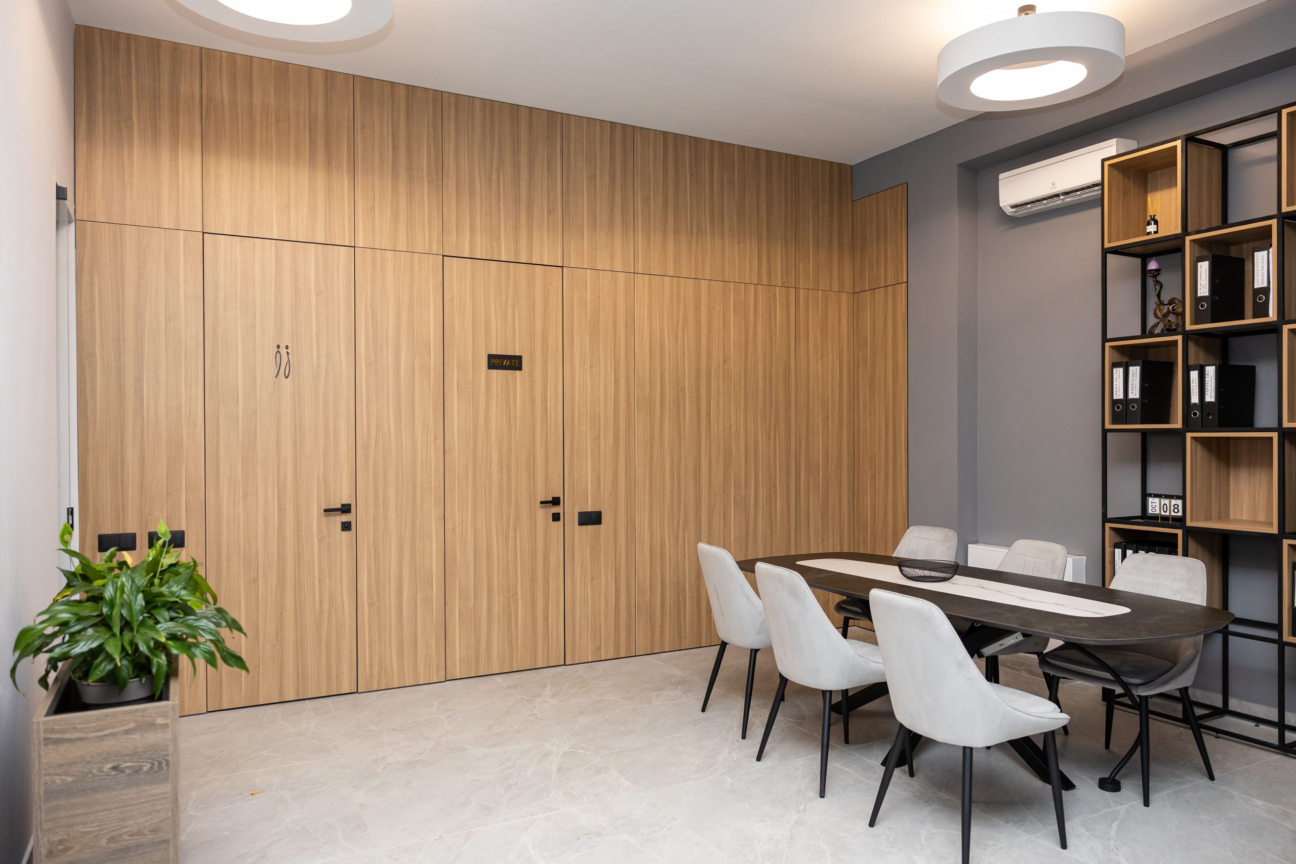 Acest proiect de birou a fost gândit ca un spațiu coerent, în care designul și funcționalitatea lucrează împreună în fiecare detaliu. Elementul central este peretele placat integral cu PAL, finisat cu canturi negre, care creează un efect vizual elegant prin liniile verticale continue. În acest perete sunt integrate două uși filomuro, complet mascate — una duce spre bucătărie, iar cealaltă spre baie. Astfel, spațiile tehnice devin invizibile și nu întrerup estetica generală a încăperii. Am continuat amenajarea cu mobilier personalizat pentru zona de lucru, inclusiv birouri ergonomice poziționate lângă lumină naturală, dar și soluții de depozitare adaptate nevoilor echipei. Sala de ședințe este completată de o masă spațioasă și un sistem de rafturi deschise, care combină funcționalitatea cu un design modern. Întregul proiect este un exemplu clar de optimizare a spațiului, în care fiecare zonă – de la birouri, până la bucătărie și baie – este integrată într-un concept unitar și bine echilibrat.
