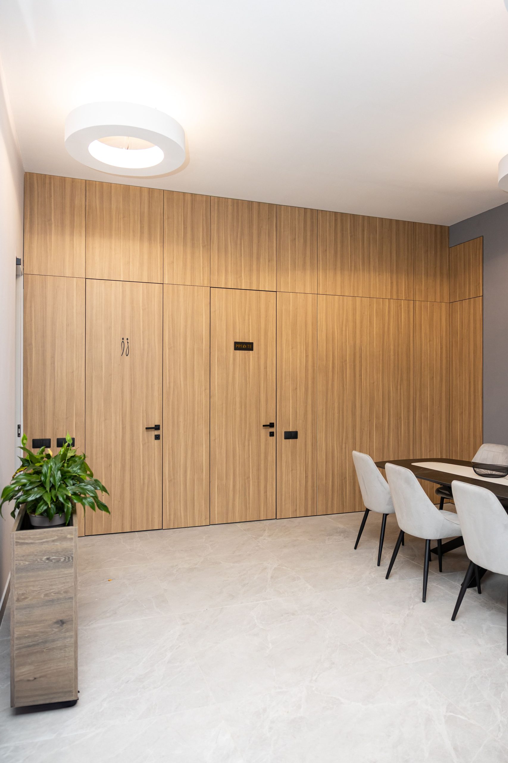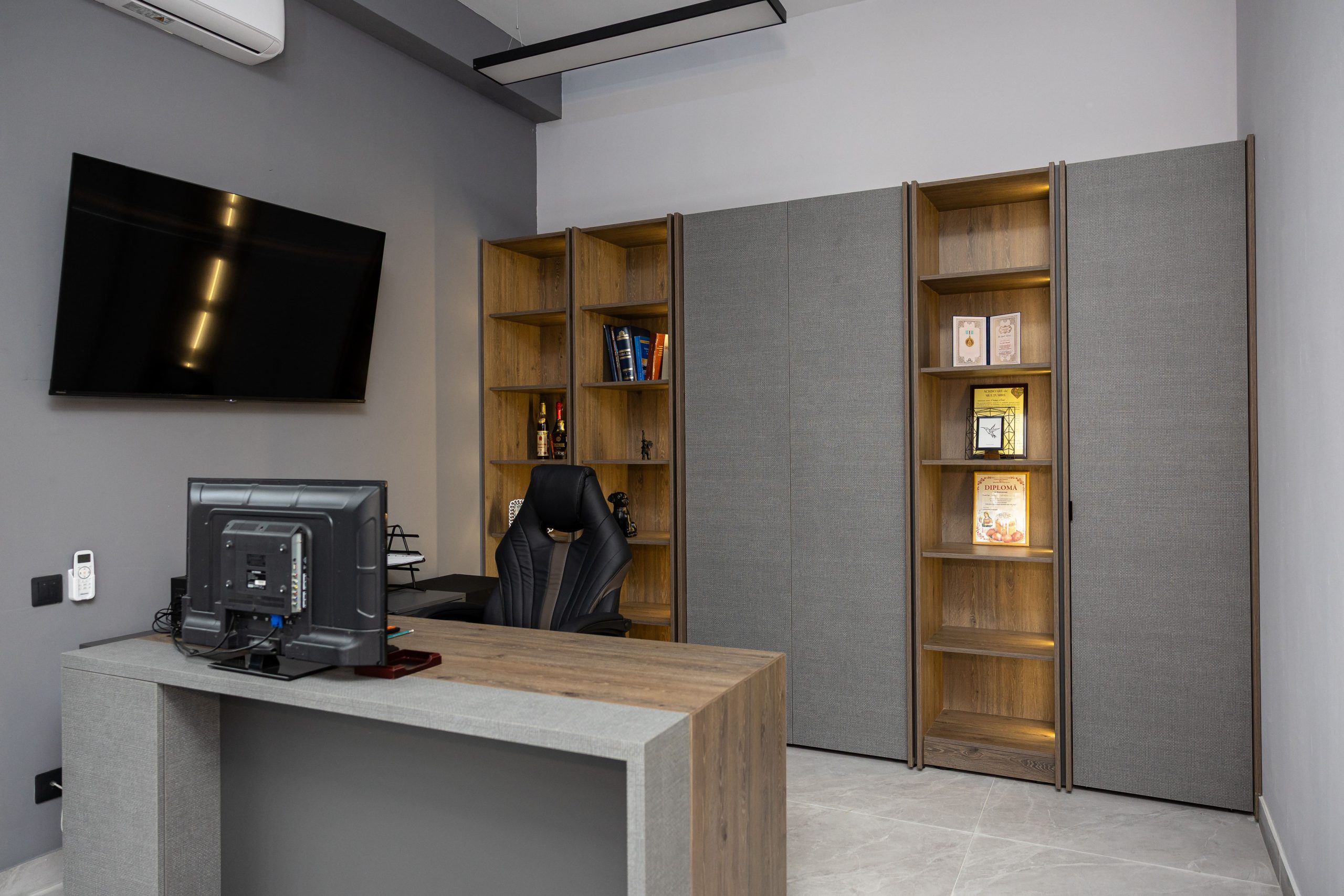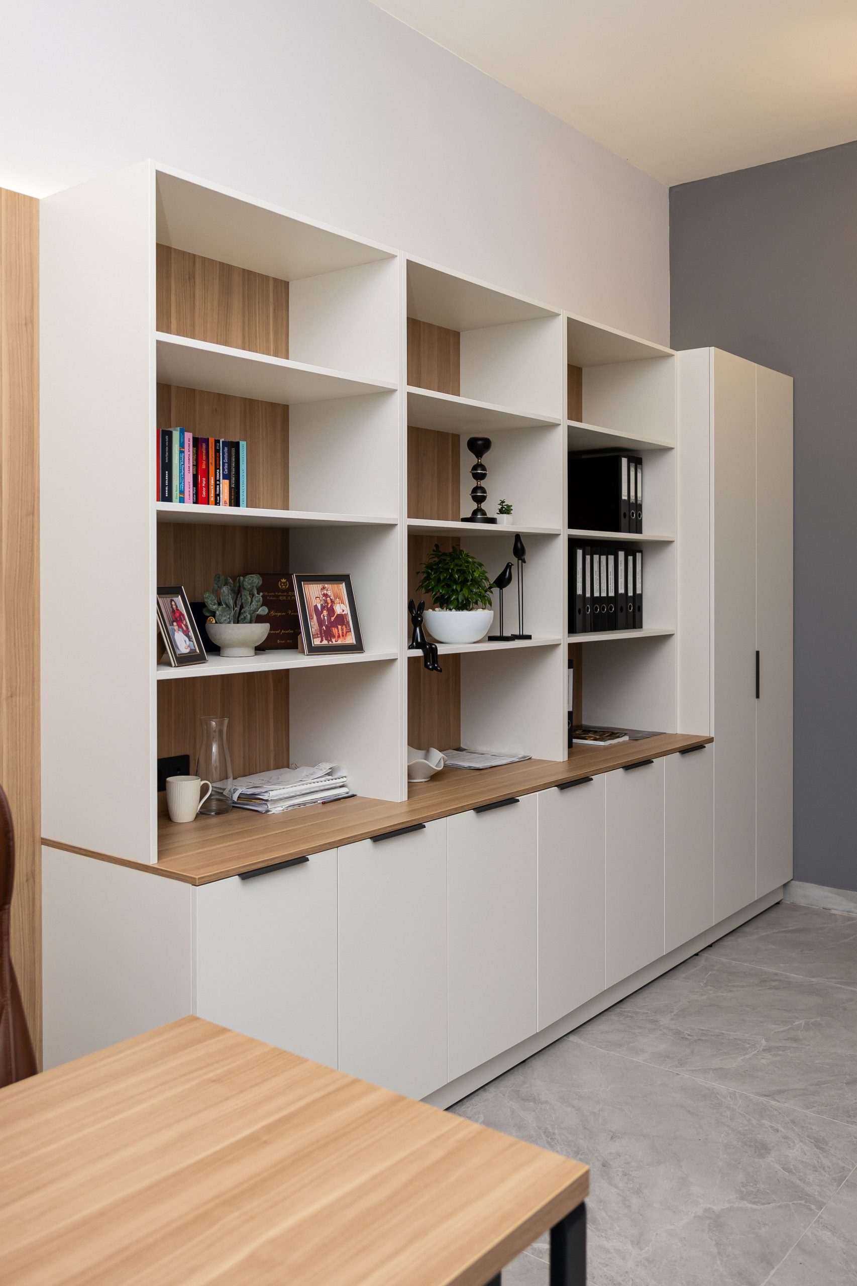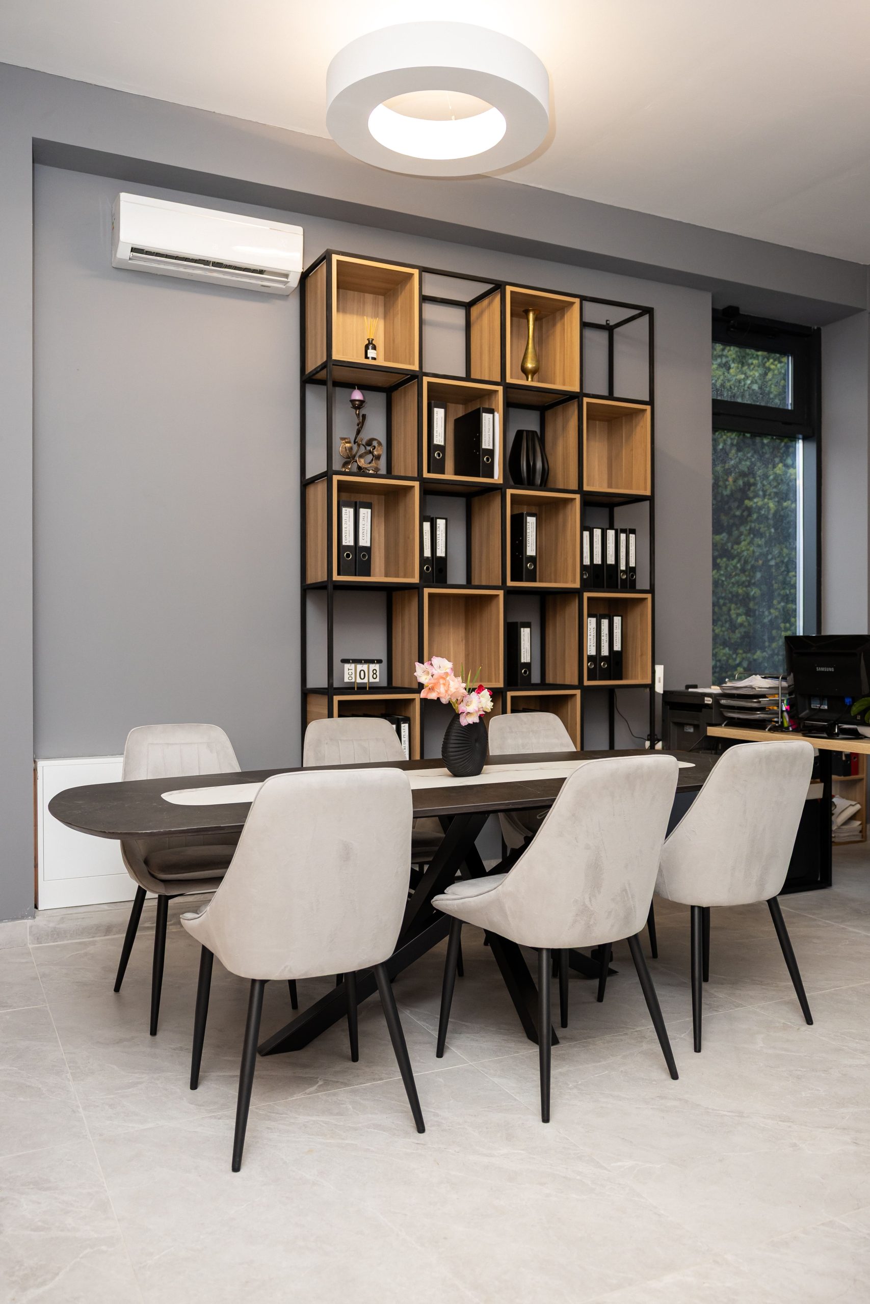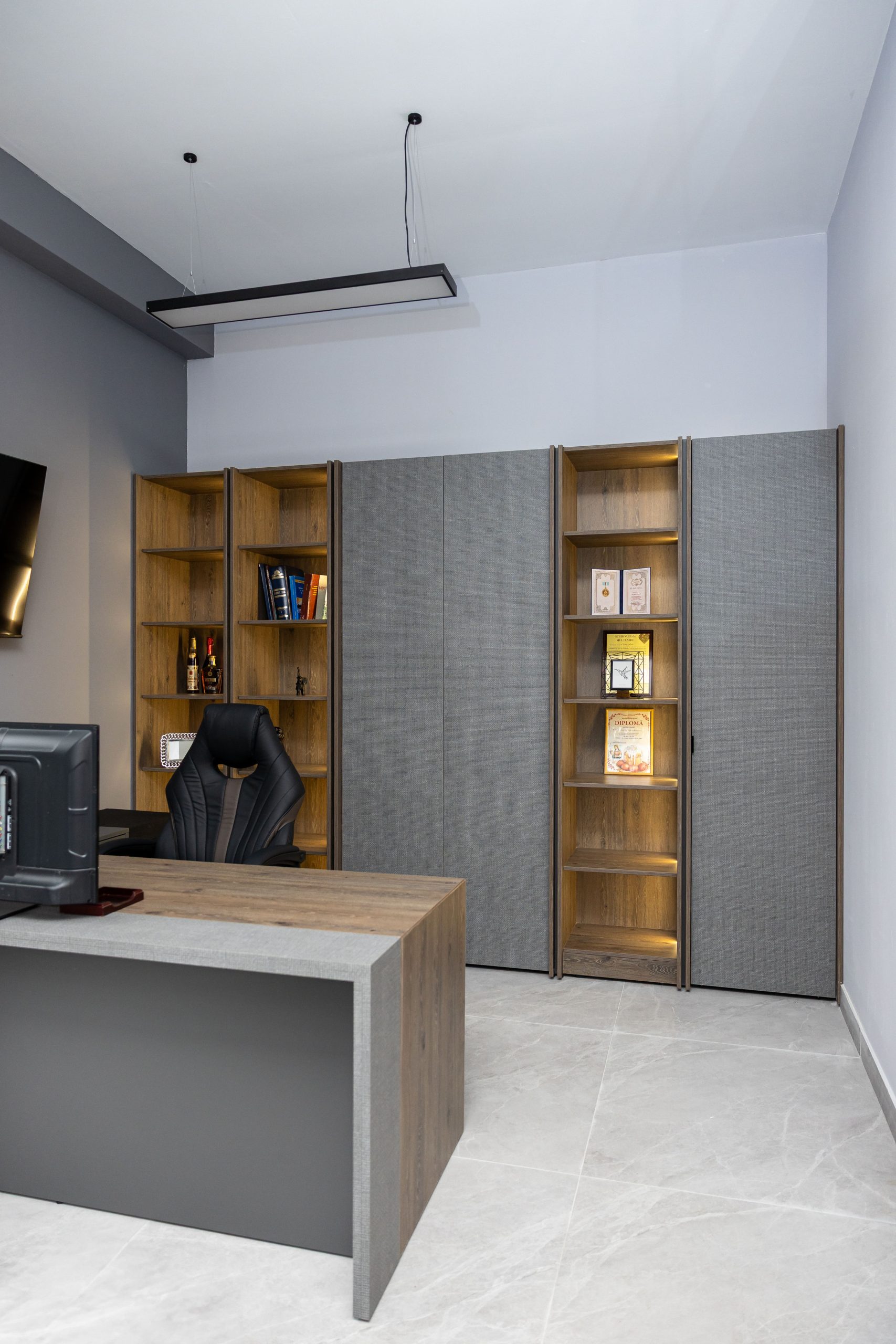 Acest proiect de birou a fost gândit ca un spațiu coerent, în care designul și funcționalitatea lucrează împreună în fiecare detaliu. Elementul central este peretele placat integral cu PAL, finisat cu canturi negre, care creează un efect vizual elegant prin liniile verticale continue. În acest perete sunt integrate două uși filomuro, complet mascate — una duce spre bucătărie, iar cealaltă spre baie. Astfel, spațiile tehnice devin invizibile și nu întrerup estetica generală a încăperii. Am continuat amenajarea cu mobilier personalizat pentru zona de lucru, inclusiv birouri ergonomice poziționate lângă lumină naturală, dar și soluții de depozitare adaptate nevoilor echipei. Sala de ședințe este completată de o masă spațioasă și un sistem de rafturi deschise, care combină funcționalitatea cu un design modern. Întregul proiect este un exemplu clar de optimizare a spațiului, în care fiecare zonă – de la birouri, până la bucătărie și baie – este integrată într-un concept unitar și bine echilibrat.
