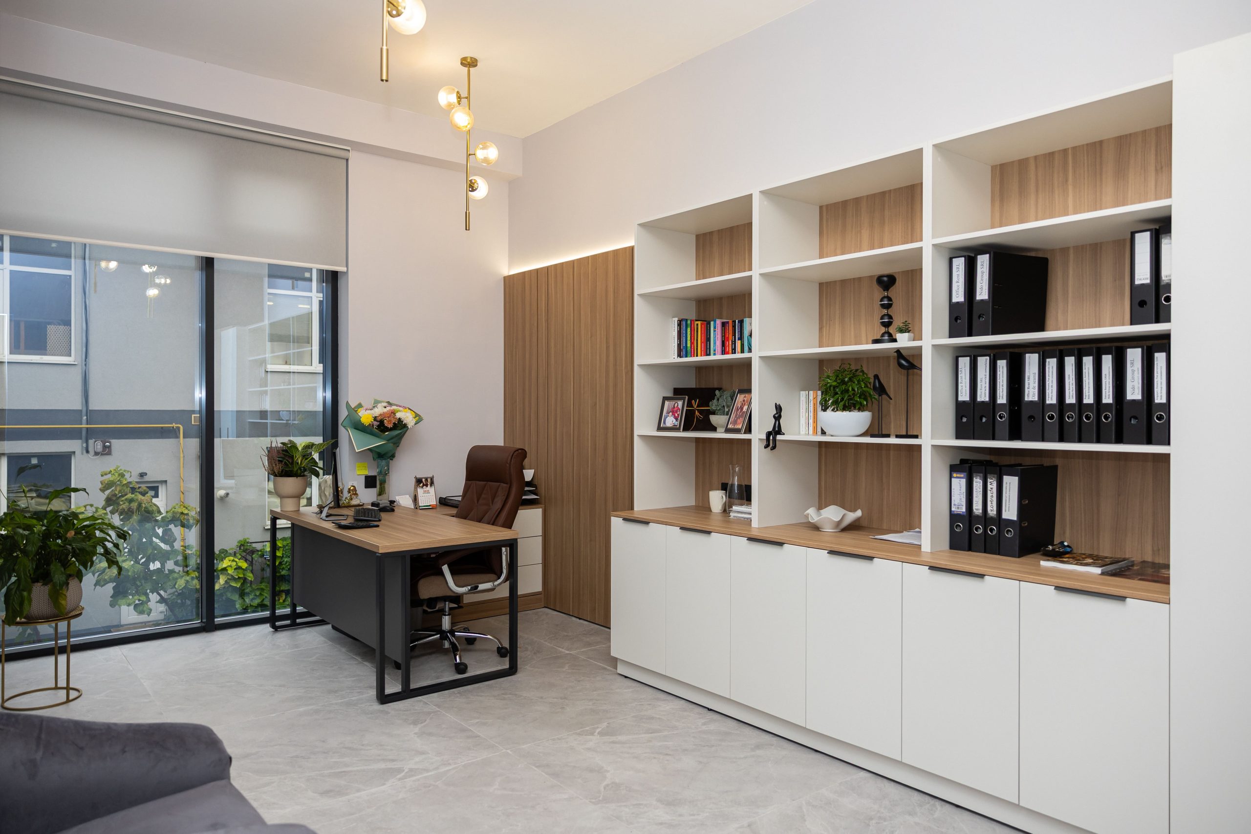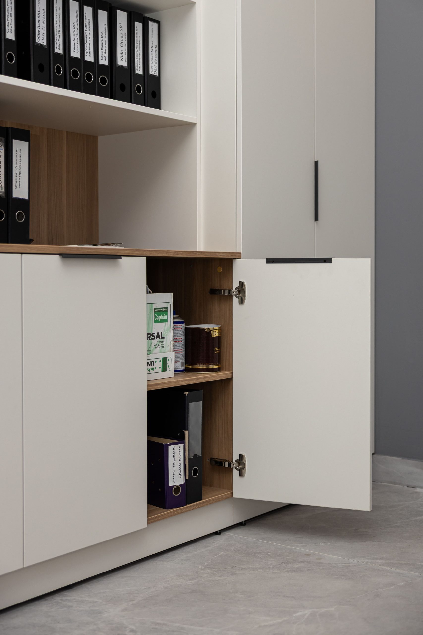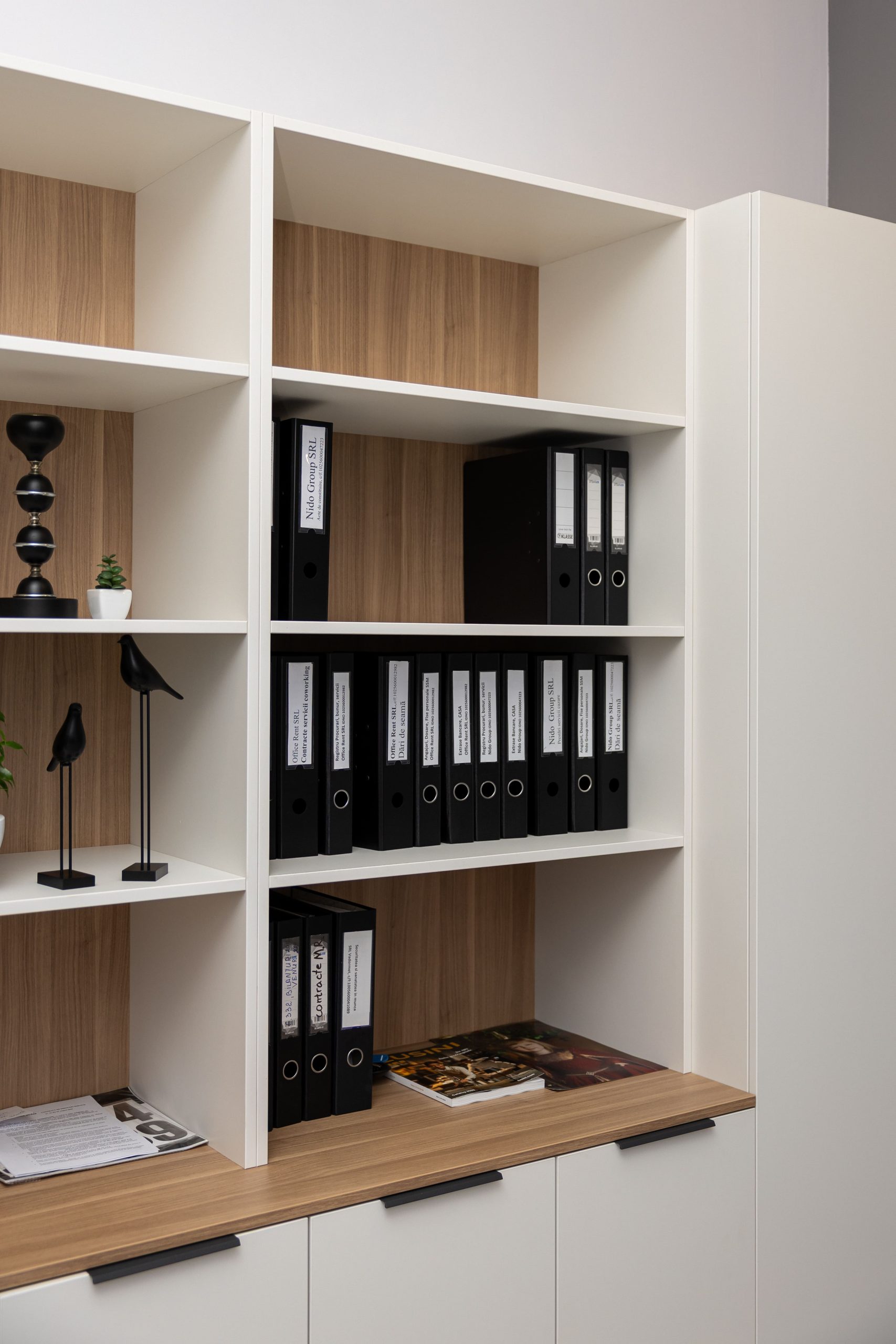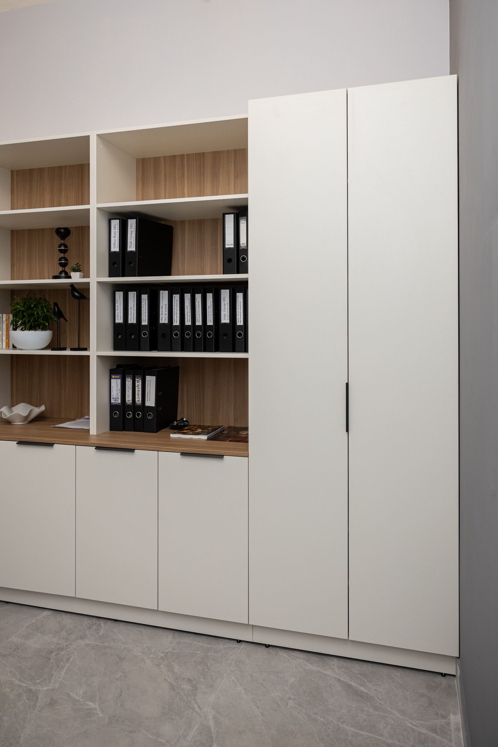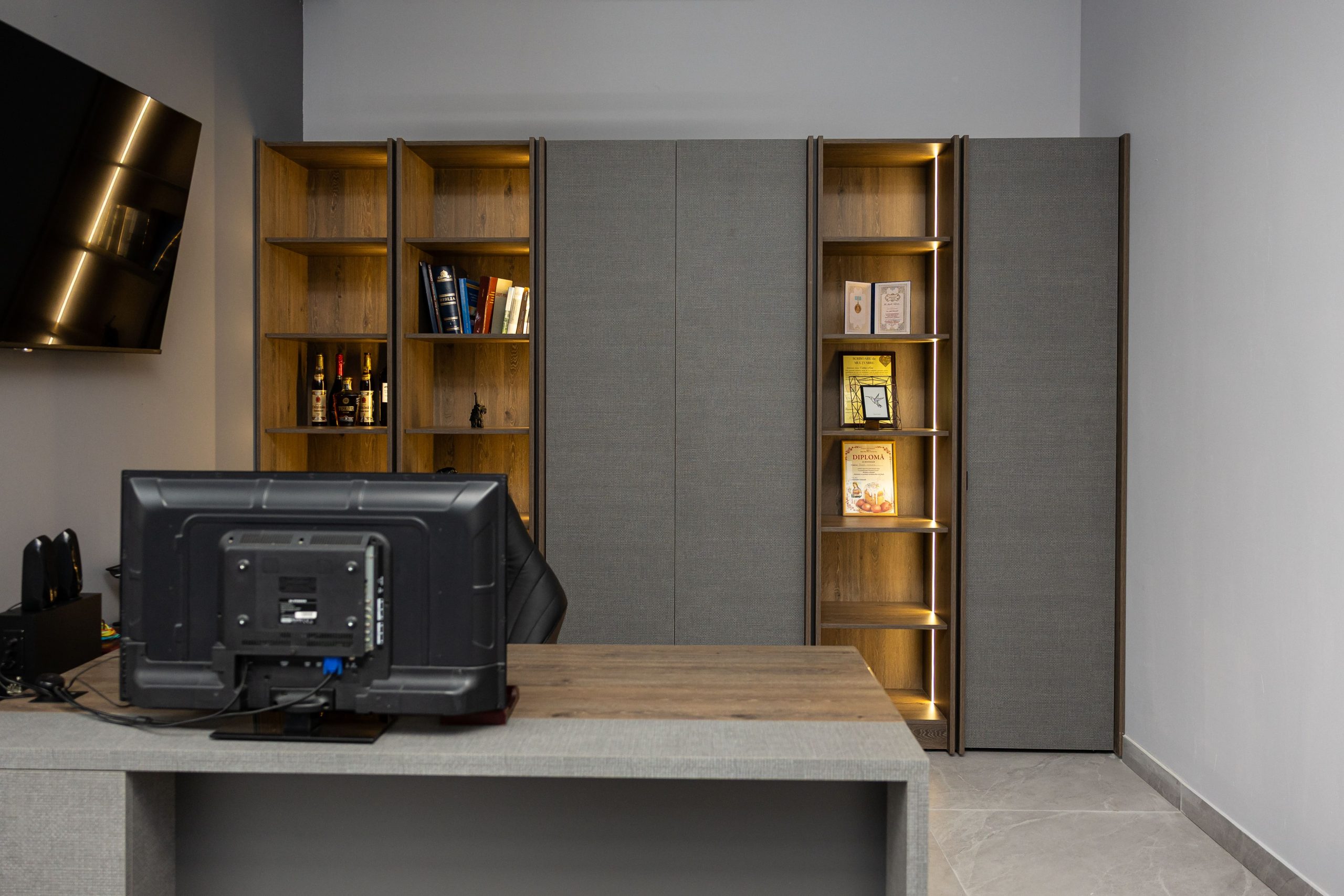 Acest proiect de birou a fost gândit ca un spațiu coerent, în care designul și funcționalitatea lucrează împreună în fiecare detaliu. Elementul central este peretele placat integral cu PAL, finisat cu canturi negre, care creează un efect vizual elegant prin liniile verticale continue. În acest perete sunt integrate două uși filomuro, complet mascate — una duce spre bucătărie, iar cealaltă spre baie. Astfel, spațiile tehnice devin invizibile și nu întrerup estetica generală a încăperii. Am continuat amenajarea cu mobilier personalizat pentru zona de lucru, inclusiv birouri ergonomice poziționate lângă lumină naturală, dar și soluții de depozitare adaptate nevoilor echipei. Sala de ședințe este completată de o masă spațioasă și un sistem de rafturi deschise, care combină funcționalitatea cu un design modern. Întregul proiect este un exemplu clar de optimizare a spațiului, în care fiecare zonă – de la birouri, până la bucătărie și baie – este integrată într-un concept unitar și bine echilibrat.