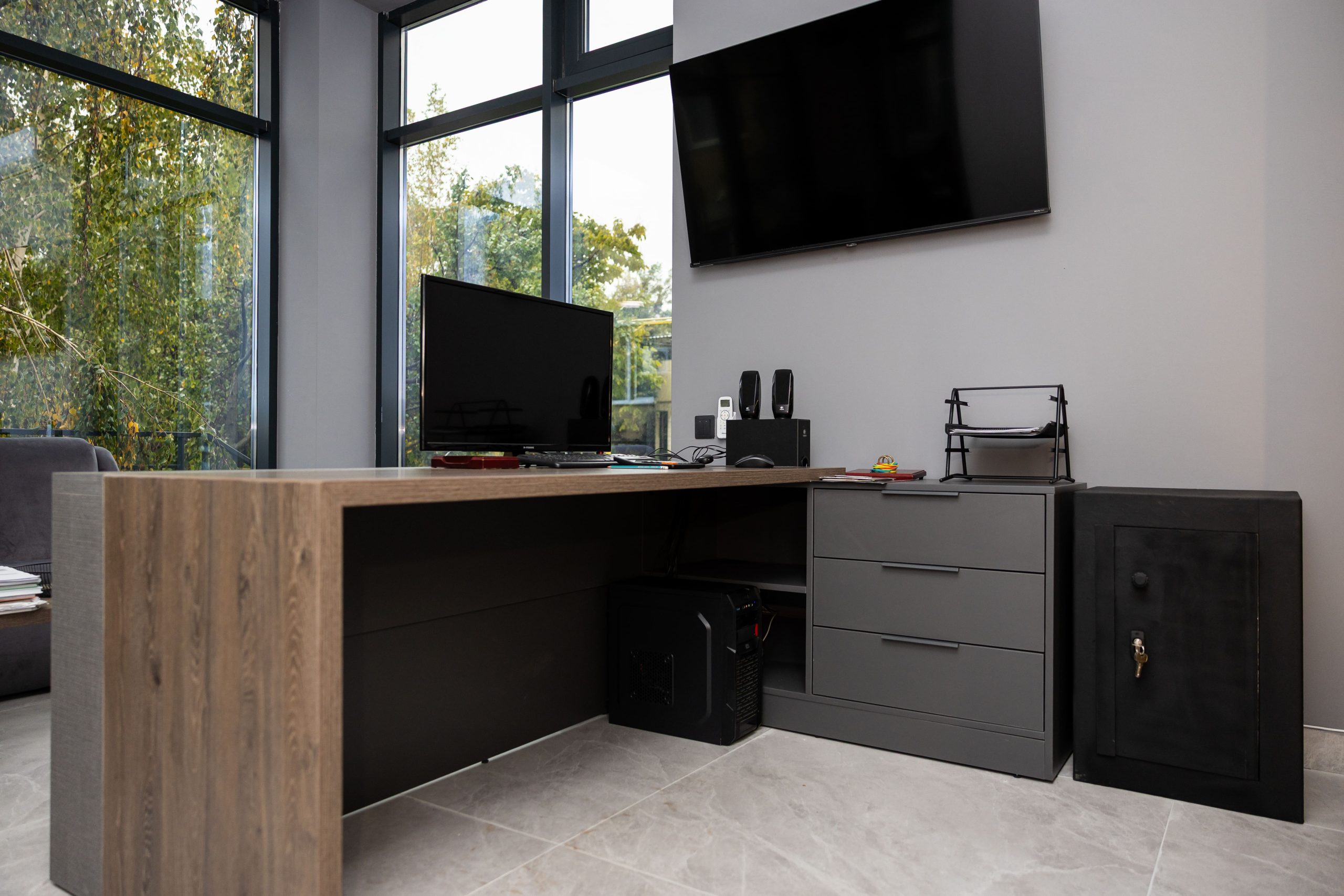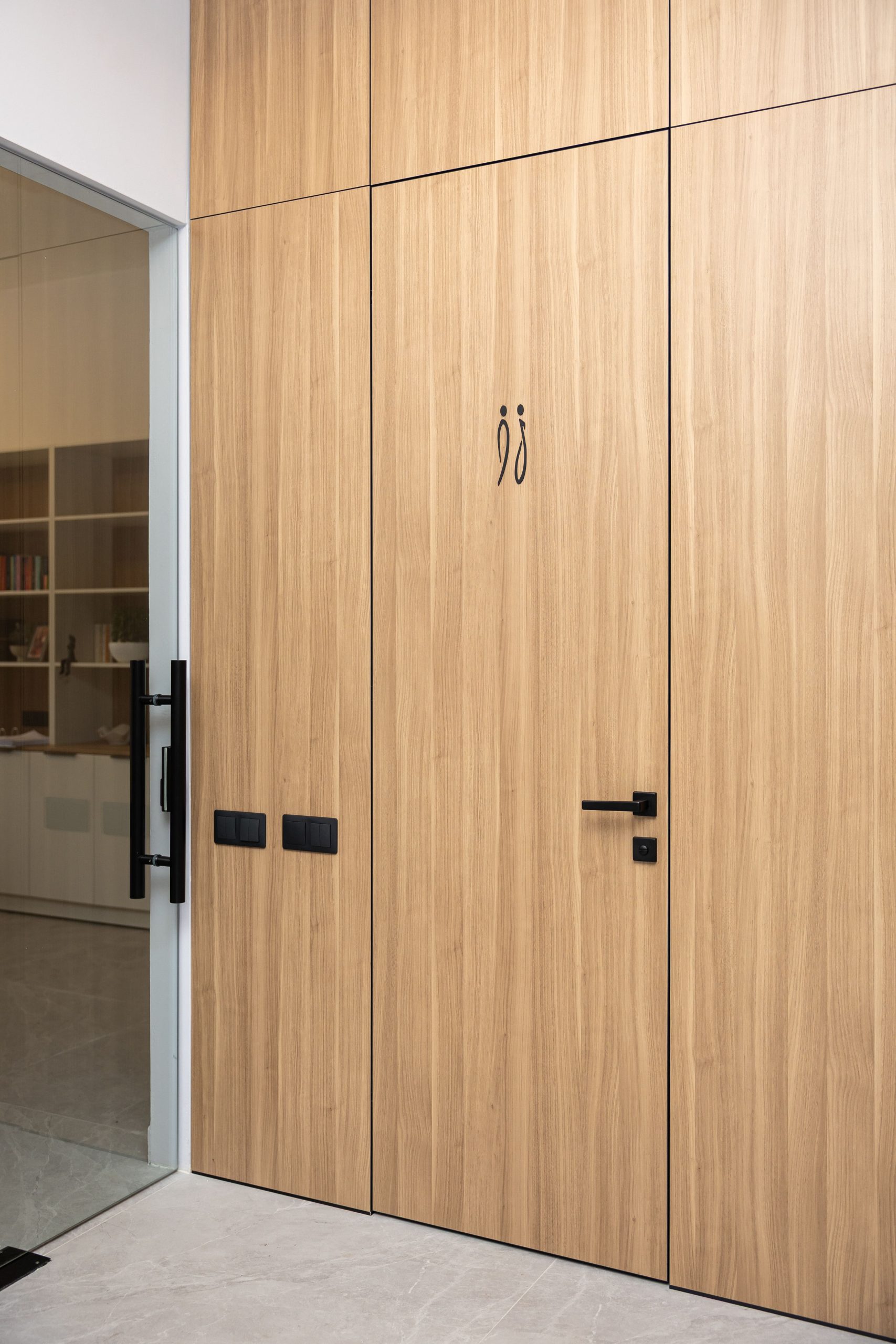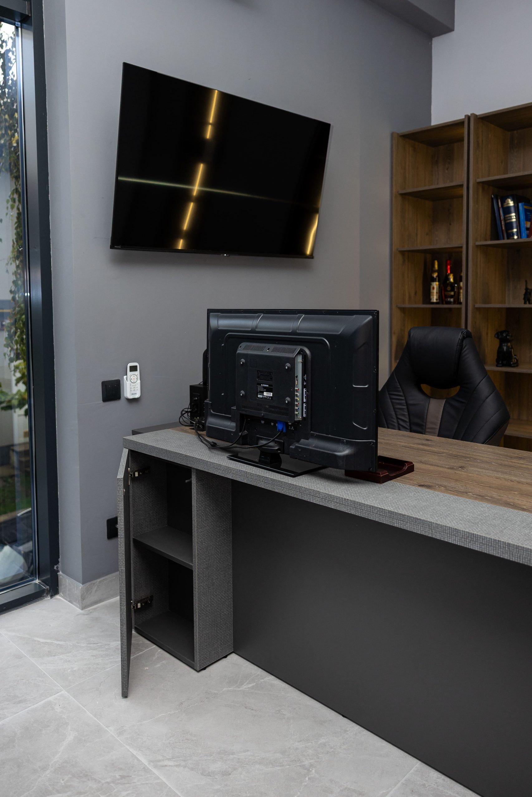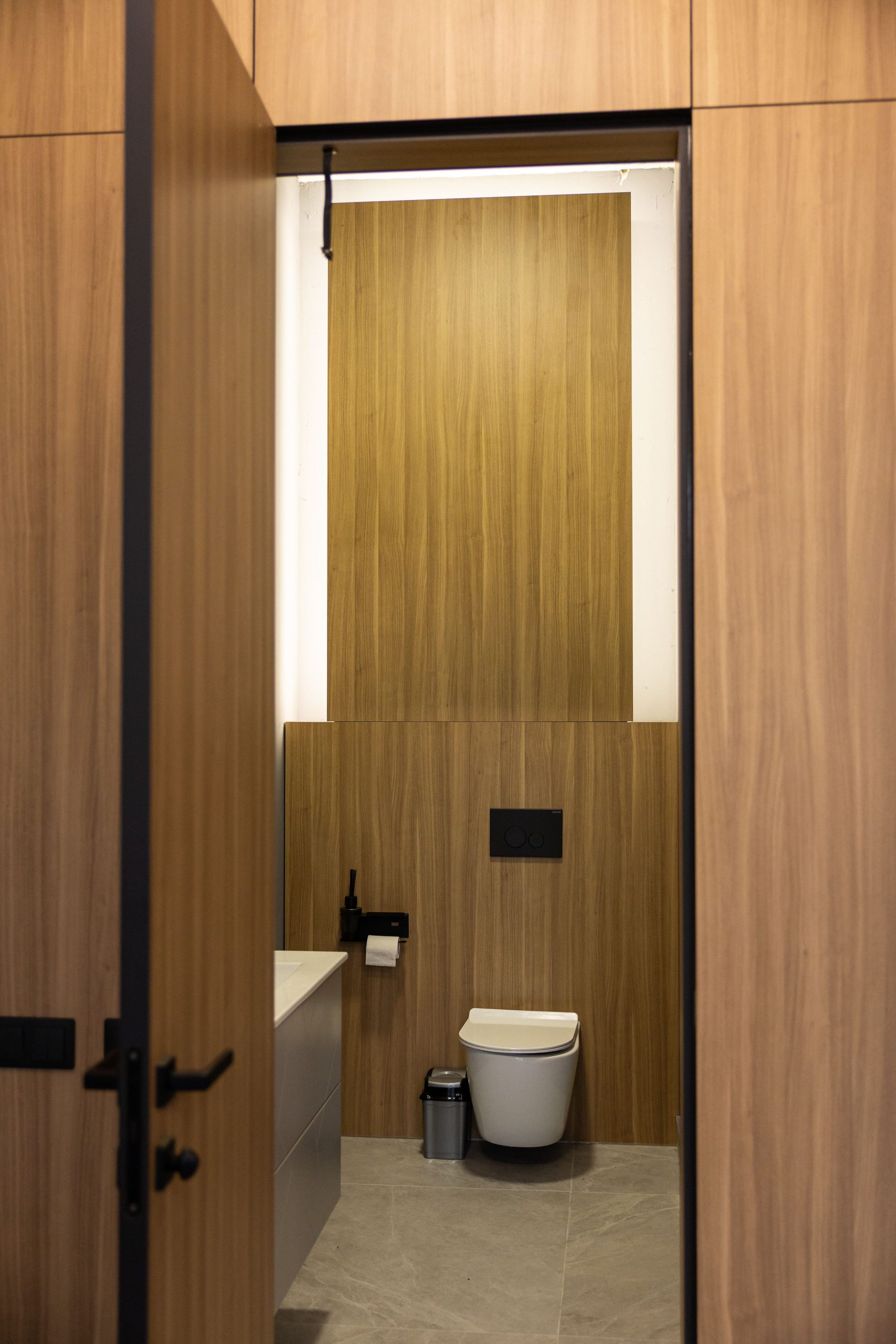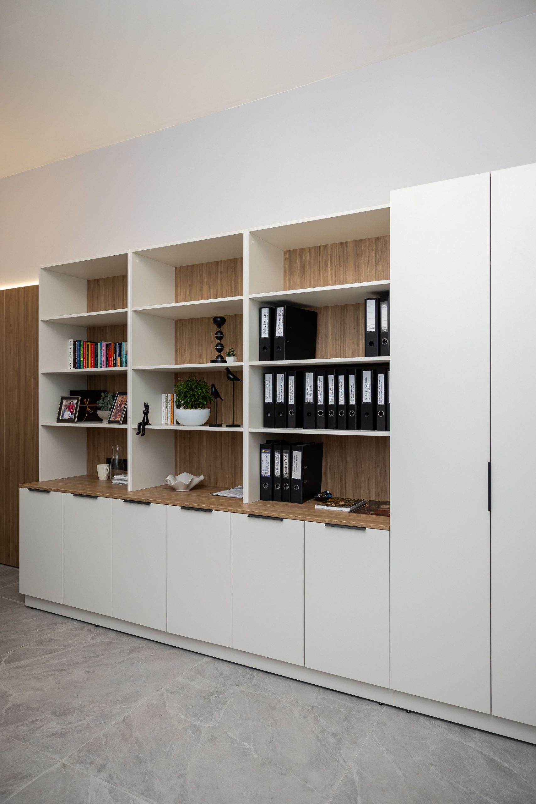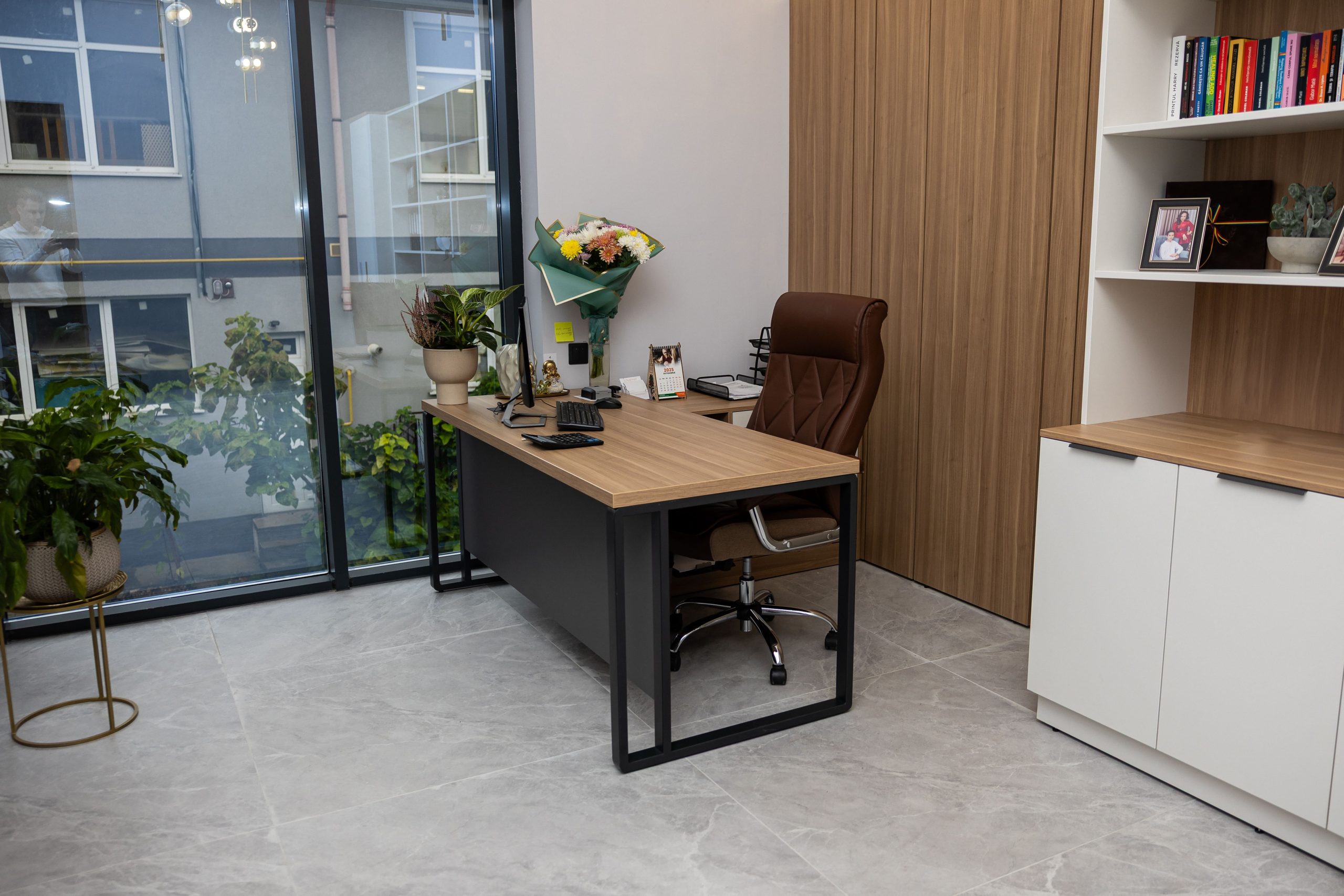 Acest proiect de birou a fost gândit ca un spațiu coerent, în care designul și funcționalitatea lucrează împreună în fiecare detaliu. Elementul central este peretele placat integral cu PAL, finisat cu canturi negre, care creează un efect vizual elegant prin liniile verticale continue. În acest perete sunt integrate două uși filomuro, complet mascate — una duce spre bucătărie, iar cealaltă spre baie. Astfel, spațiile tehnice devin invizibile și nu întrerup estetica generală a încăperii. Am continuat amenajarea cu mobilier personalizat pentru zona de lucru, inclusiv birouri ergonomice poziționate lângă lumină naturală, dar și soluții de depozitare adaptate nevoilor echipei. Sala de ședințe este completată de o masă spațioasă și un sistem de rafturi deschise, care combină funcționalitatea cu un design modern. Întregul proiect este un exemplu clar de optimizare a spațiului, în care fiecare zonă – de la birouri, până la bucătărie și baie – este integrată într-un concept unitar și bine echilibrat.