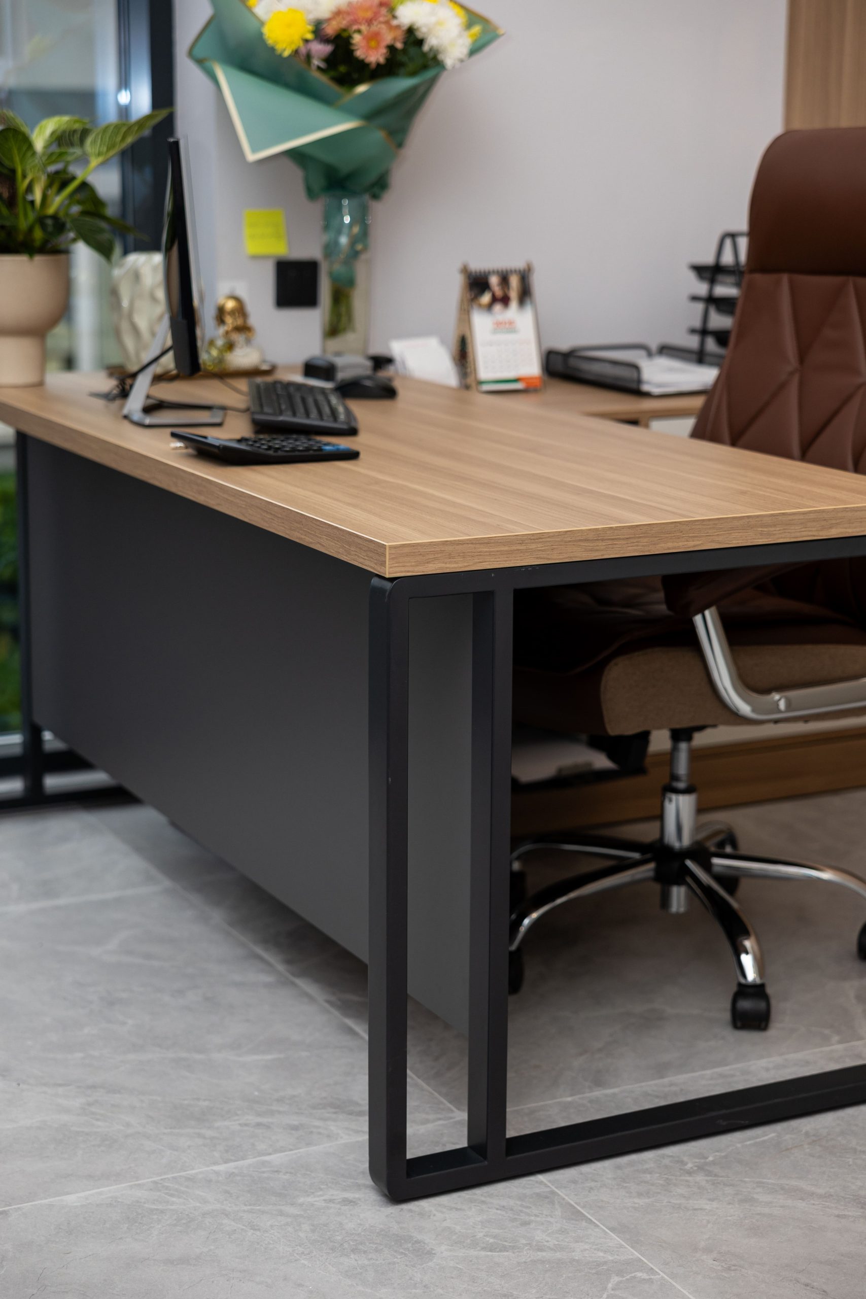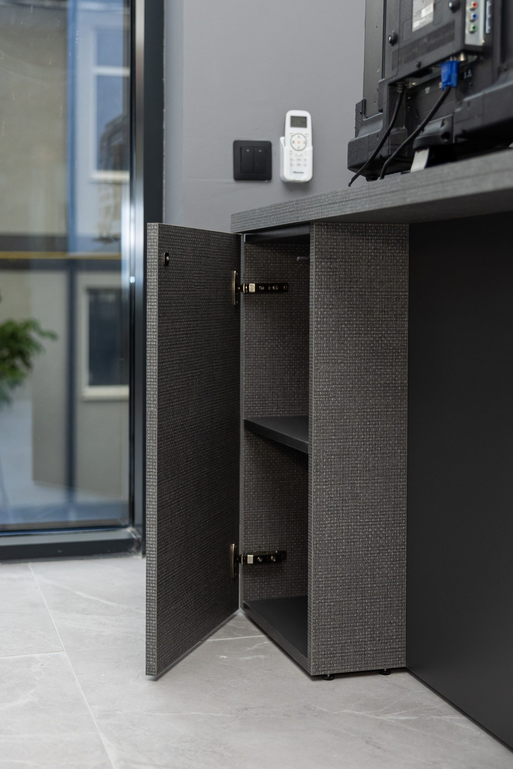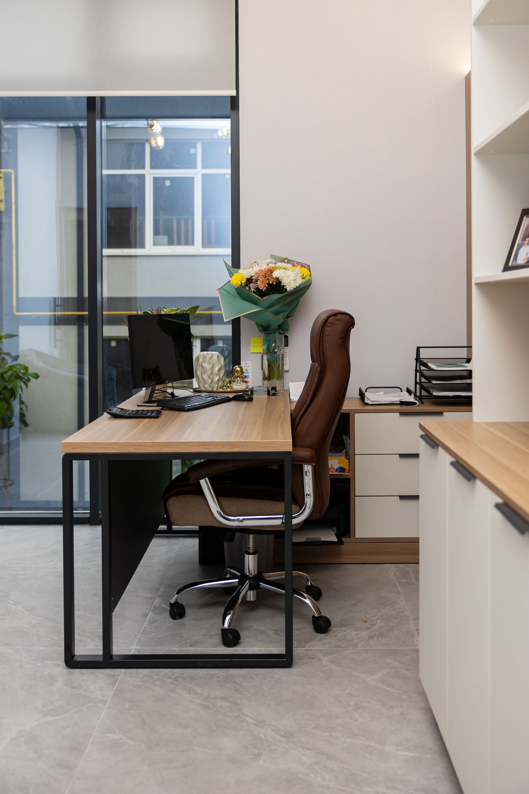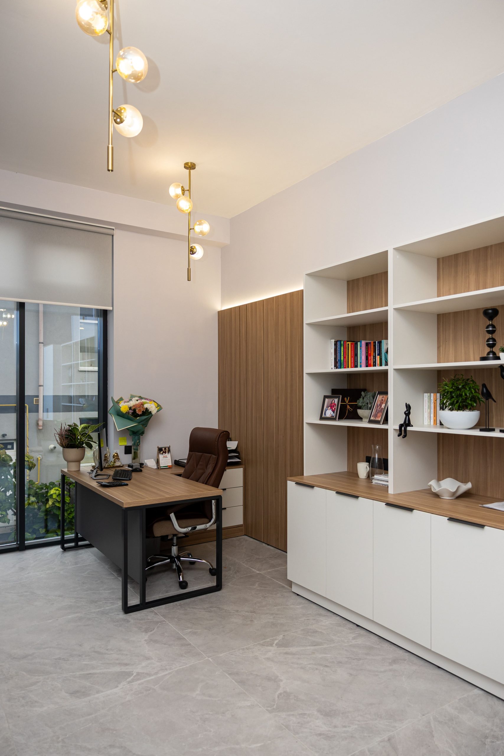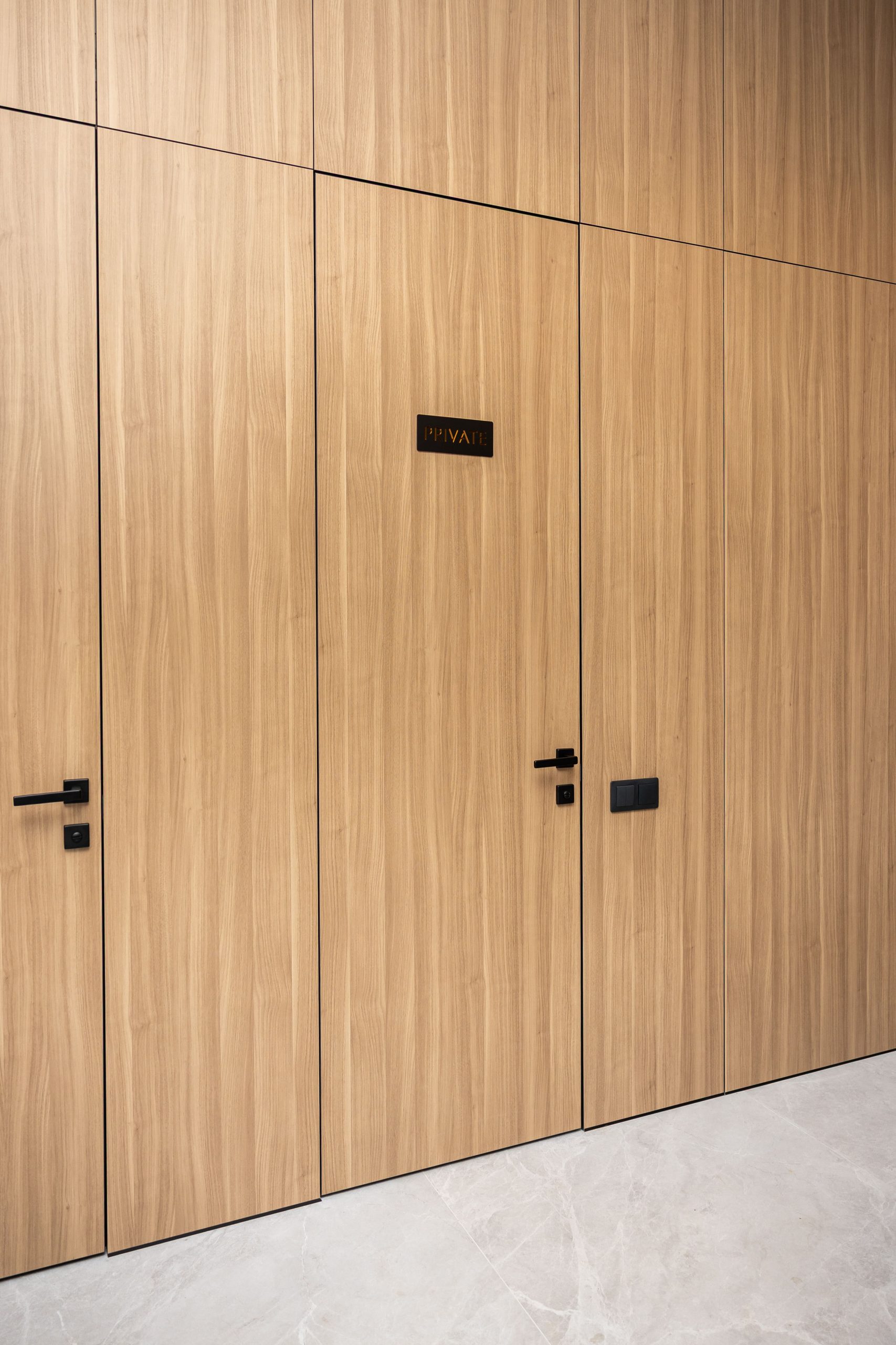 Acest proiect de birou a fost gândit ca un spațiu coerent, în care designul și funcționalitatea lucrează împreună în fiecare detaliu. Elementul central este peretele placat integral cu PAL, finisat cu canturi negre, care creează un efect vizual elegant prin liniile verticale continue. În acest perete sunt integrate două uși filomuro, complet mascate — una duce spre bucătărie, iar cealaltă spre baie. Astfel, spațiile tehnice devin invizibile și nu întrerup estetica generală a încăperii. Am continuat amenajarea cu mobilier personalizat pentru zona de lucru, inclusiv birouri ergonomice poziționate lângă lumină naturală, dar și soluții de depozitare adaptate nevoilor echipei. Sala de ședințe este completată de o masă spațioasă și un sistem de rafturi deschise, care combină funcționalitatea cu un design modern. Întregul proiect este un exemplu clar de optimizare a spațiului, în care fiecare zonă – de la birouri, până la bucătărie și baie – este integrată într-un concept unitar și bine echilibrat.
