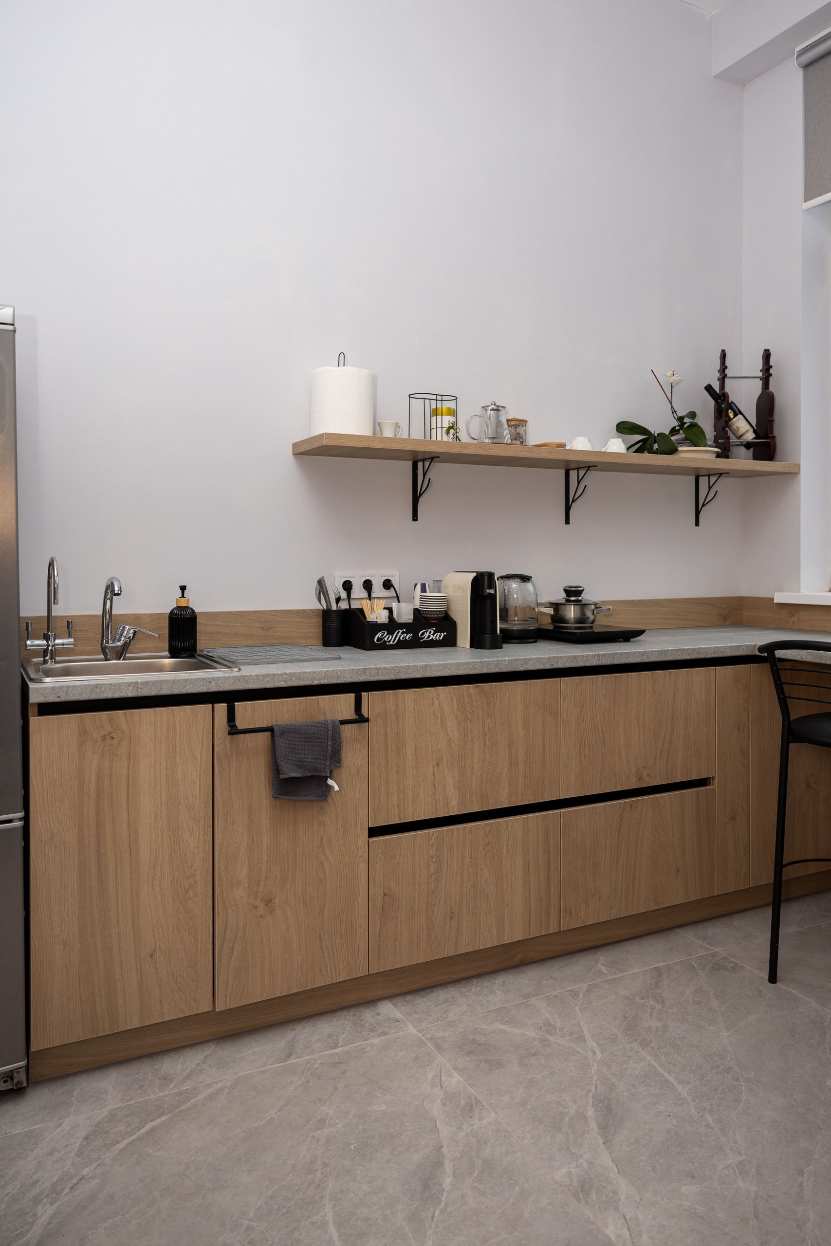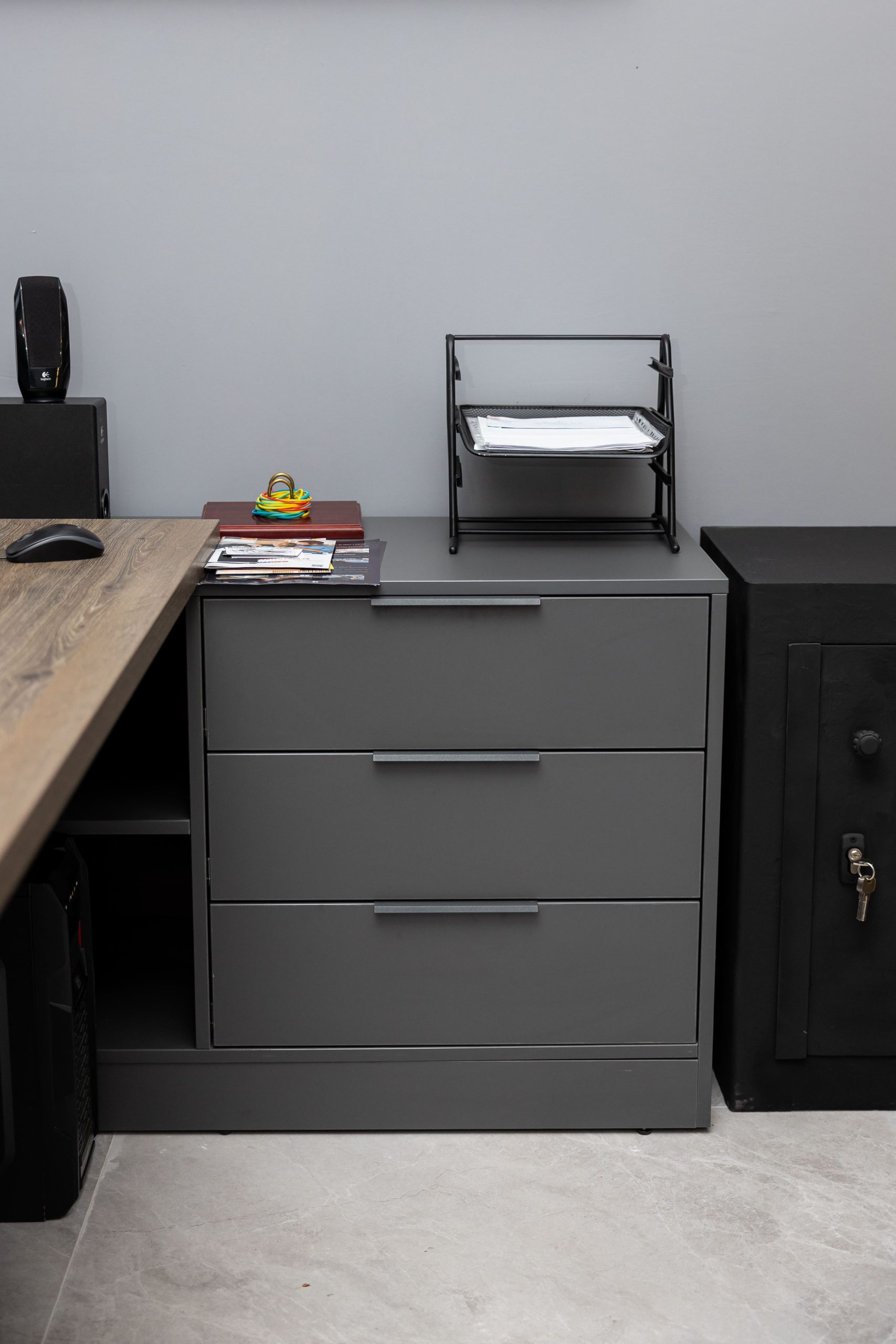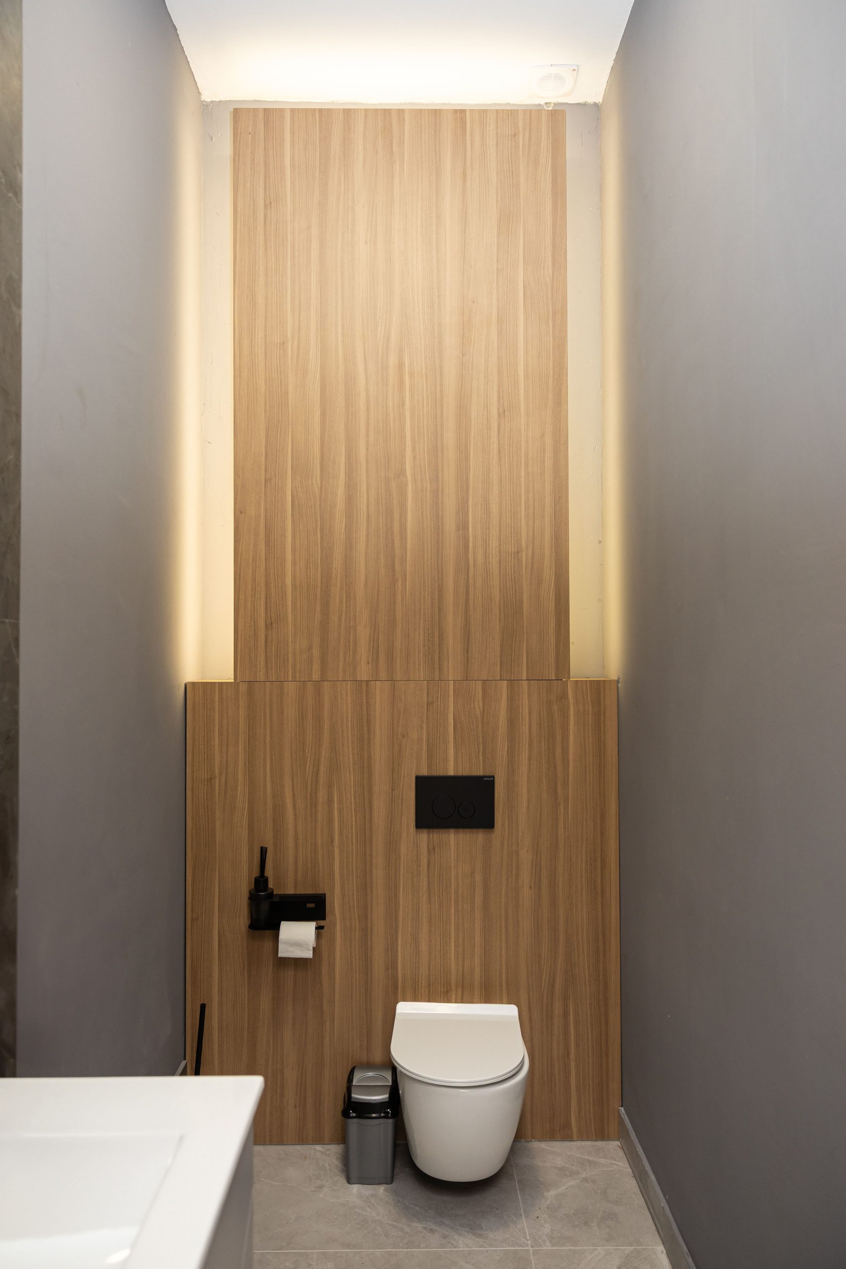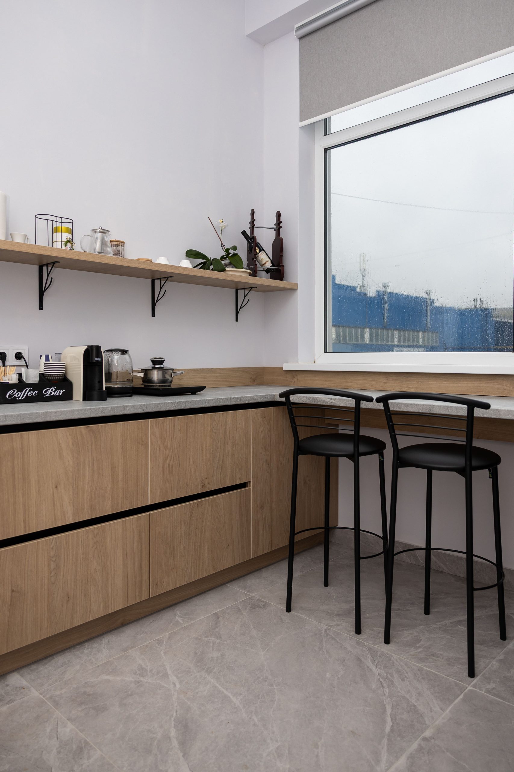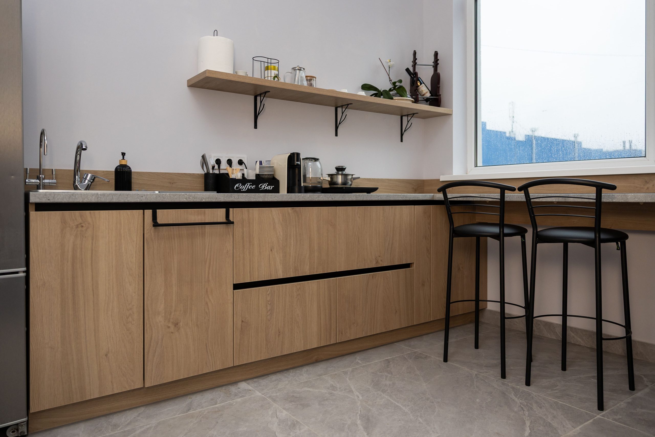 Acest proiect de birou a fost gândit ca un spațiu coerent, în care designul și funcționalitatea lucrează împreună în fiecare detaliu. Elementul central este peretele placat integral cu PAL, finisat cu canturi negre, care creează un efect vizual elegant prin liniile verticale continue. În acest perete sunt integrate două uși filomuro, complet mascate — una duce spre bucătărie, iar cealaltă spre baie. Astfel, spațiile tehnice devin invizibile și nu întrerup estetica generală a încăperii. Am continuat amenajarea cu mobilier personalizat pentru zona de lucru, inclusiv birouri ergonomice poziționate lângă lumină naturală, dar și soluții de depozitare adaptate nevoilor echipei. Sala de ședințe este completată de o masă spațioasă și un sistem de rafturi deschise, care combină funcționalitatea cu un design modern. Întregul proiect este un exemplu clar de optimizare a spațiului, în care fiecare zonă – de la birouri, până la bucătărie și baie – este integrată într-un concept unitar și bine echilibrat.