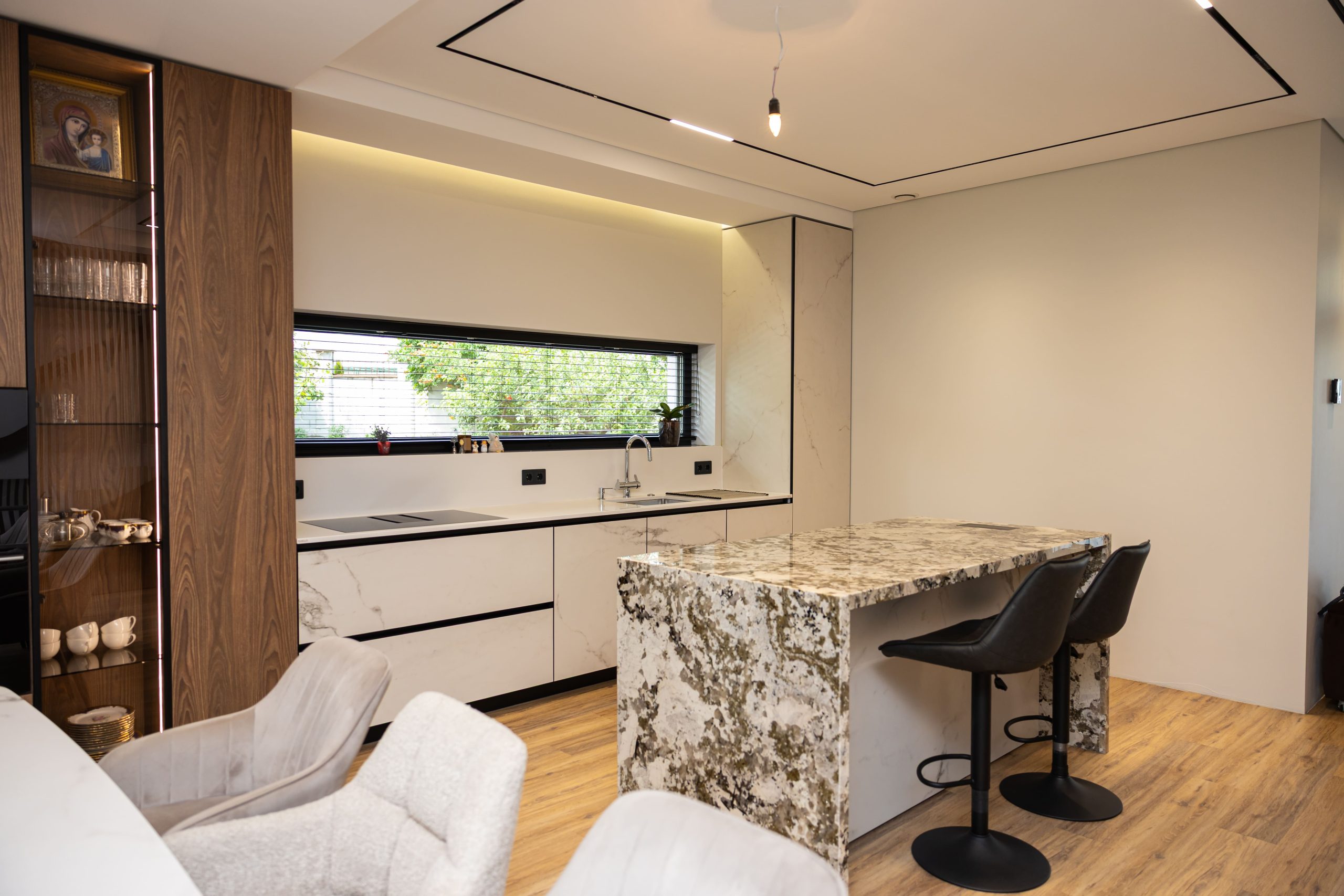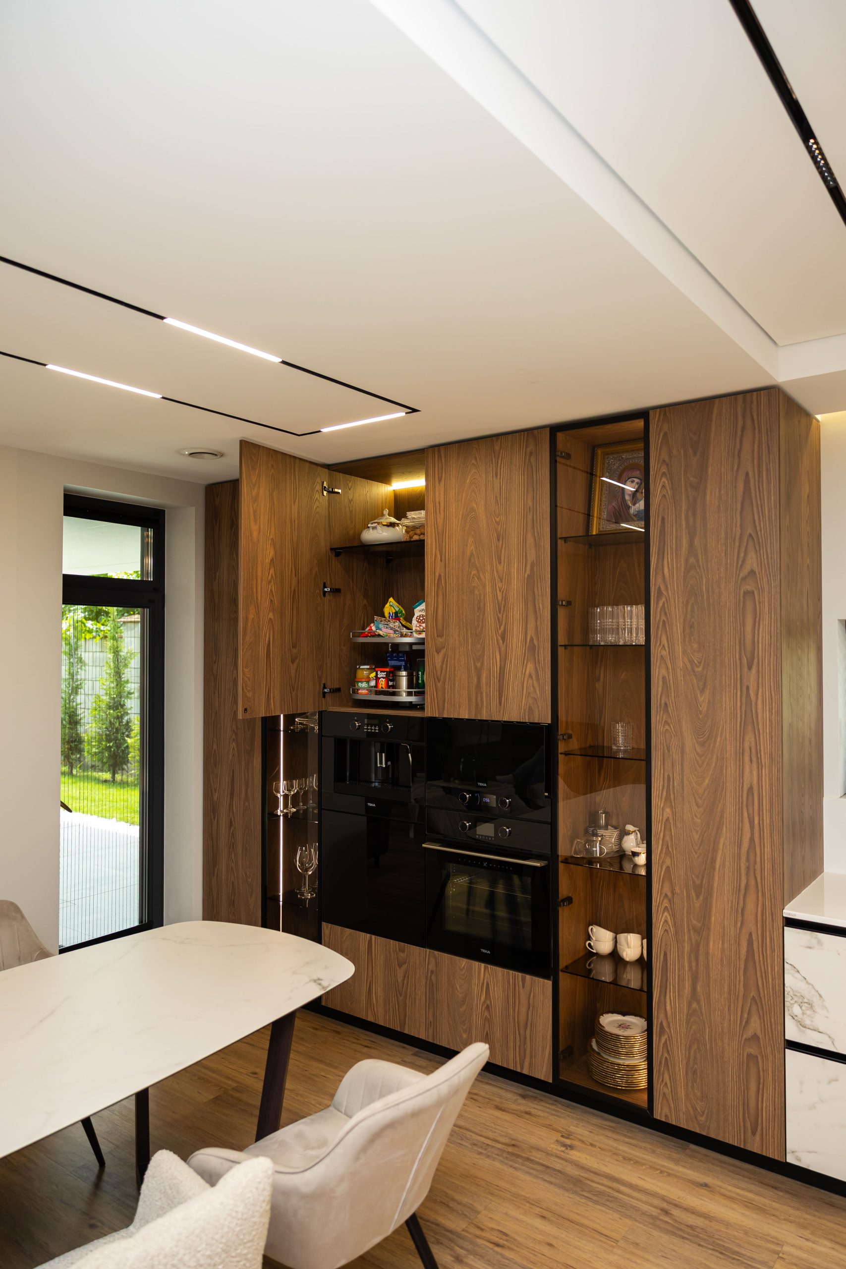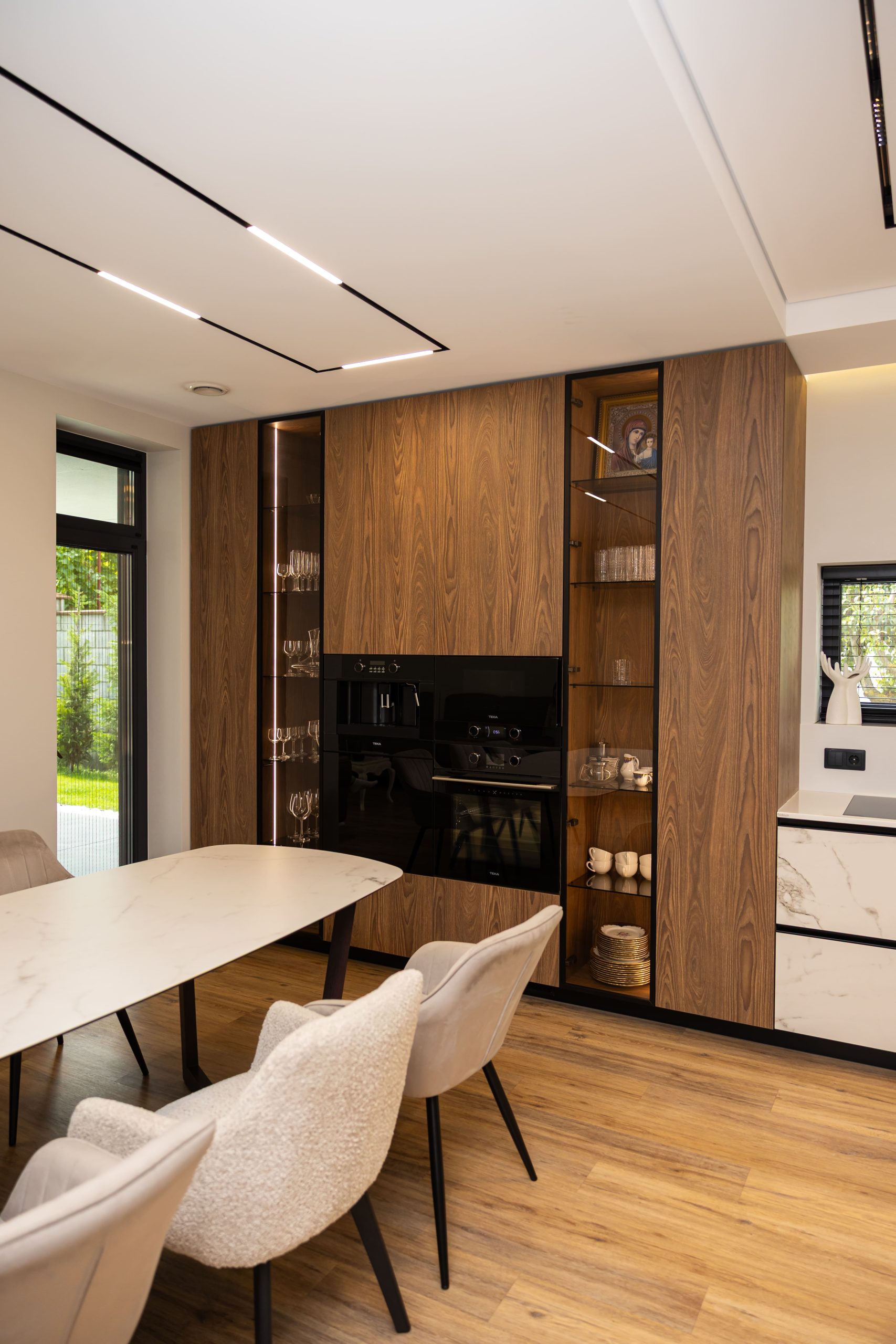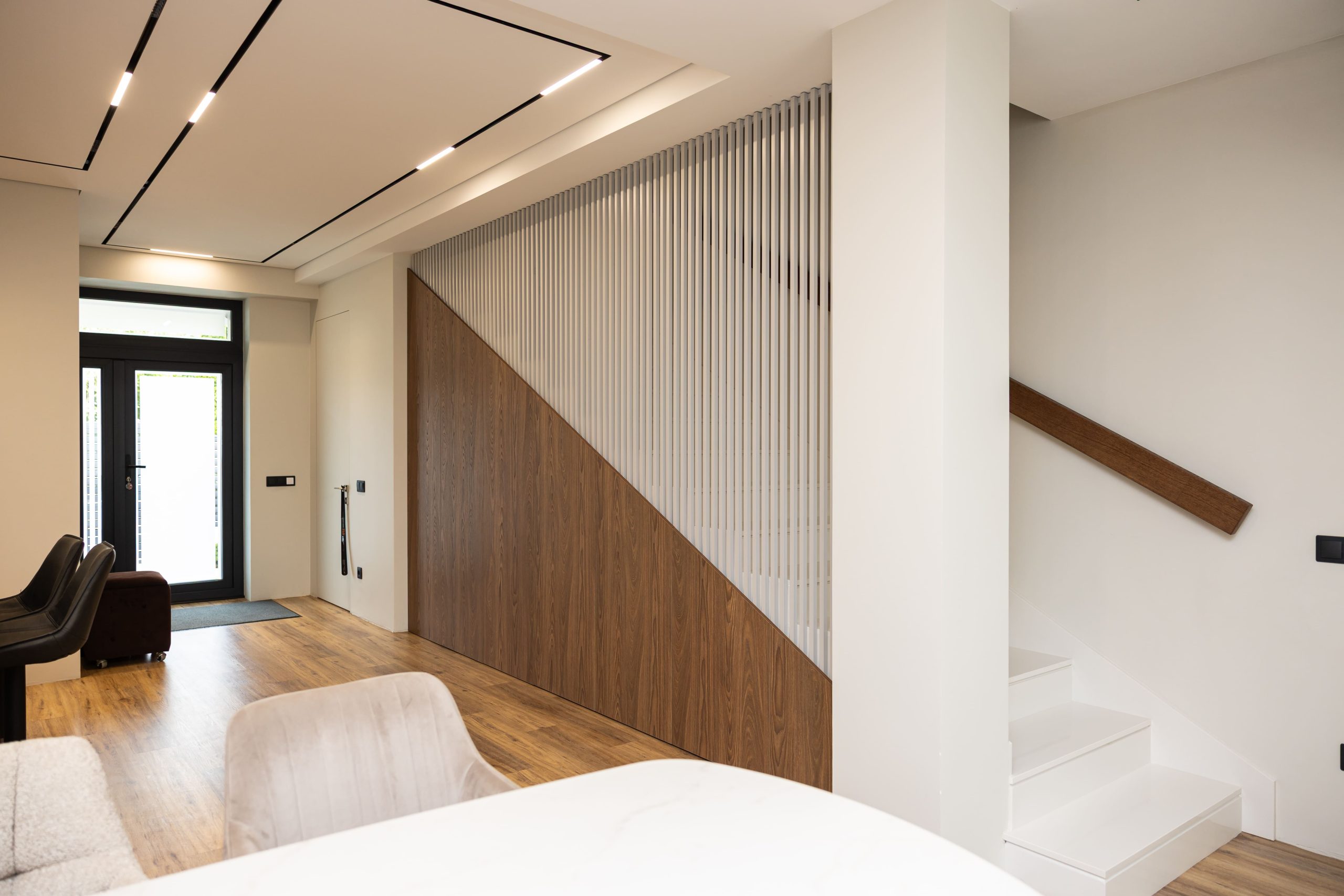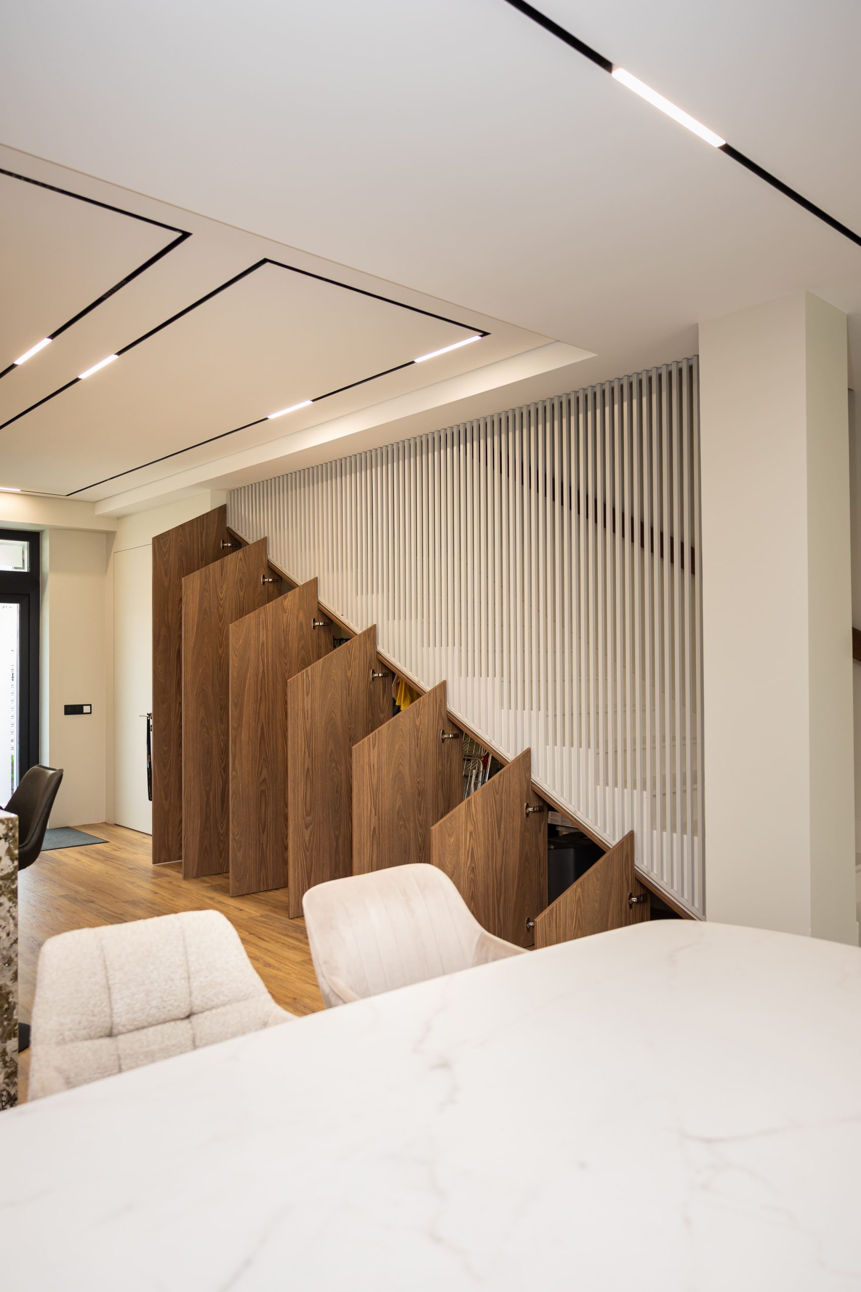Acest proiect pune accent pe echilibrul dintre estetică și funcționalitate, printr-o amenajare completă realizată cu mobilier personalizat, adaptat fiecărui spațiu din locuință. La primul nivel, zona de living și bucătărie este definită de contraste elegante între texturi calde și suprafețe moderne, completate de soluții integrate de depozitare. Un element distinct este spațiul de sub scară, transformat într-un sistem discret și eficient de organizare. Zona de baie și spațiul de laundry completează funcționalitatea acestui nivel, fără a încărca vizual interiorul. La etaj, dormitorul matrimonial este gândit ca un spațiu relaxant, cu o garderobă bine organizată și iluminare ambientală integrată. Camerele copiilor includ birouri și spații de depozitare adaptate utilizării zilnice, iar zona de baie păstrează aceeași linie modernă, cu mobilier minimalist și finisaje atent alese.