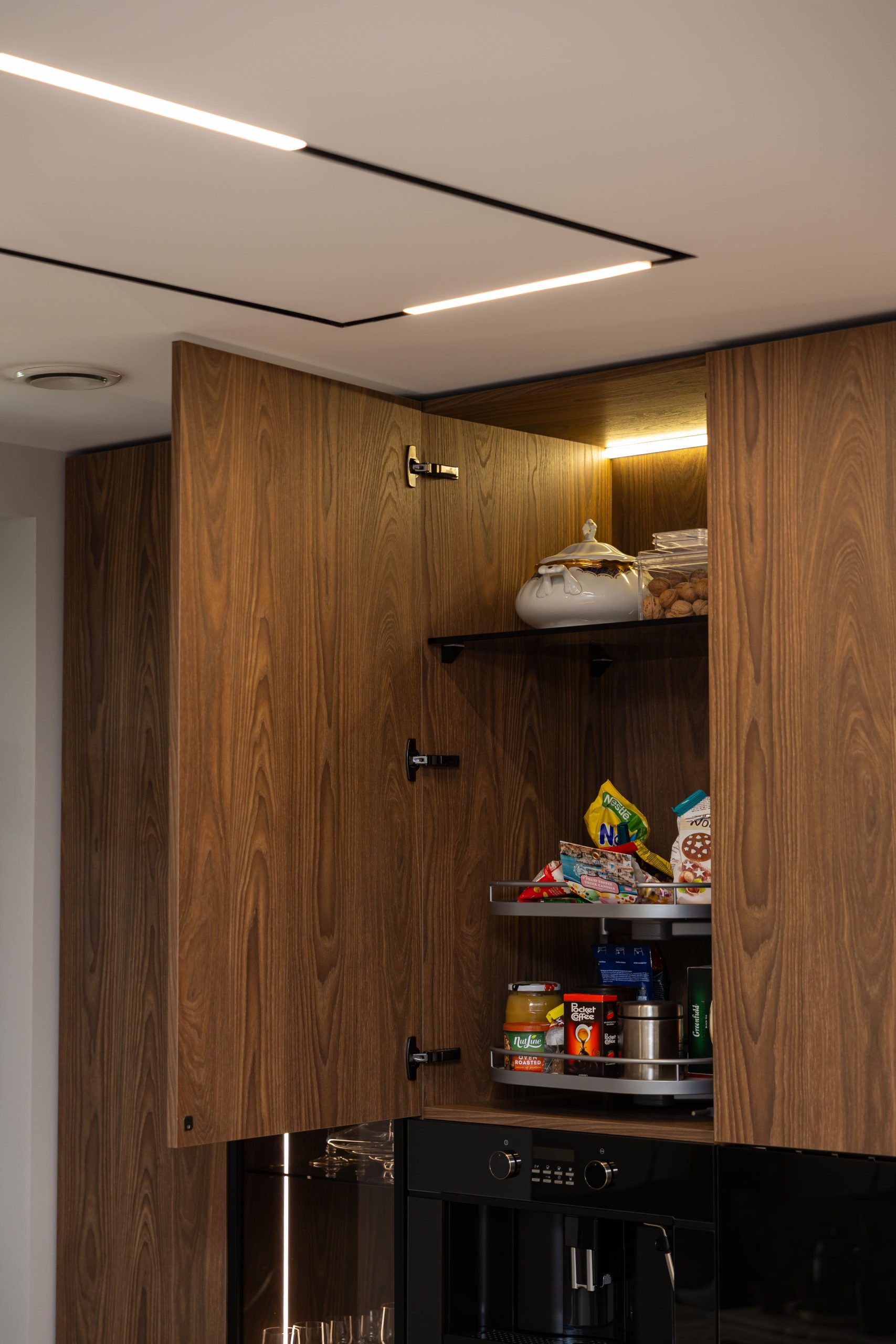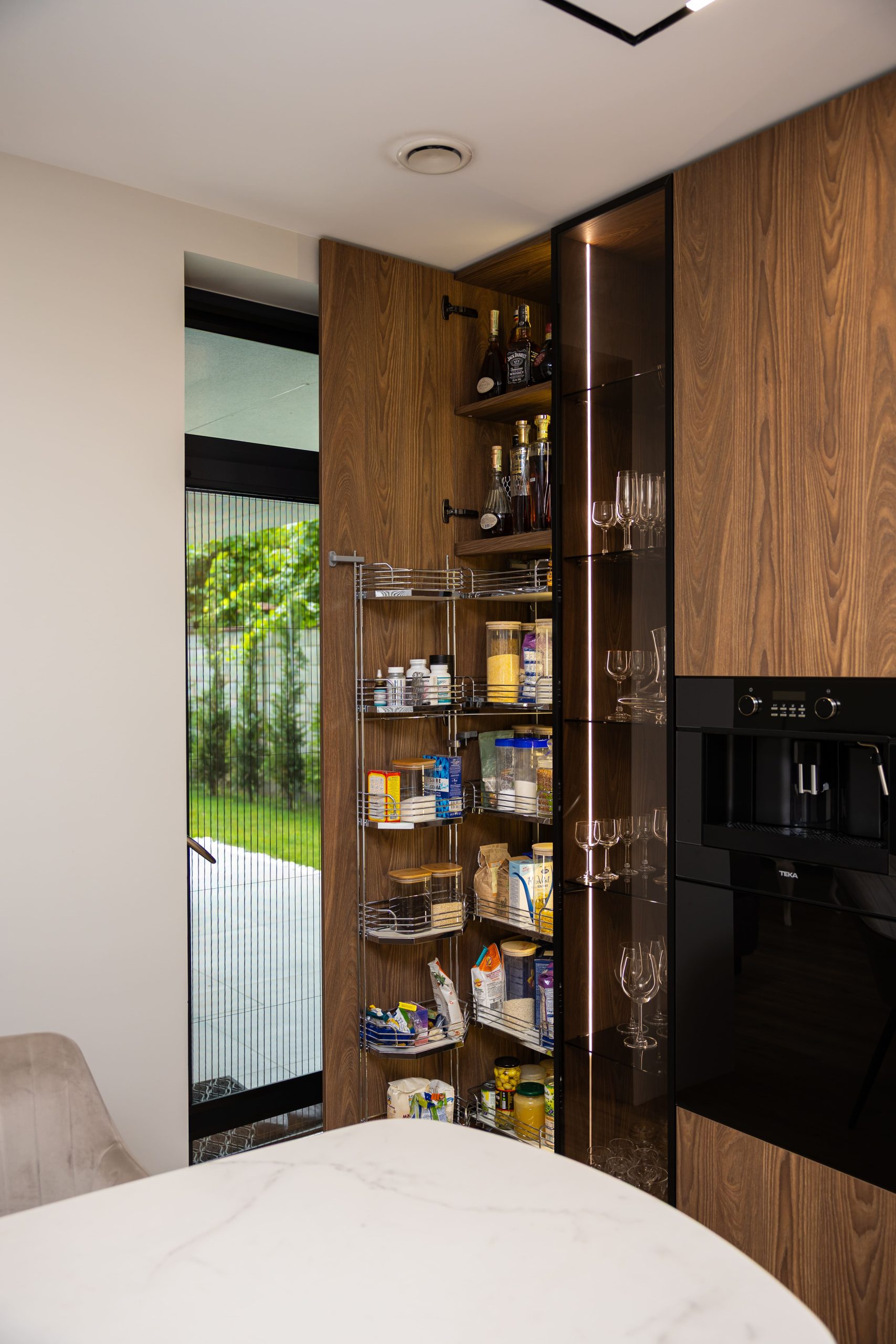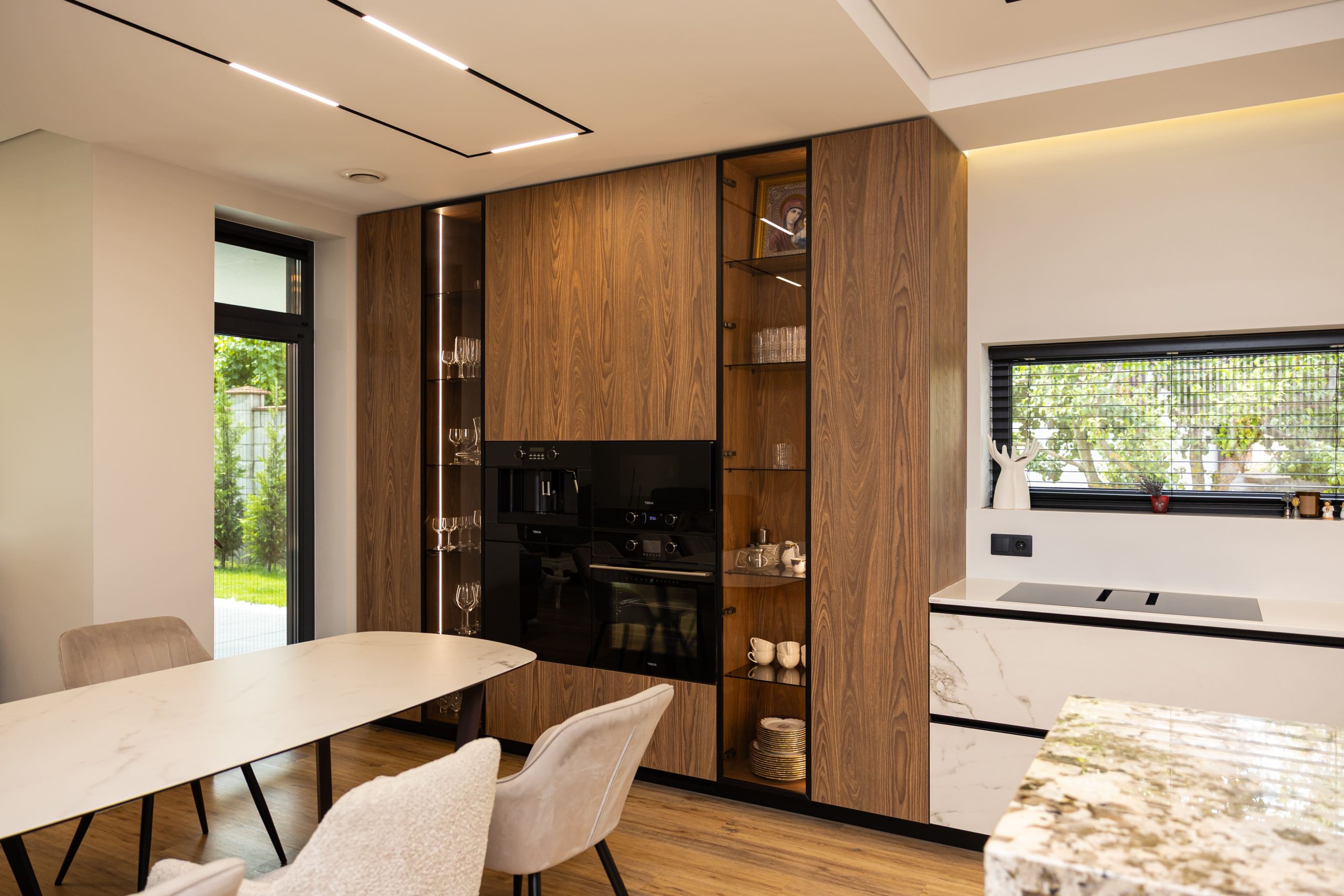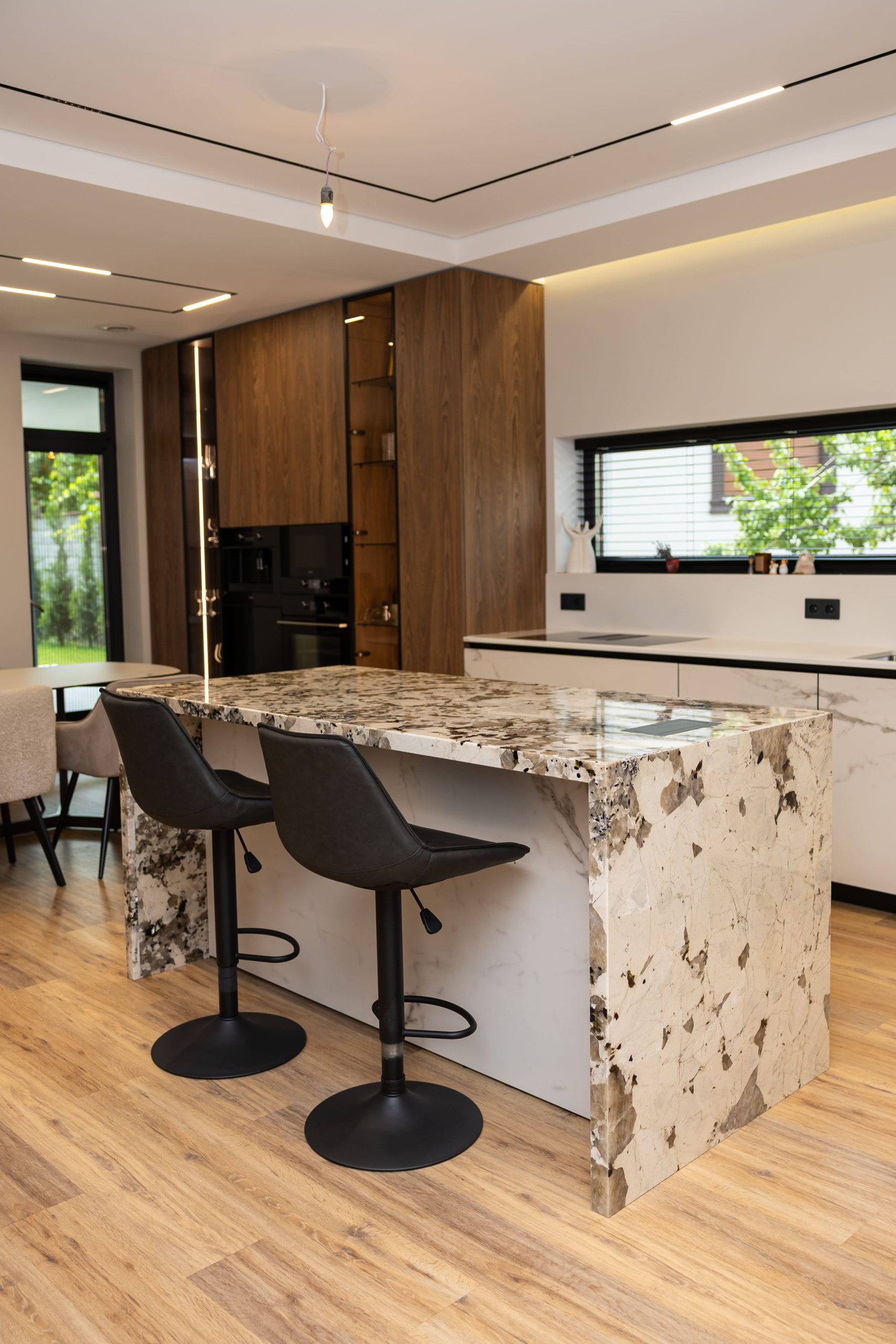 Acest proiect pune accent pe echilibrul dintre estetică și funcționalitate, printr-o amenajare completă realizată cu mobilier personalizat, adaptat fiecărui spațiu din locuință. La primul nivel, zona de living și bucătărie este definită de contraste elegante între texturi calde și suprafețe moderne, completate de soluții integrate de depozitare. Un element distinct este spațiul de sub scară, transformat într-un sistem discret și eficient de organizare. Zona de baie și spațiul de laundry completează funcționalitatea acestui nivel, fără a încărca vizual interiorul. La etaj, dormitorul matrimonial este gândit ca un spațiu relaxant, cu o garderobă bine organizată și iluminare ambientală integrată. Camerele copiilor includ birouri și spații de depozitare adaptate utilizării zilnice, iar zona de baie păstrează aceeași linie modernă, cu mobilier minimalist și finisaje atent alese.