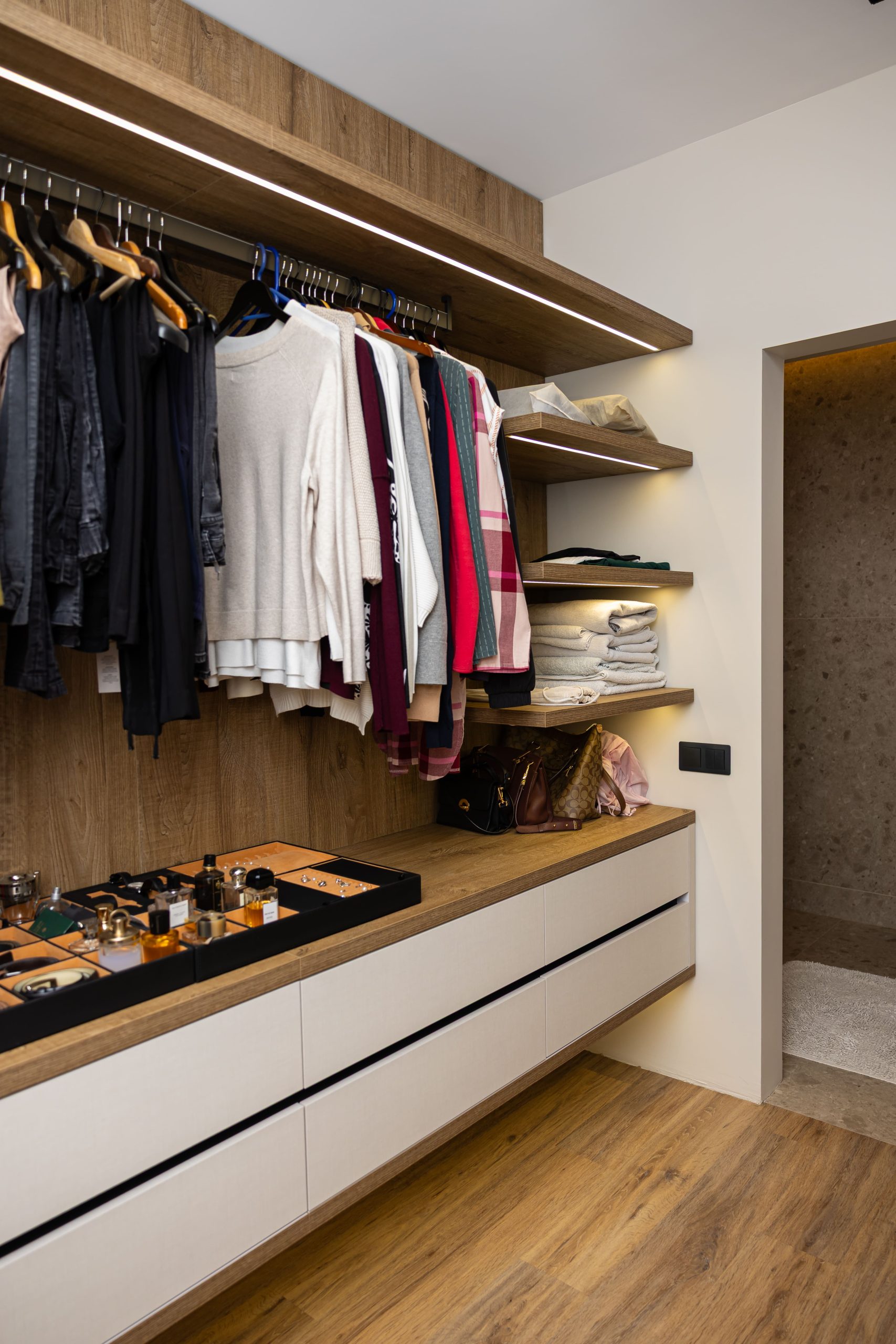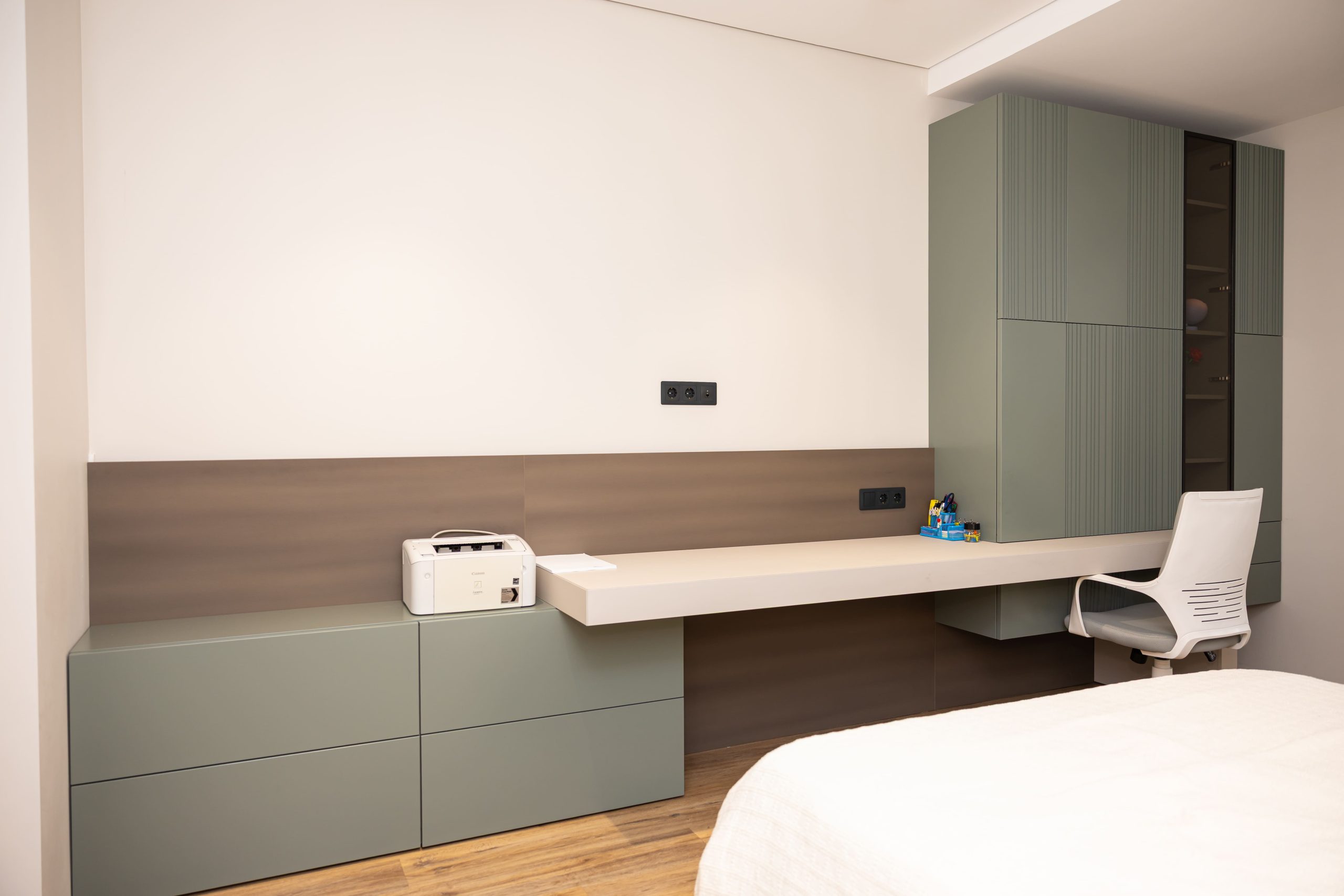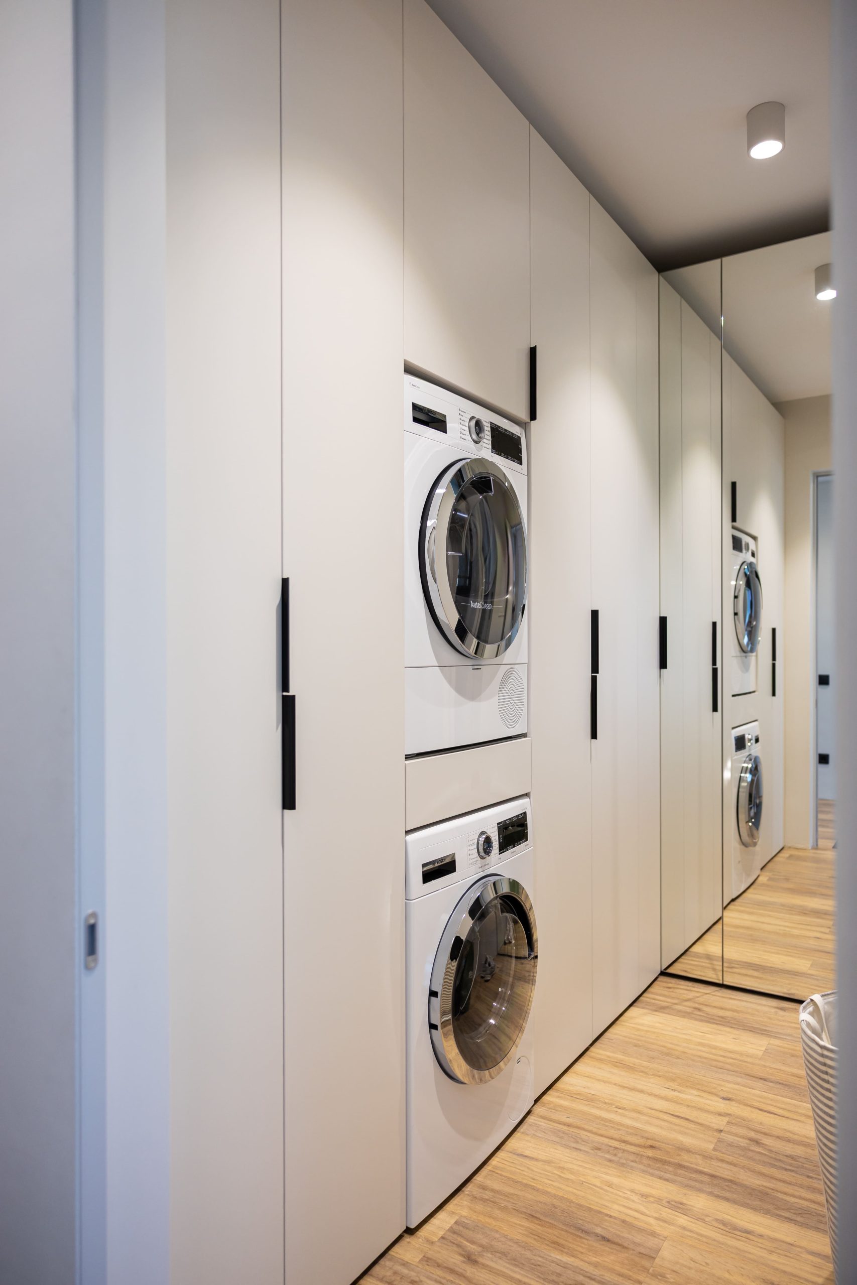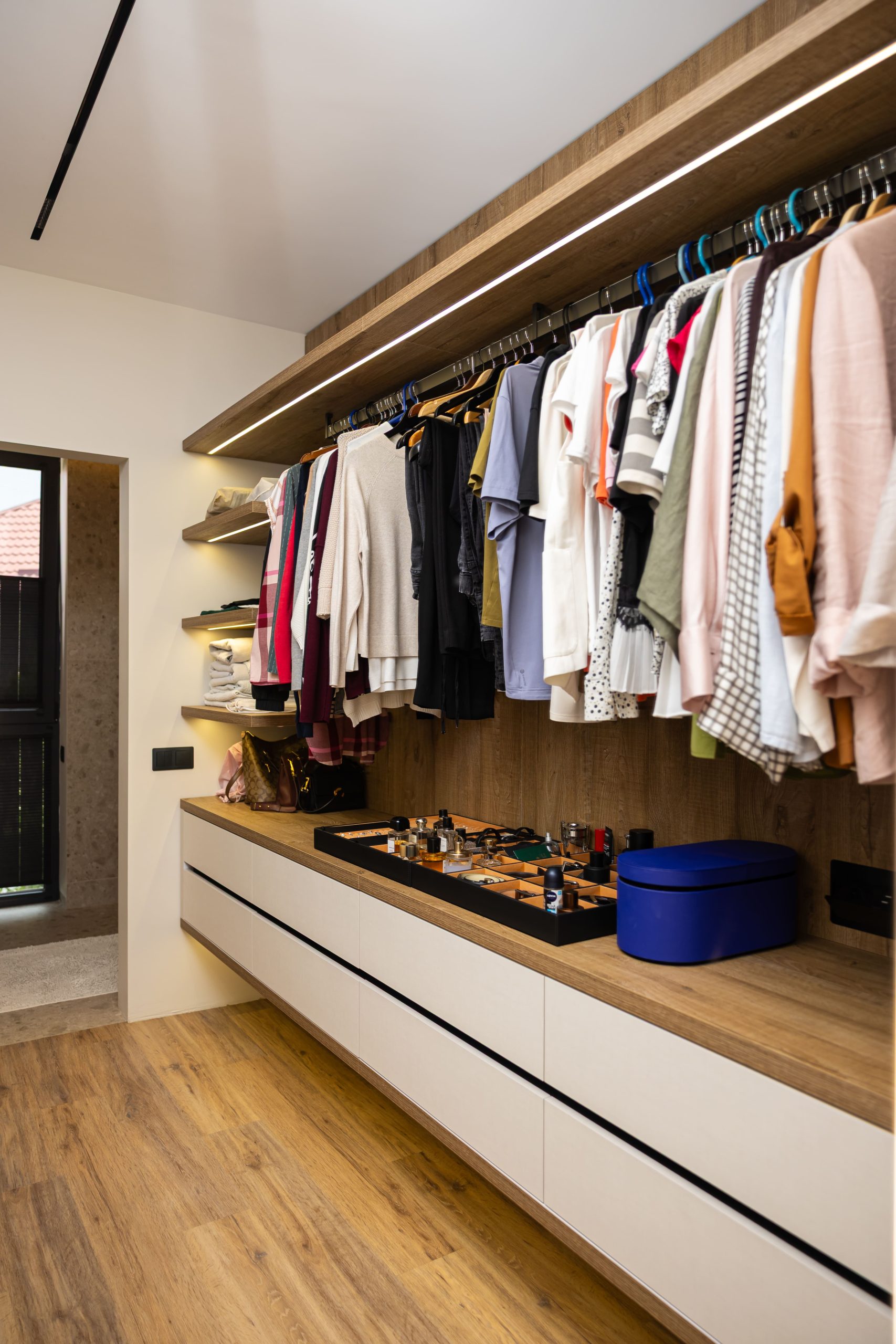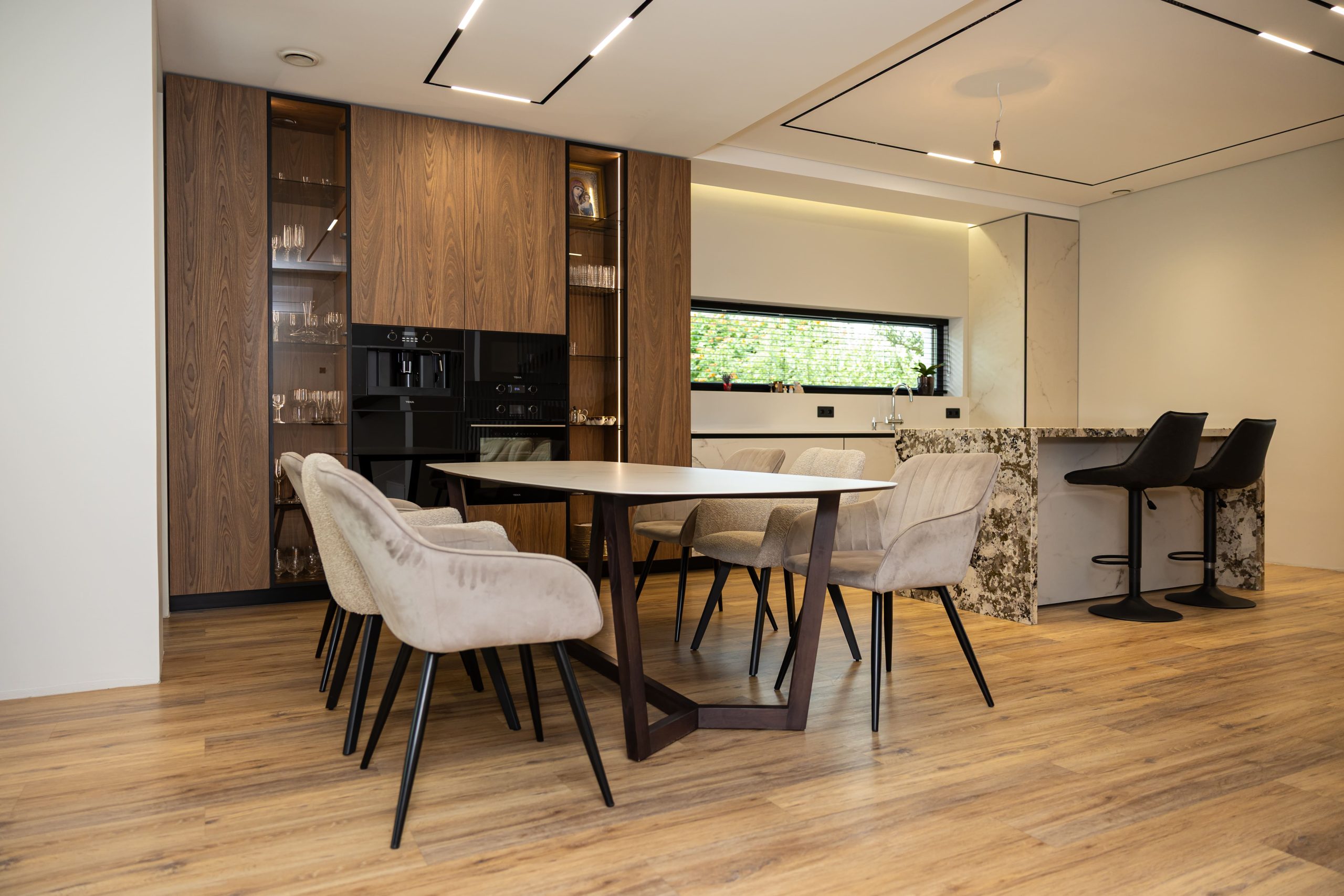 Acest proiect pune accent pe echilibrul dintre estetică și funcționalitate, printr-o amenajare completă realizată cu mobilier personalizat, adaptat fiecărui spațiu din locuință. La primul nivel, zona de living și bucătărie este definită de contraste elegante între texturi calde și suprafețe moderne, completate de soluții integrate de depozitare. Un element distinct este spațiul de sub scară, transformat într-un sistem discret și eficient de organizare. Zona de baie și spațiul de laundry completează funcționalitatea acestui nivel, fără a încărca vizual interiorul. La etaj, dormitorul matrimonial este gândit ca un spațiu relaxant, cu o garderobă bine organizată și iluminare ambientală integrată. Camerele copiilor includ birouri și spații de depozitare adaptate utilizării zilnice, iar zona de baie păstrează aceeași linie modernă, cu mobilier minimalist și finisaje atent alese.