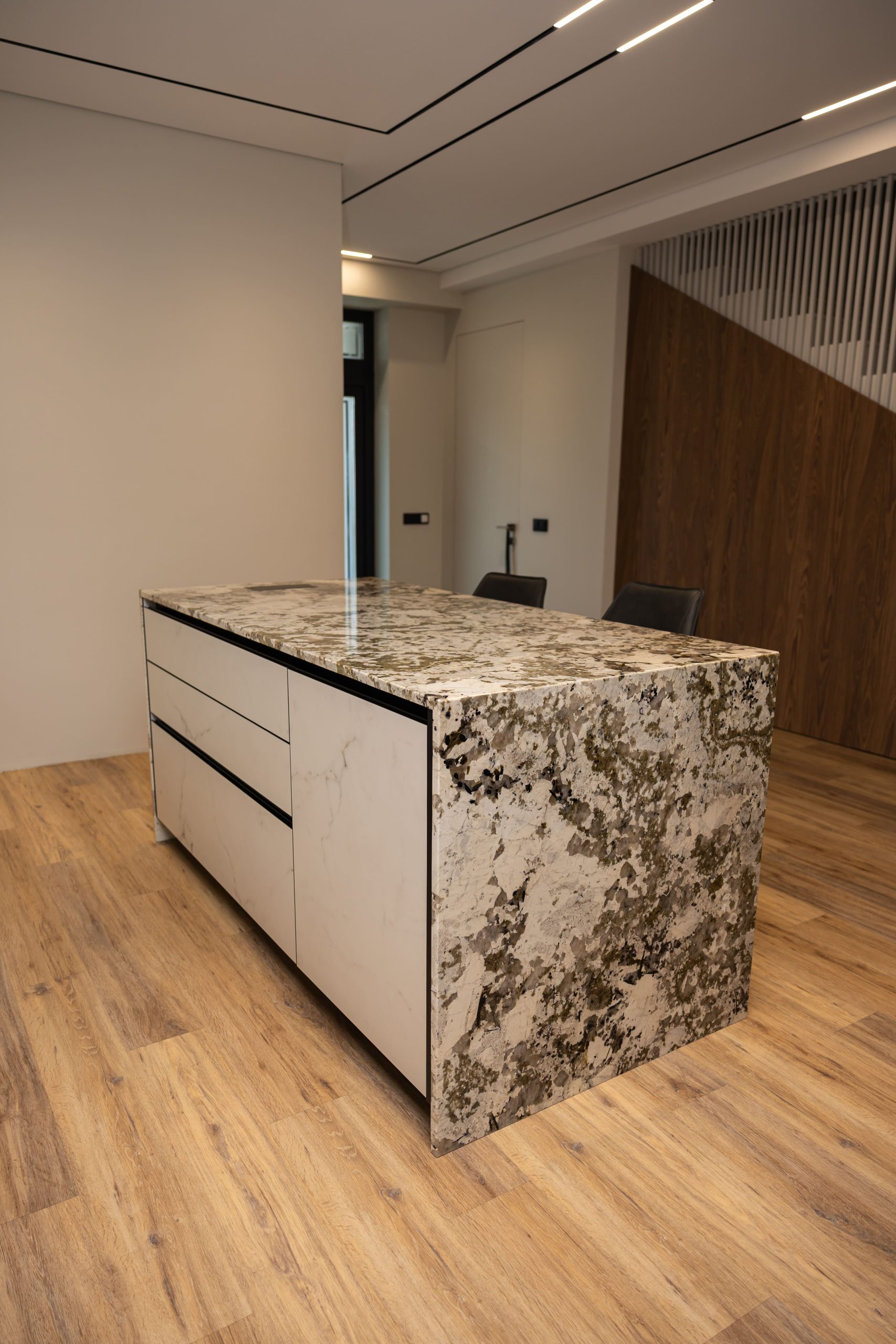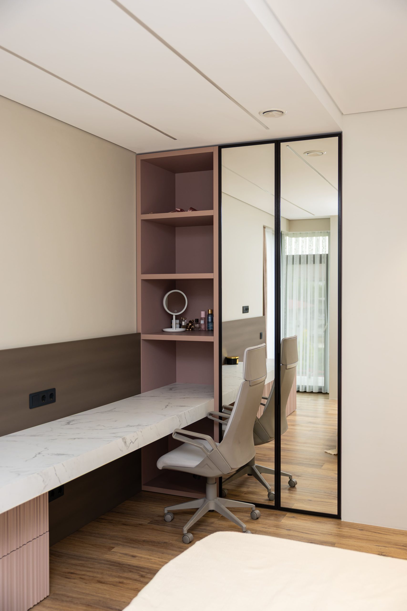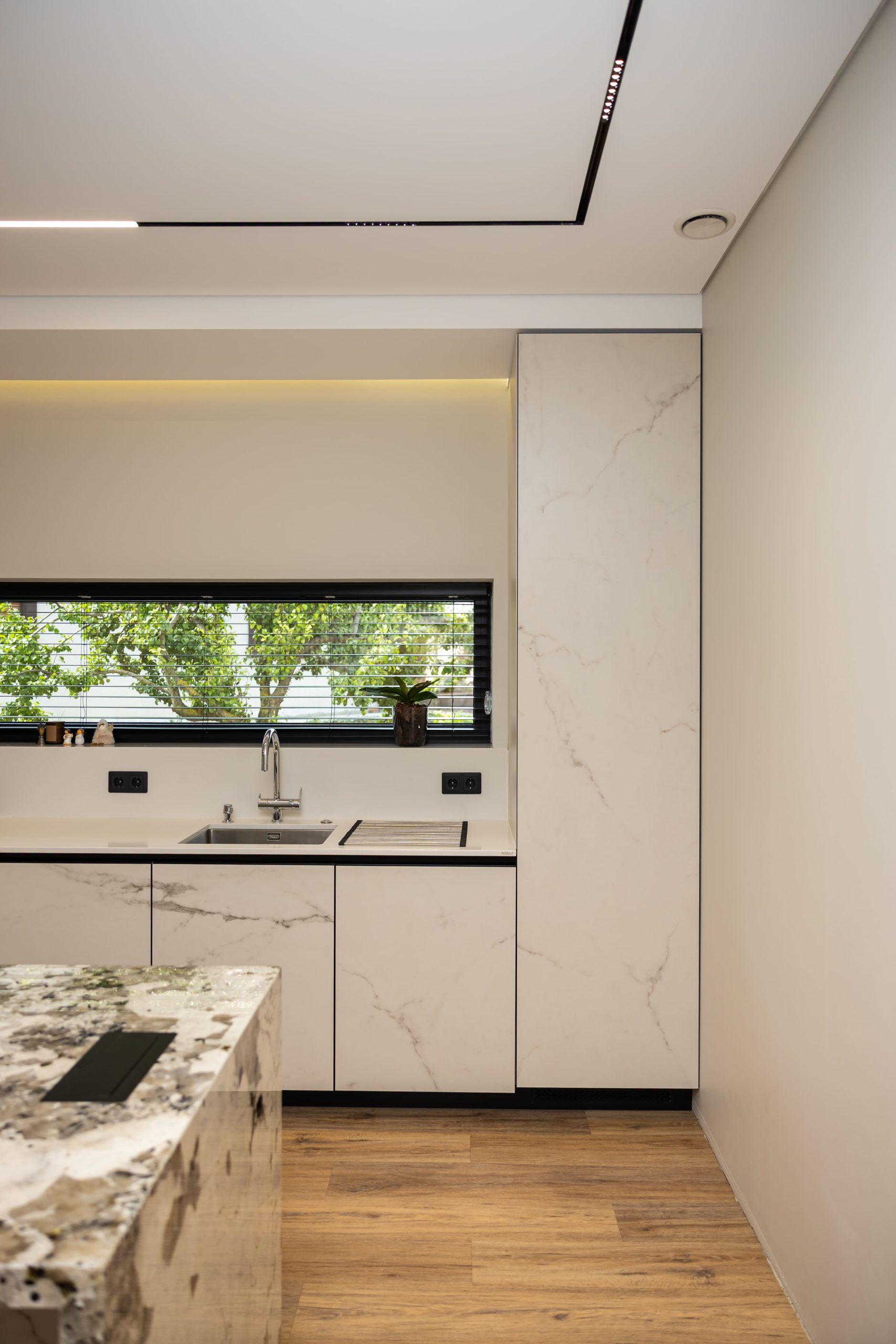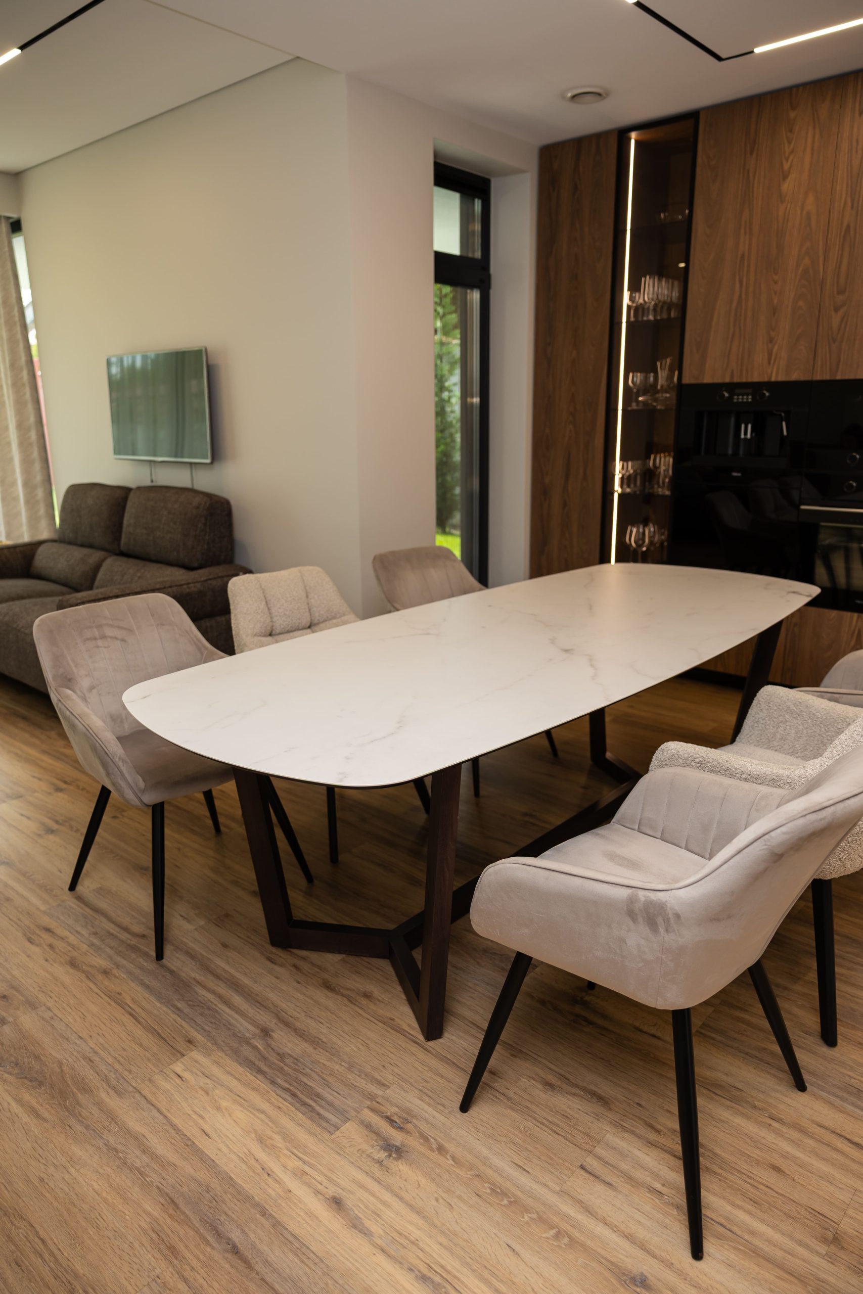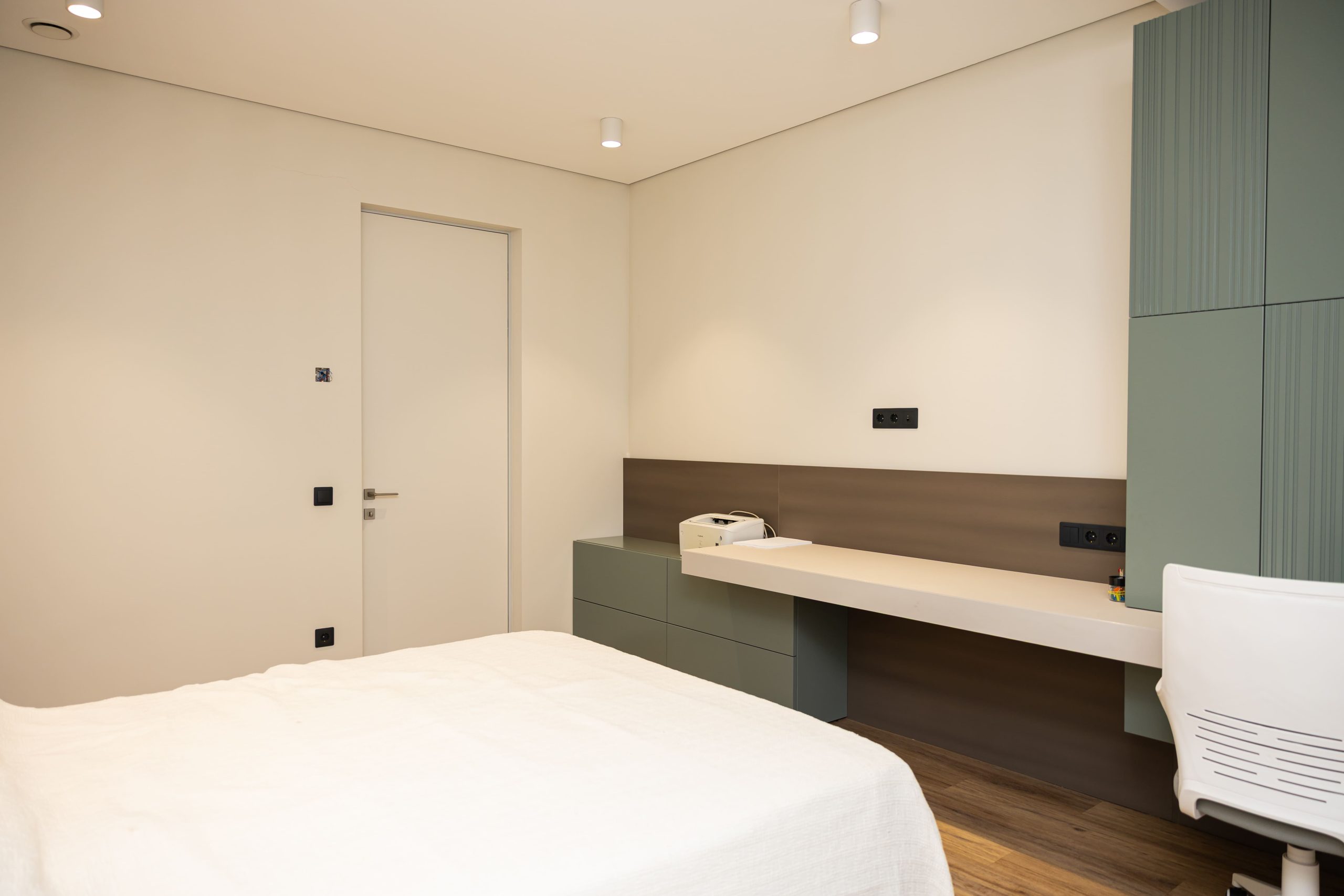 Acest proiect pune accent pe echilibrul dintre estetică și funcționalitate, printr-o amenajare completă realizată cu mobilier personalizat, adaptat fiecărui spațiu din locuință. La primul nivel, zona de living și bucătărie este definită de contraste elegante între texturi calde și suprafețe moderne, completate de soluții integrate de depozitare. Un element distinct este spațiul de sub scară, transformat într-un sistem discret și eficient de organizare. Zona de baie și spațiul de laundry completează funcționalitatea acestui nivel, fără a încărca vizual interiorul. La etaj, dormitorul matrimonial este gândit ca un spațiu relaxant, cu o garderobă bine organizată și iluminare ambientală integrată. Camerele copiilor includ birouri și spații de depozitare adaptate utilizării zilnice, iar zona de baie păstrează aceeași linie modernă, cu mobilier minimalist și finisaje atent alese.