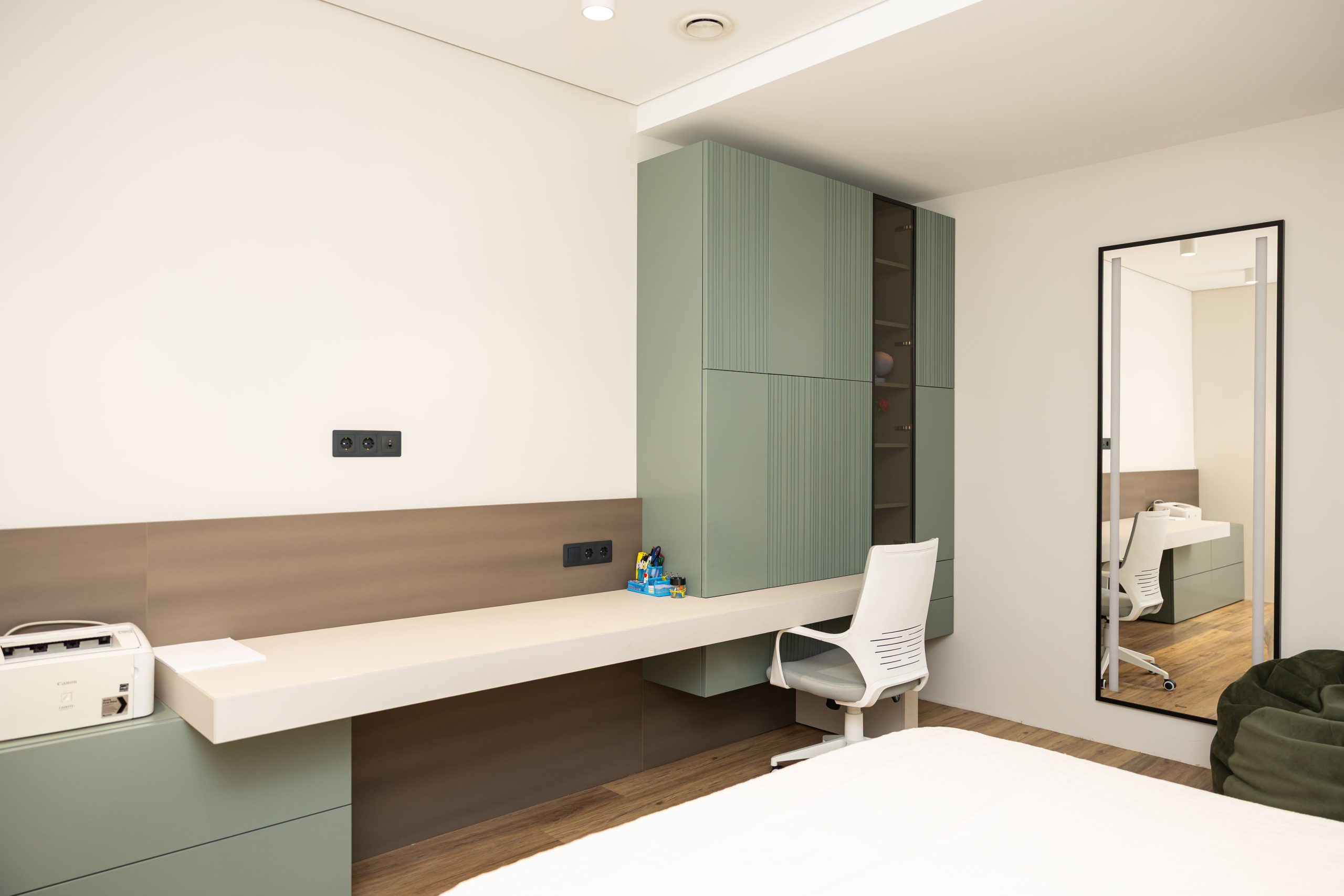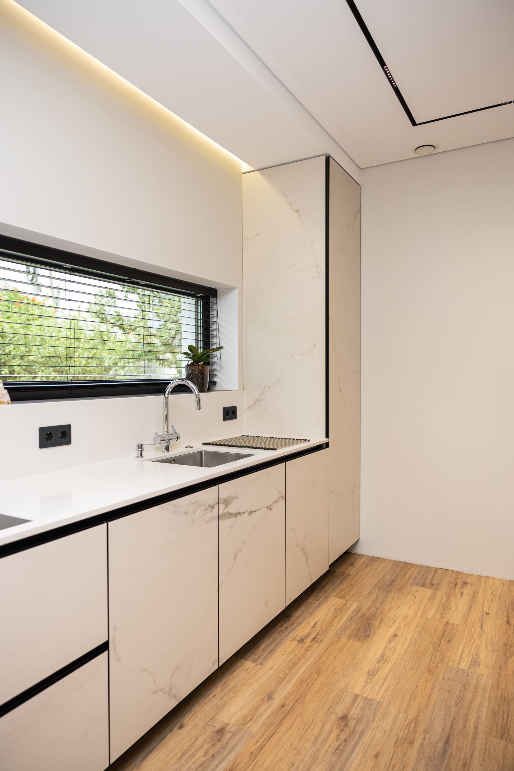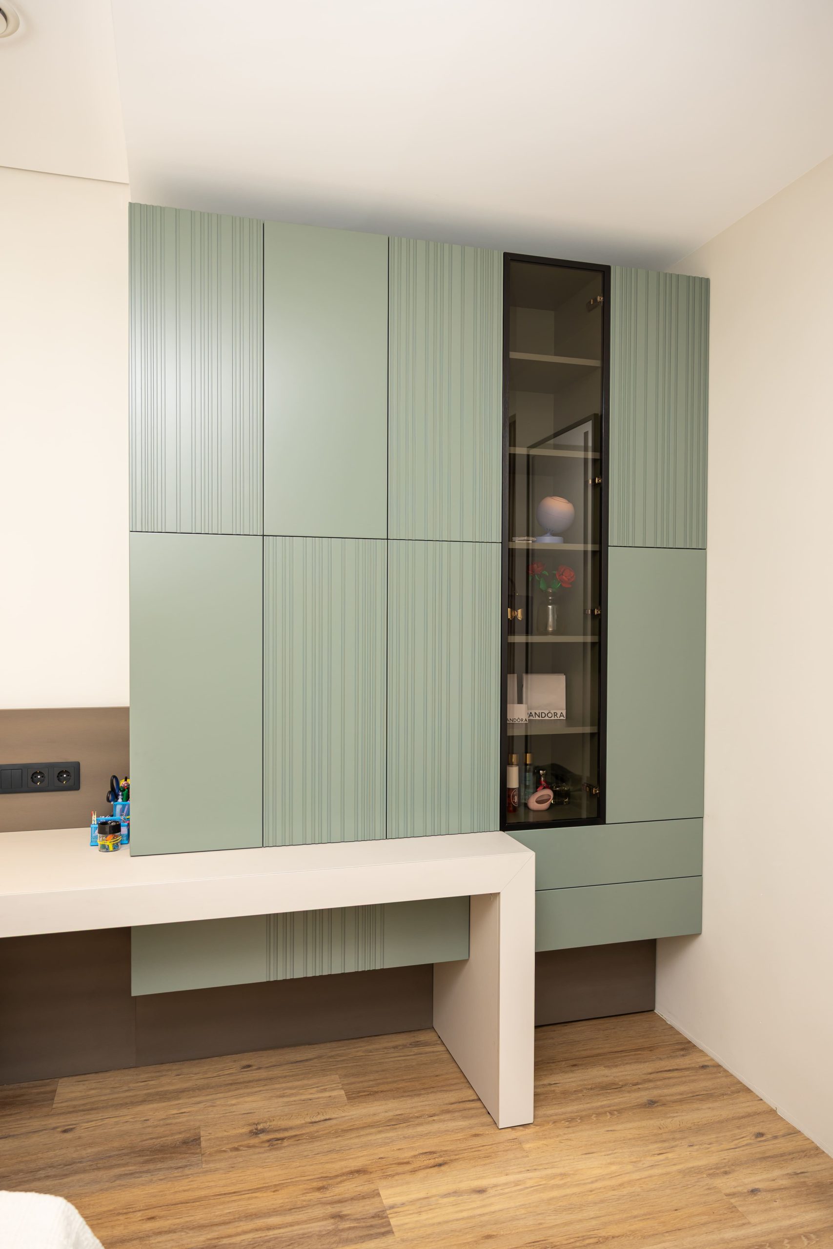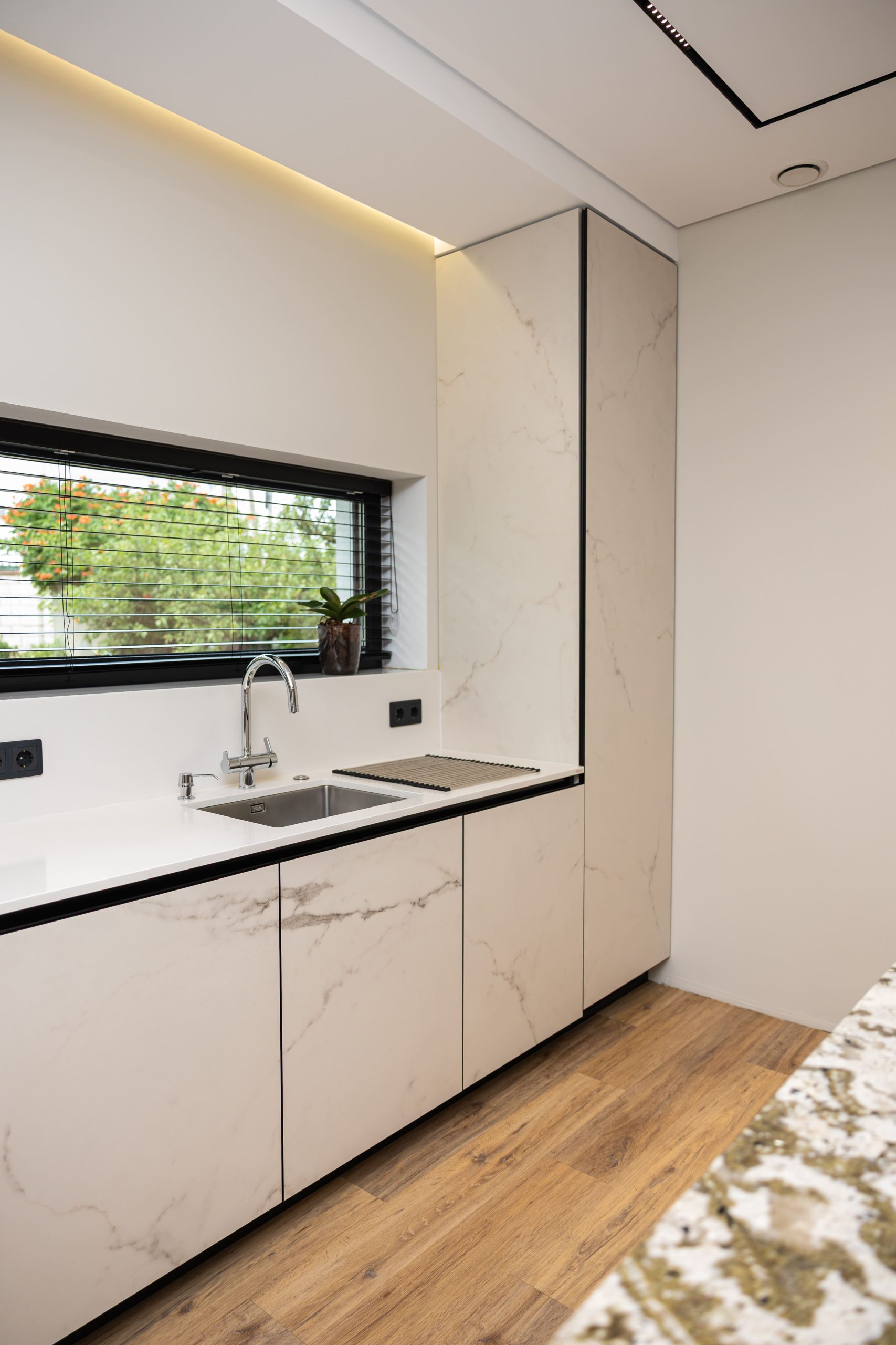 Acest proiect pune accent pe echilibrul dintre estetică și funcționalitate, printr-o amenajare completă realizată cu mobilier personalizat, adaptat fiecărui spațiu din locuință. La primul nivel, zona de living și bucătărie este definită de contraste elegante între texturi calde și suprafețe moderne, completate de soluții integrate de depozitare. Un element distinct este spațiul de sub scară, transformat într-un sistem discret și eficient de organizare. Zona de baie și spațiul de laundry completează funcționalitatea acestui nivel, fără a încărca vizual interiorul. La etaj, dormitorul matrimonial este gândit ca un spațiu relaxant, cu o garderobă bine organizată și iluminare ambientală integrată. Camerele copiilor includ birouri și spații de depozitare adaptate utilizării zilnice, iar zona de baie păstrează aceeași linie modernă, cu mobilier minimalist și finisaje atent alese.