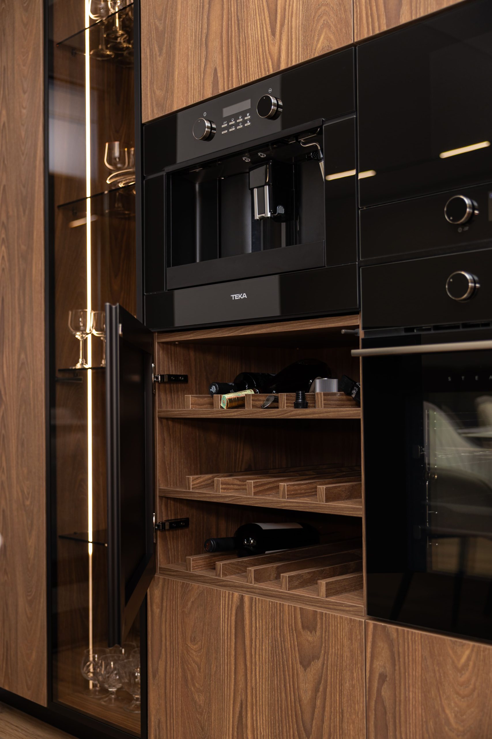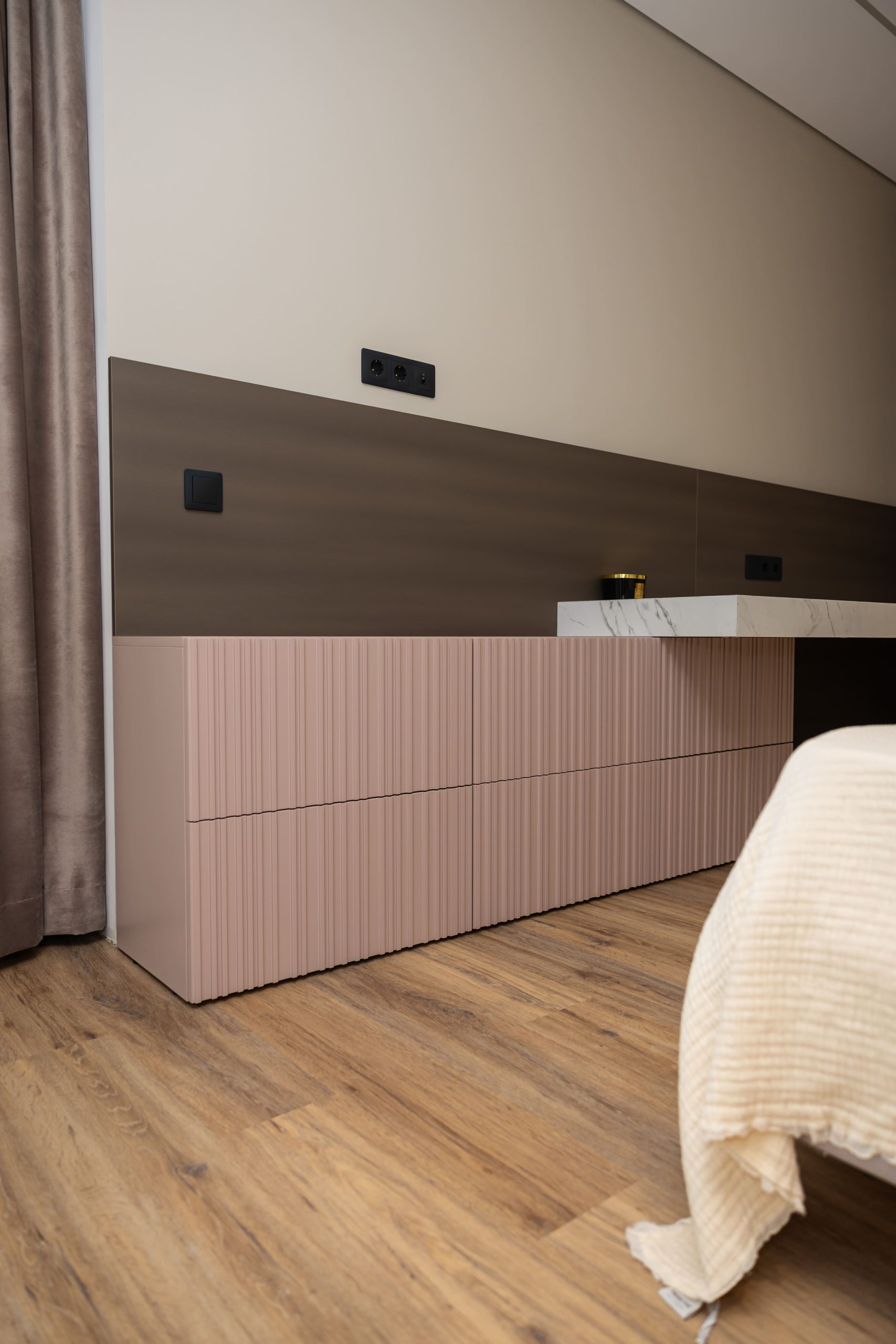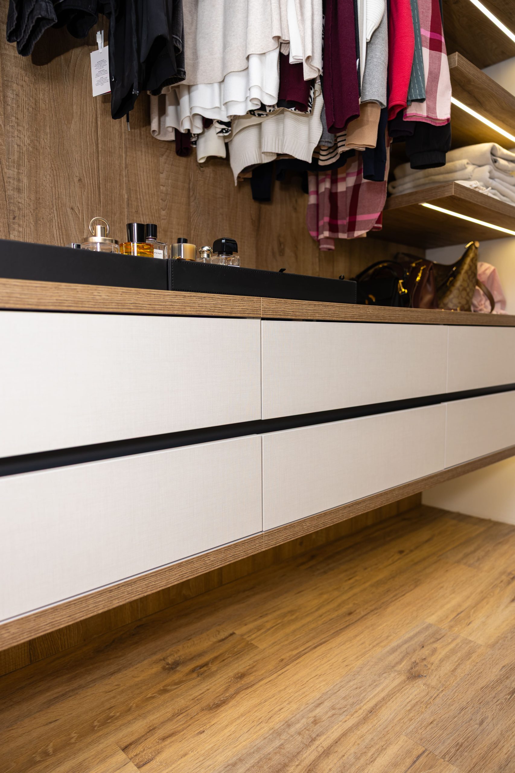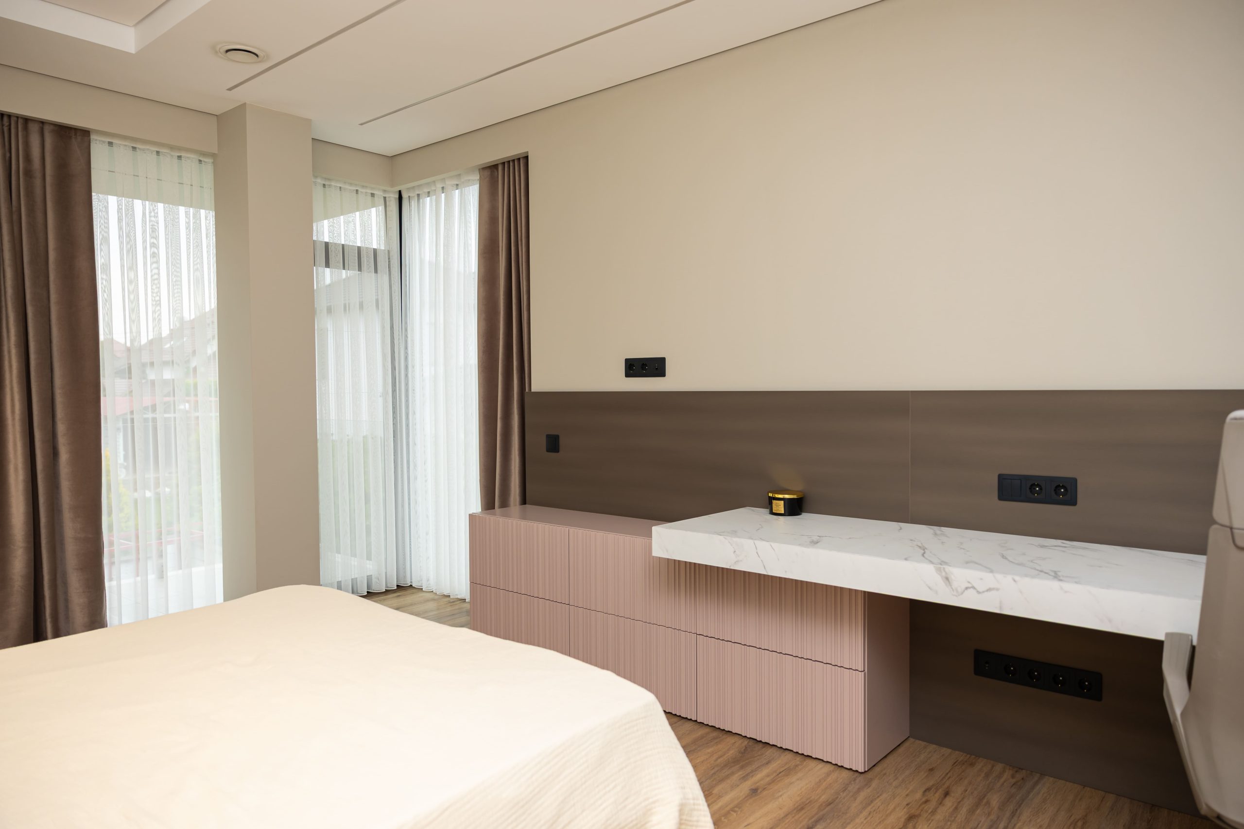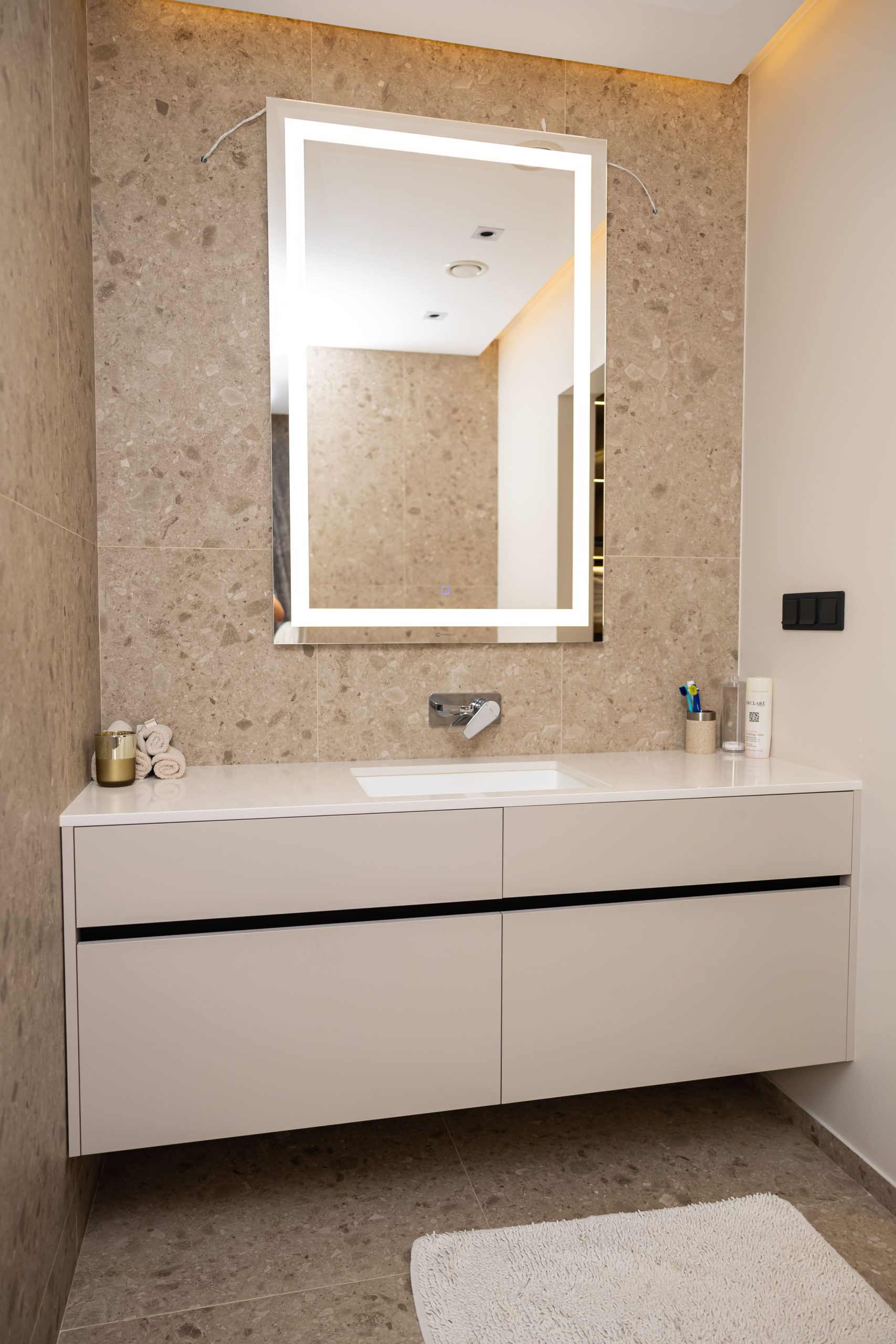 Acest proiect pune accent pe echilibrul dintre estetică și funcționalitate, printr-o amenajare completă realizată cu mobilier personalizat, adaptat fiecărui spațiu din locuință. La primul nivel, zona de living și bucătărie este definită de contraste elegante între texturi calde și suprafețe moderne, completate de soluții integrate de depozitare. Un element distinct este spațiul de sub scară, transformat într-un sistem discret și eficient de organizare. Zona de baie și spațiul de laundry completează funcționalitatea acestui nivel, fără a încărca vizual interiorul. La etaj, dormitorul matrimonial este gândit ca un spațiu relaxant, cu o garderobă bine organizată și iluminare ambientală integrată. Camerele copiilor includ birouri și spații de depozitare adaptate utilizării zilnice, iar zona de baie păstrează aceeași linie modernă, cu mobilier minimalist și finisaje atent alese.
