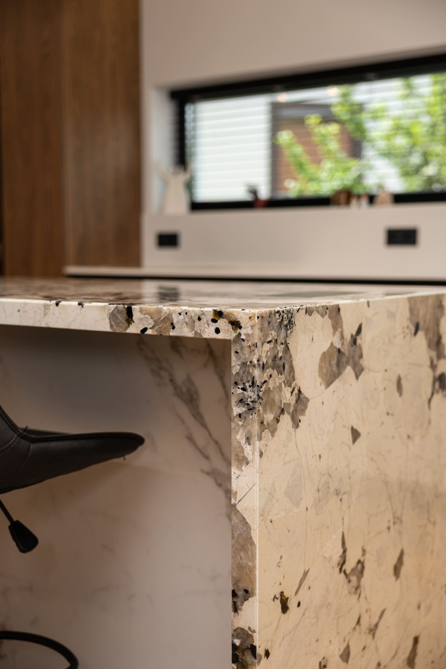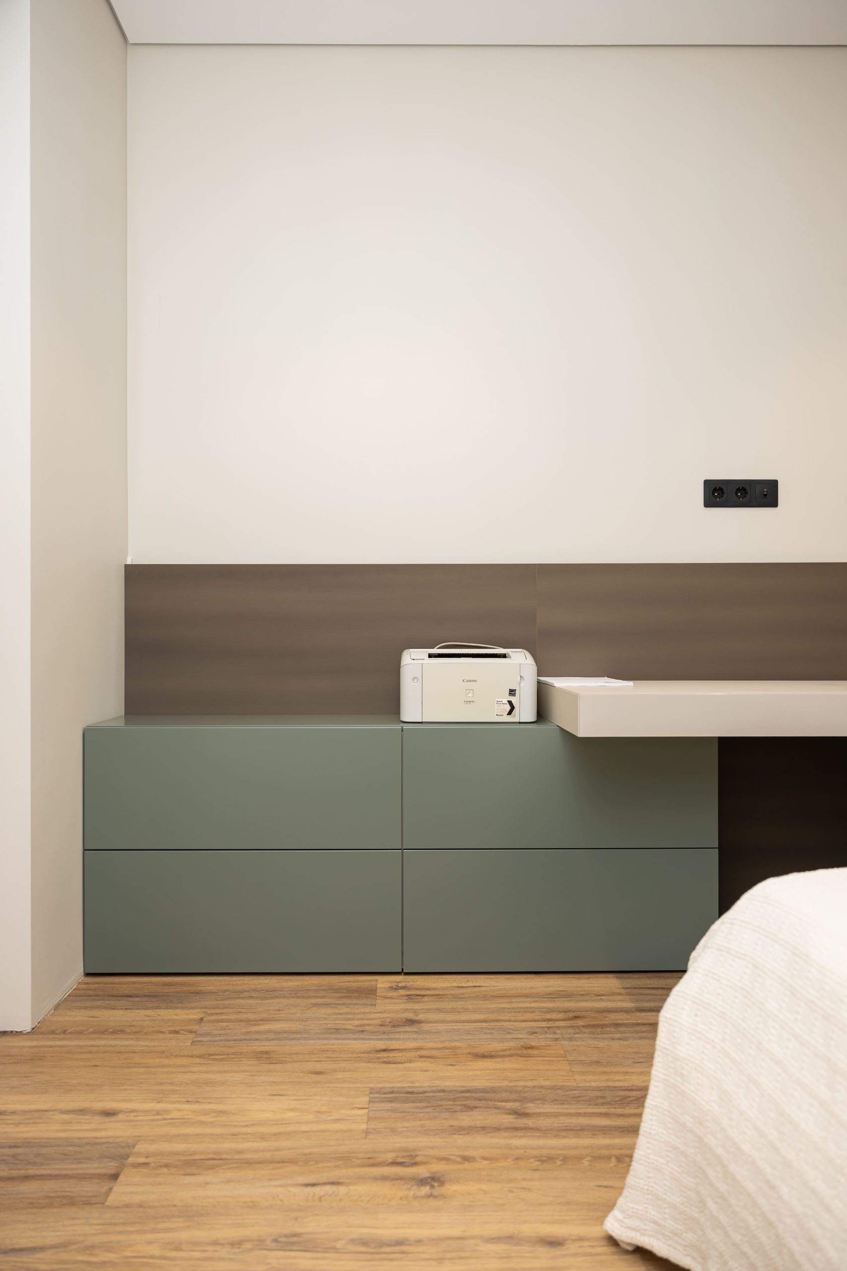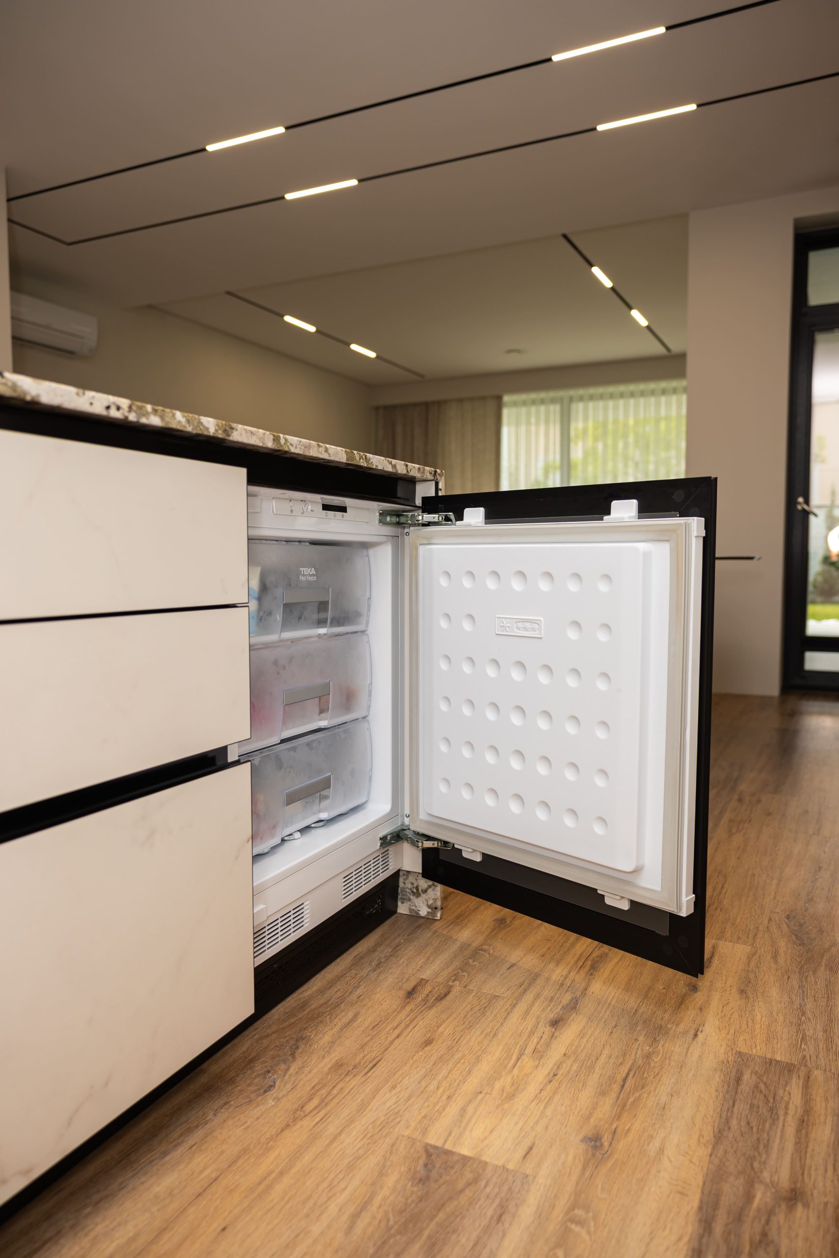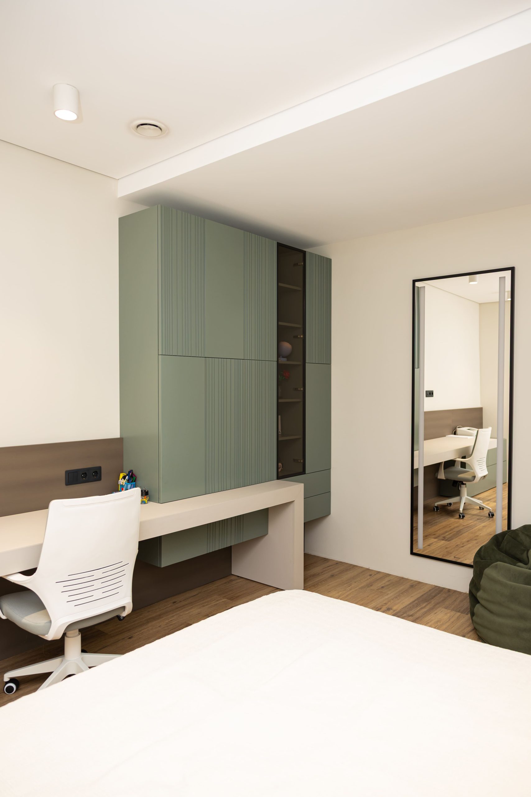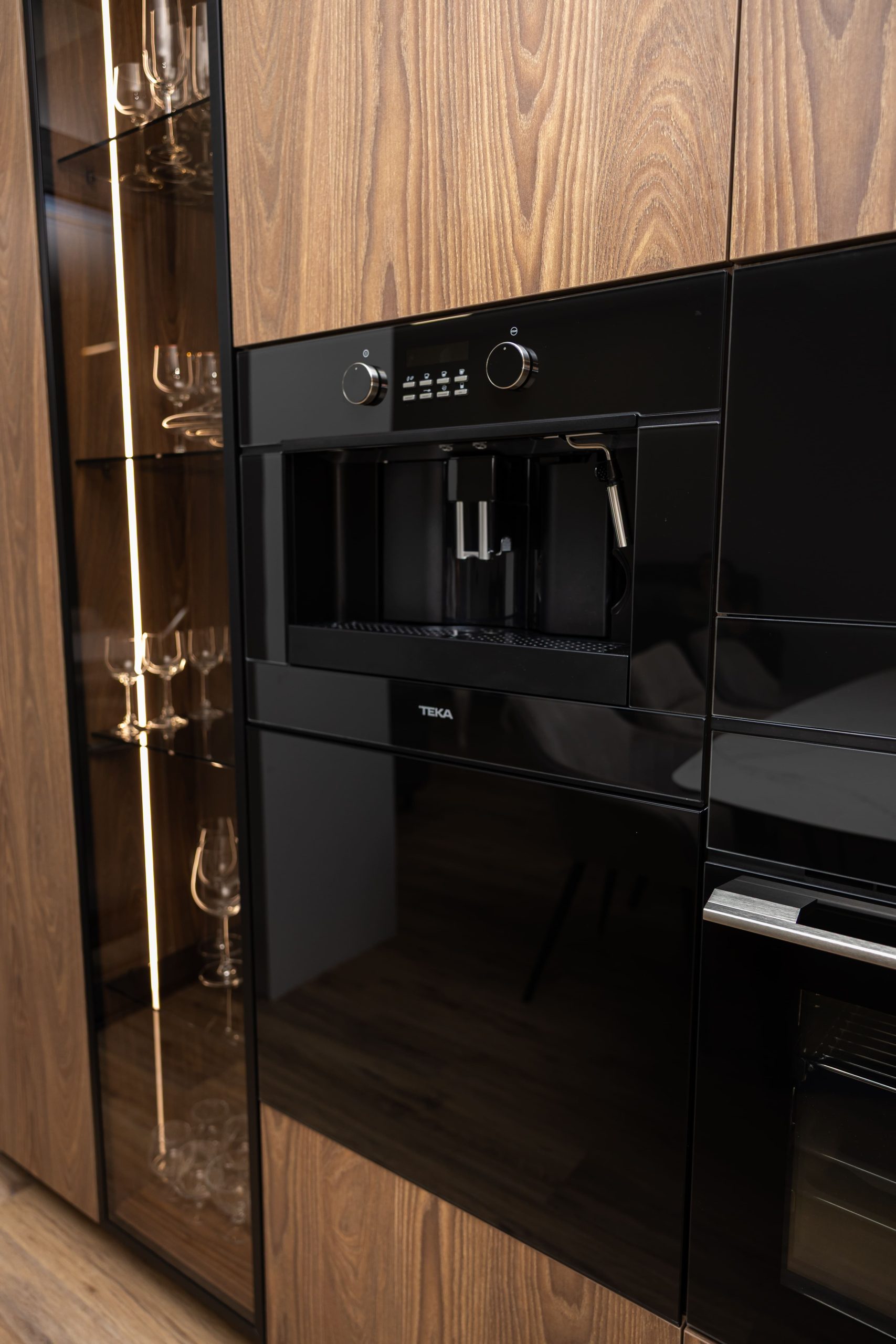 Acest proiect pune accent pe echilibrul dintre estetică și funcționalitate, printr-o amenajare completă realizată cu mobilier personalizat, adaptat fiecărui spațiu din locuință. La primul nivel, zona de living și bucătărie este definită de contraste elegante între texturi calde și suprafețe moderne, completate de soluții integrate de depozitare. Un element distinct este spațiul de sub scară, transformat într-un sistem discret și eficient de organizare. Zona de baie și spațiul de laundry completează funcționalitatea acestui nivel, fără a încărca vizual interiorul. La etaj, dormitorul matrimonial este gândit ca un spațiu relaxant, cu o garderobă bine organizată și iluminare ambientală integrată. Camerele copiilor includ birouri și spații de depozitare adaptate utilizării zilnice, iar zona de baie păstrează aceeași linie modernă, cu mobilier minimalist și finisaje atent alese.