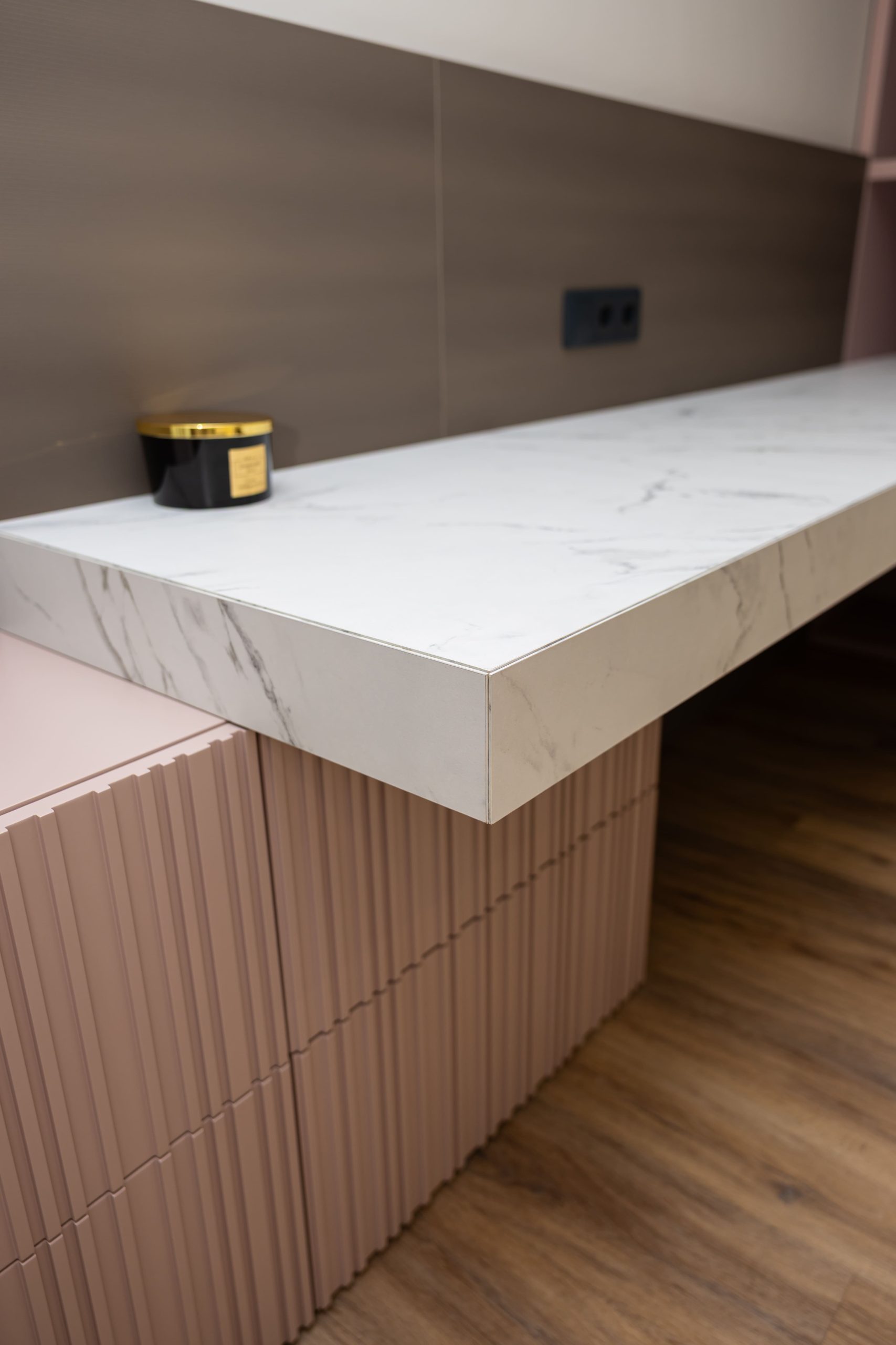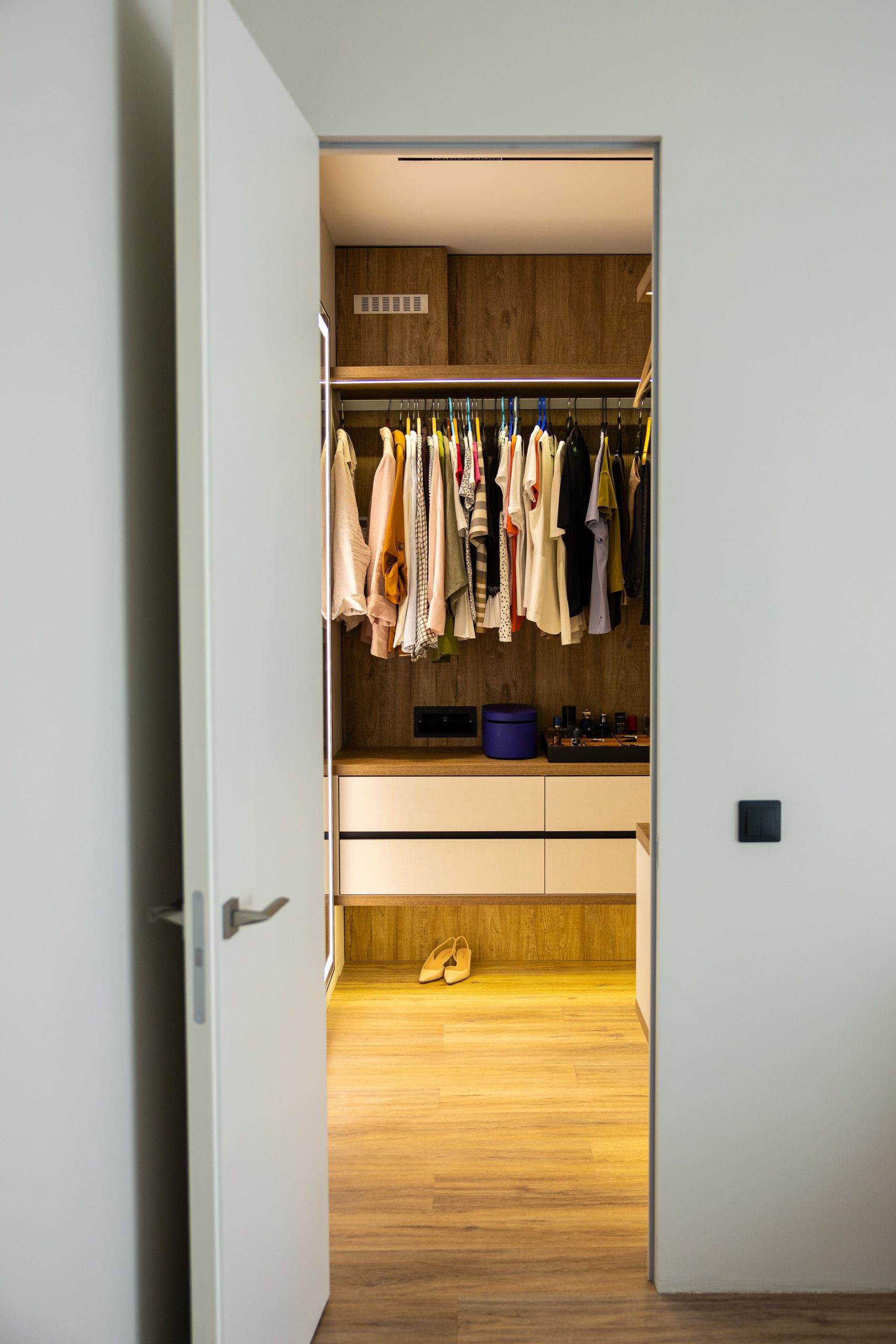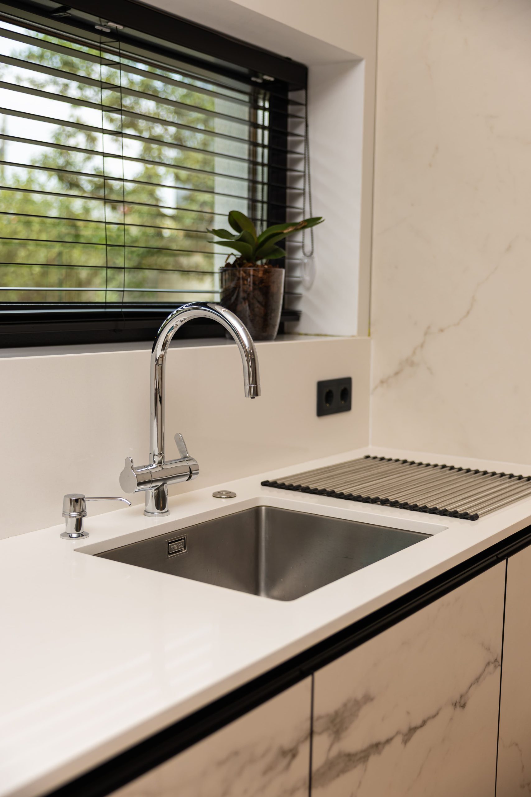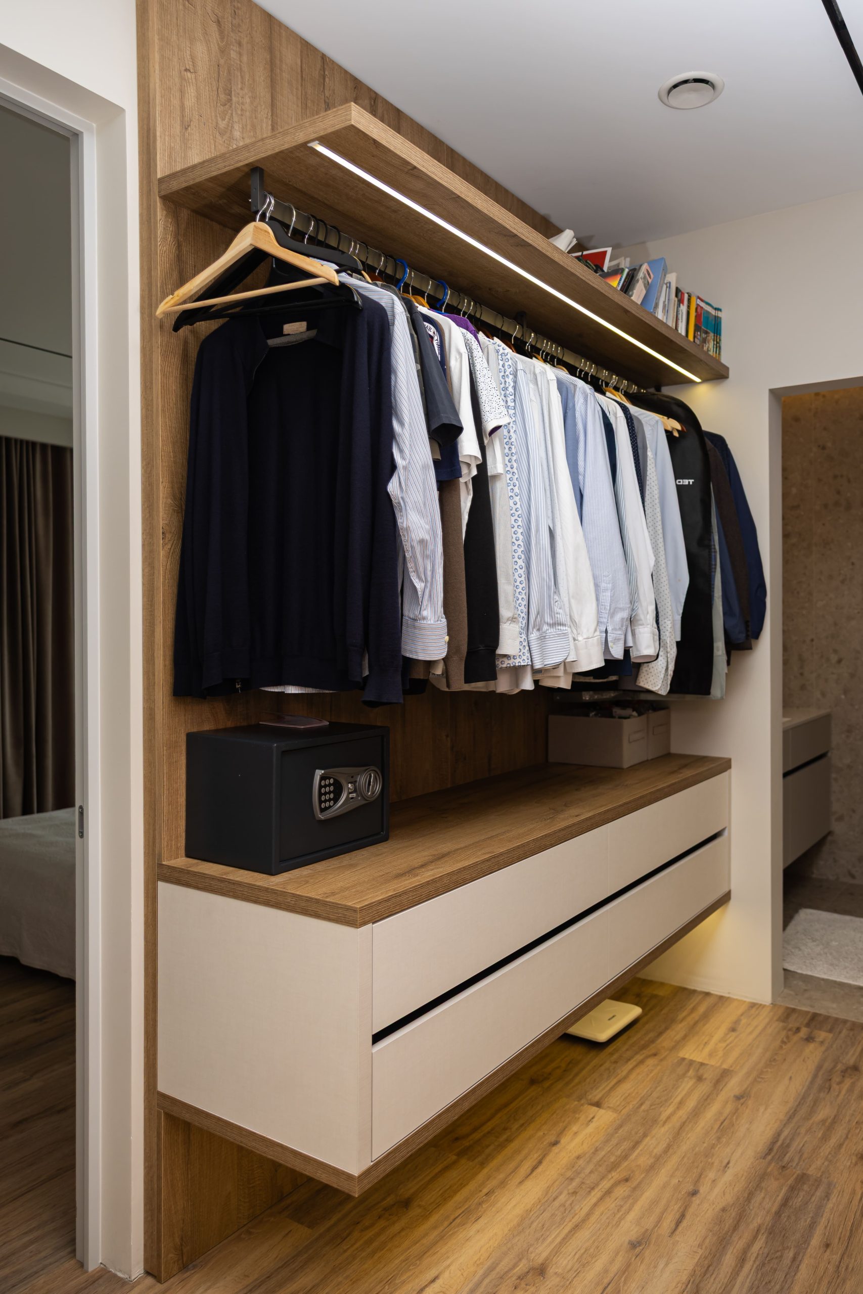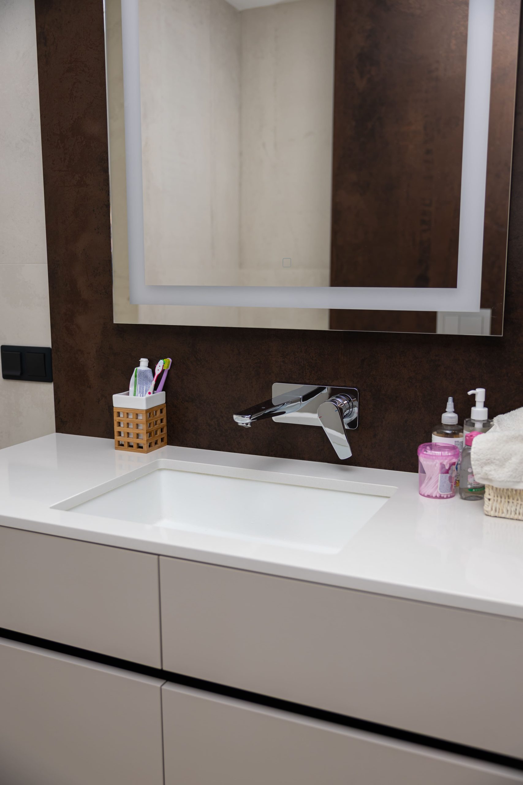 Acest proiect pune accent pe echilibrul dintre estetică și funcționalitate, printr-o amenajare completă realizată cu mobilier personalizat, adaptat fiecărui spațiu din locuință. La primul nivel, zona de living și bucătărie este definită de contraste elegante între texturi calde și suprafețe moderne, completate de soluții integrate de depozitare. Un element distinct este spațiul de sub scară, transformat într-un sistem discret și eficient de organizare. Zona de baie și spațiul de laundry completează funcționalitatea acestui nivel, fără a încărca vizual interiorul. La etaj, dormitorul matrimonial este gândit ca un spațiu relaxant, cu o garderobă bine organizată și iluminare ambientală integrată. Camerele copiilor includ birouri și spații de depozitare adaptate utilizării zilnice, iar zona de baie păstrează aceeași linie modernă, cu mobilier minimalist și finisaje atent alese.