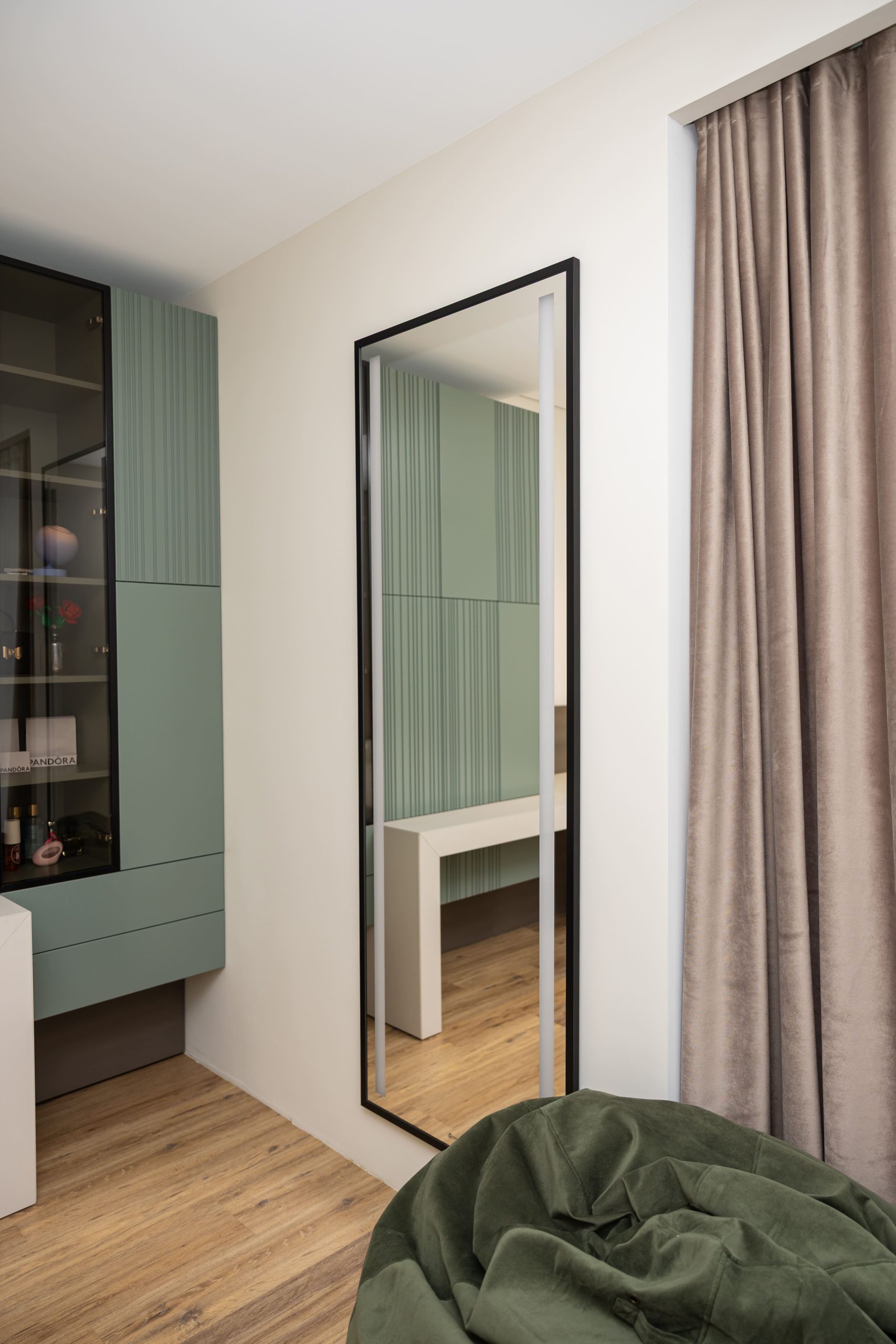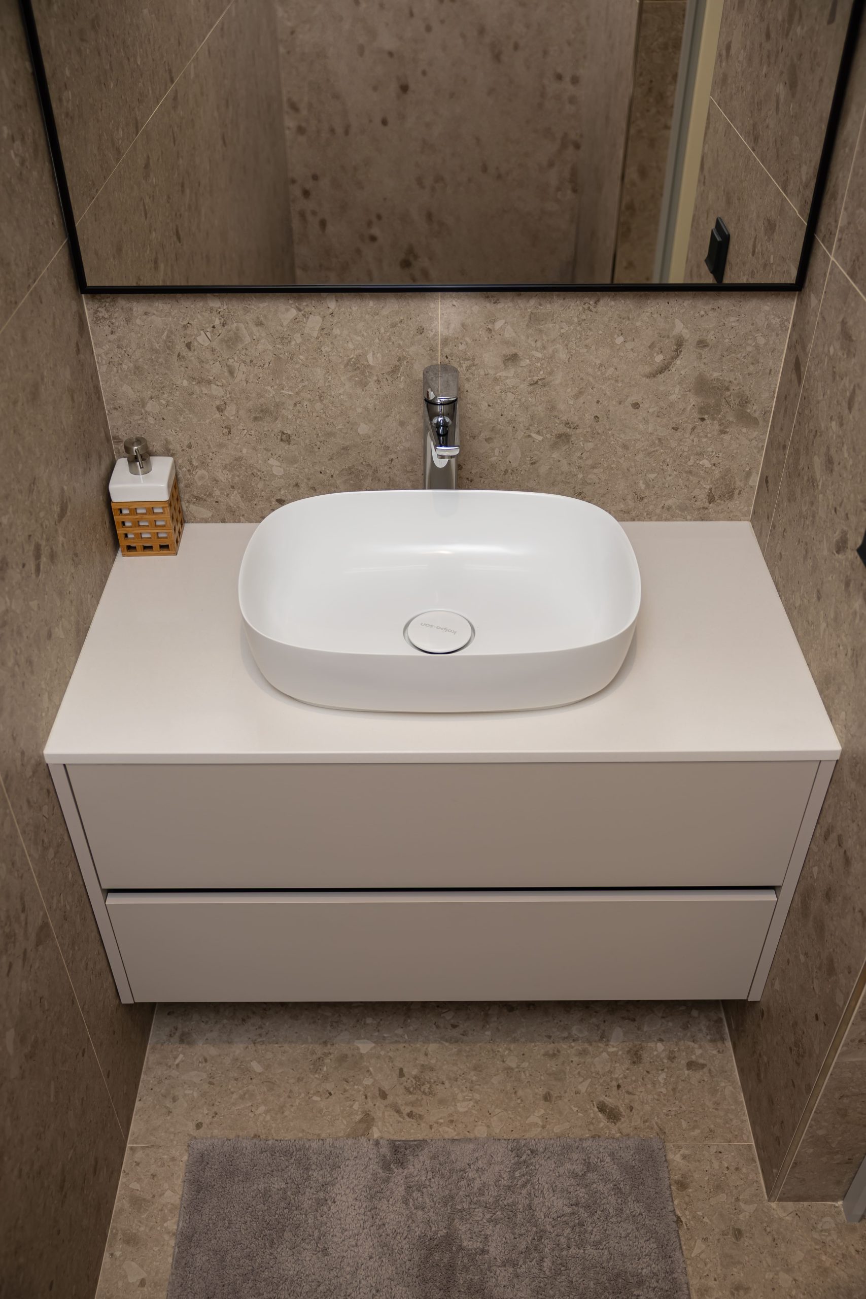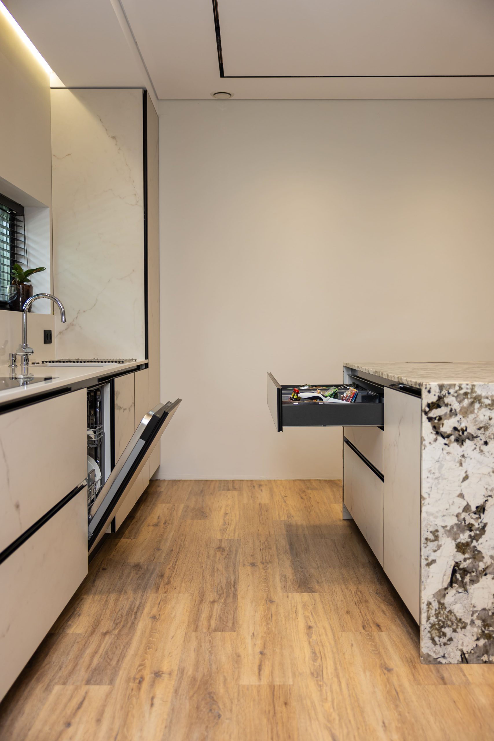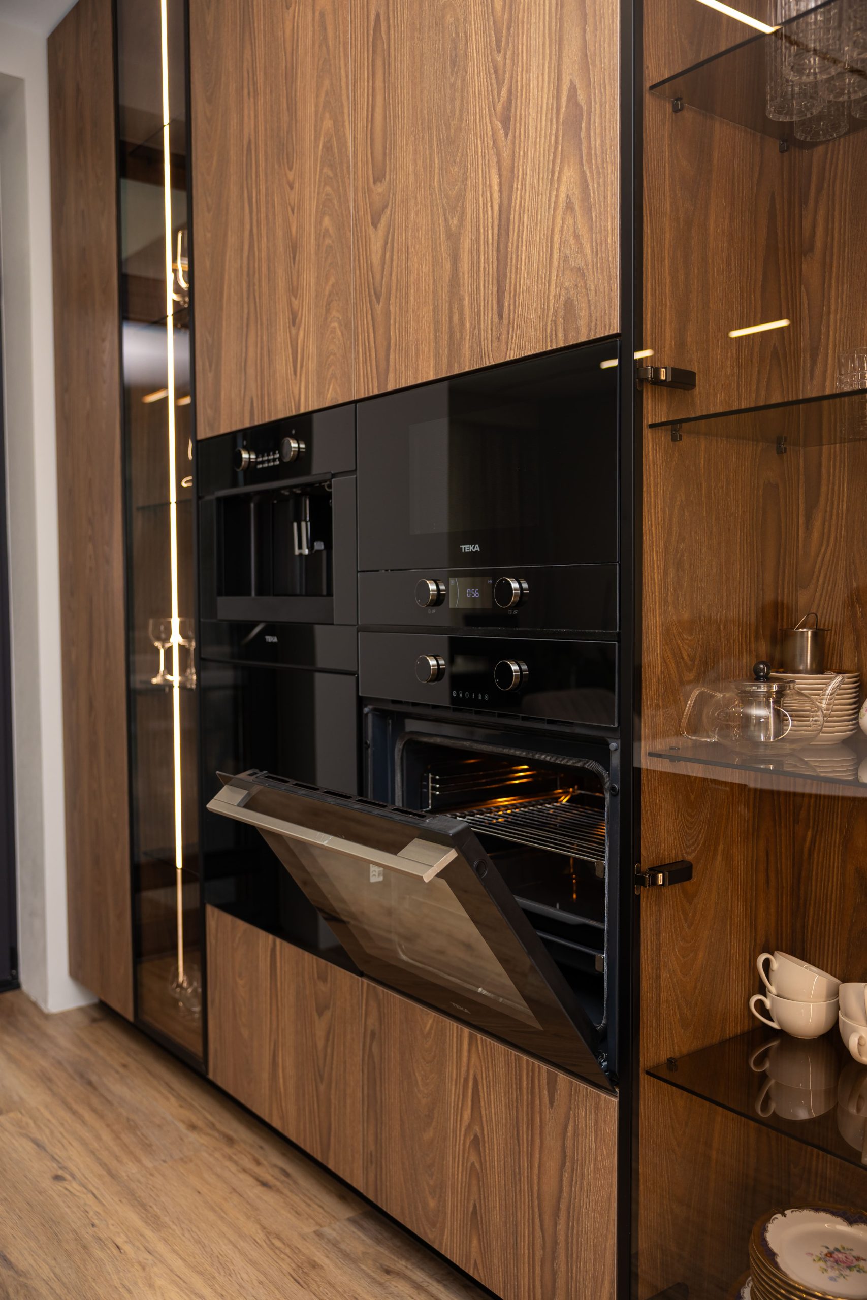 Acest proiect pune accent pe echilibrul dintre estetică și funcționalitate, printr-o amenajare completă realizată cu mobilier personalizat, adaptat fiecărui spațiu din locuință. La primul nivel, zona de living și bucătărie este definită de contraste elegante între texturi calde și suprafețe moderne, completate de soluții integrate de depozitare. Un element distinct este spațiul de sub scară, transformat într-un sistem discret și eficient de organizare. Zona de baie și spațiul de laundry completează funcționalitatea acestui nivel, fără a încărca vizual interiorul. La etaj, dormitorul matrimonial este gândit ca un spațiu relaxant, cu o garderobă bine organizată și iluminare ambientală integrată. Camerele copiilor includ birouri și spații de depozitare adaptate utilizării zilnice, iar zona de baie păstrează aceeași linie modernă, cu mobilier minimalist și finisaje atent alese.