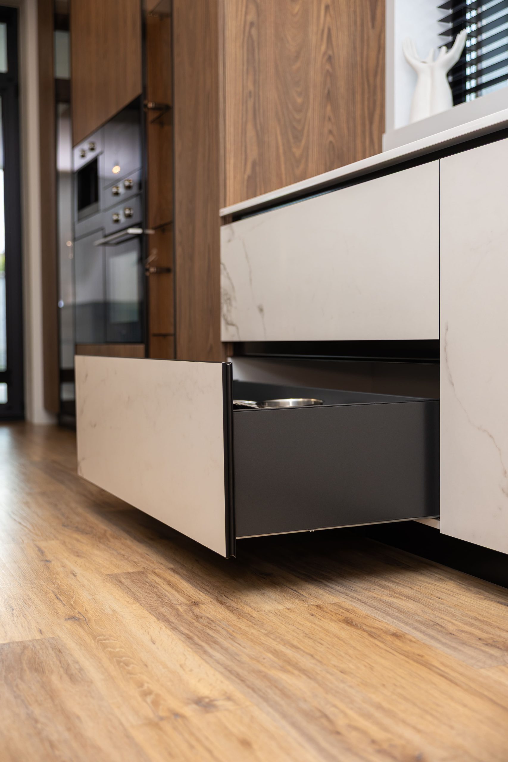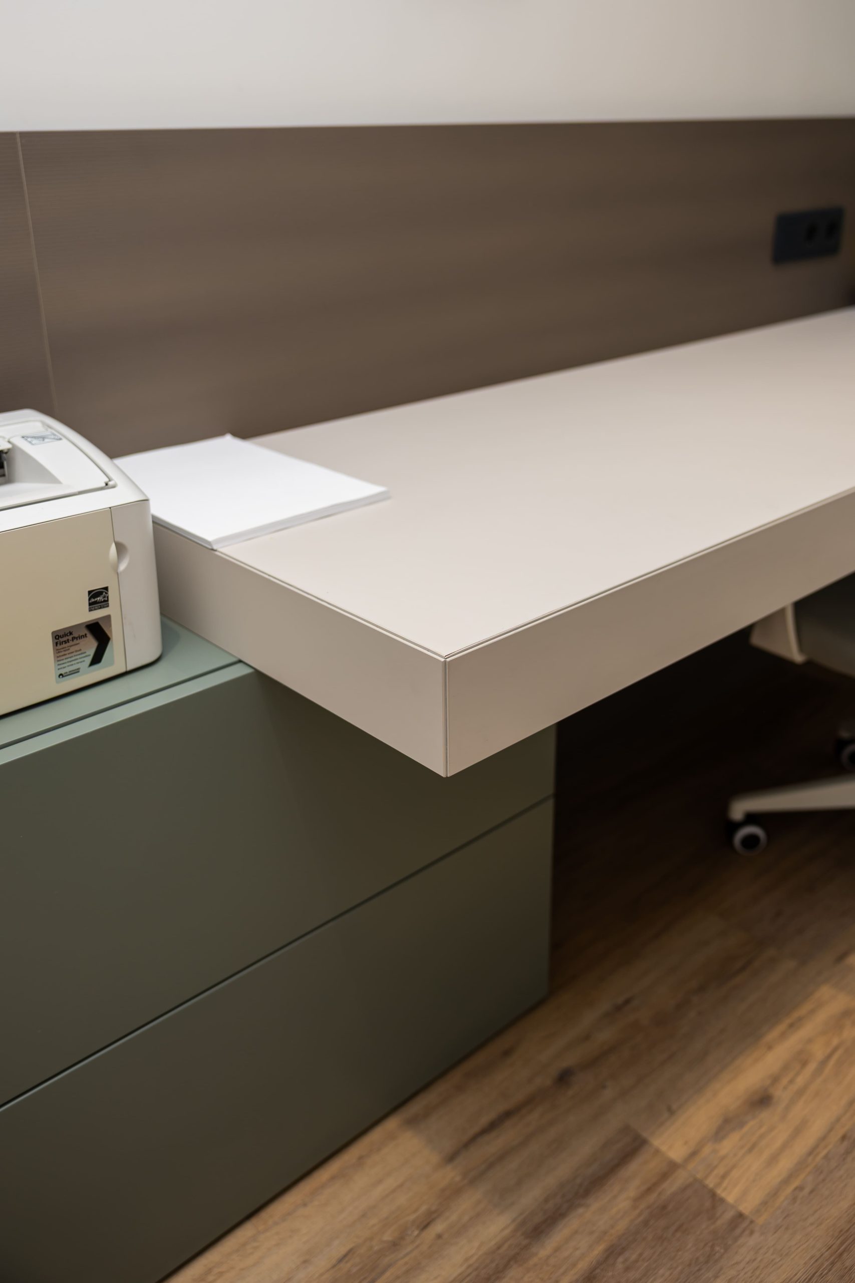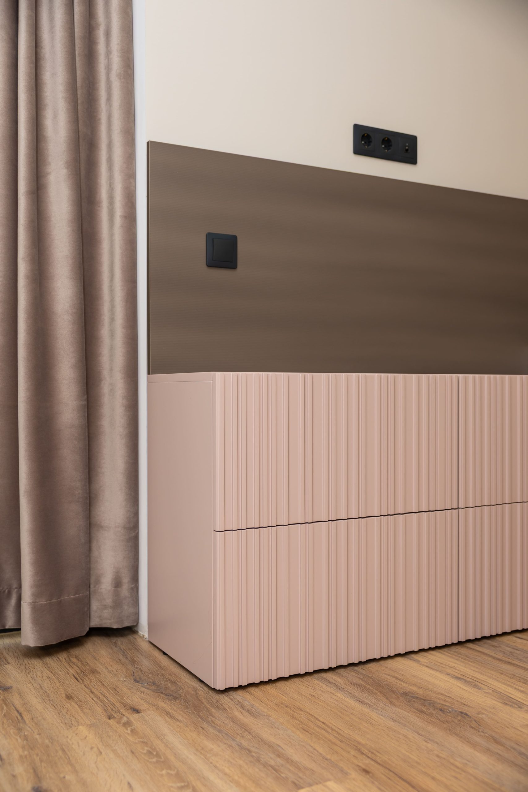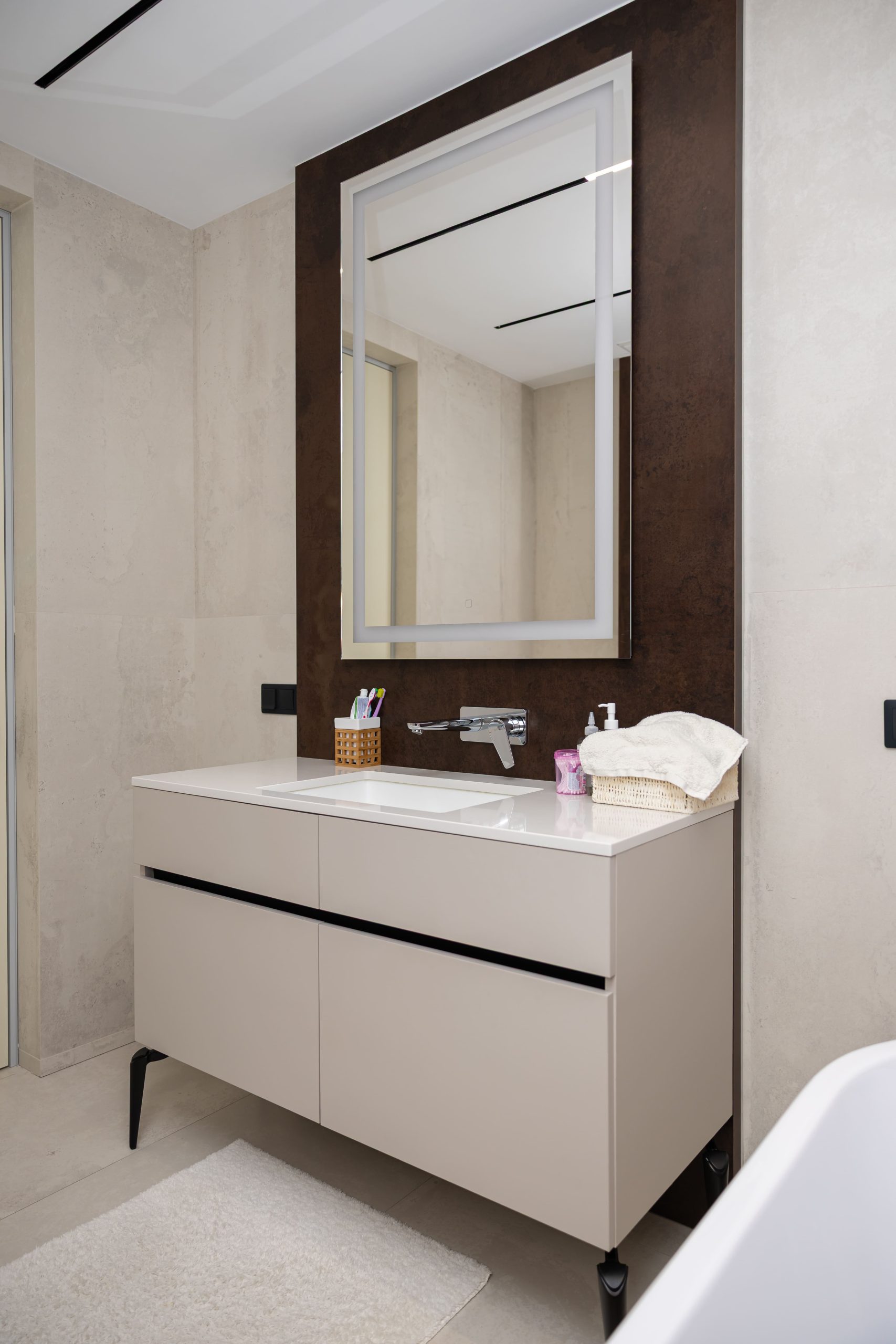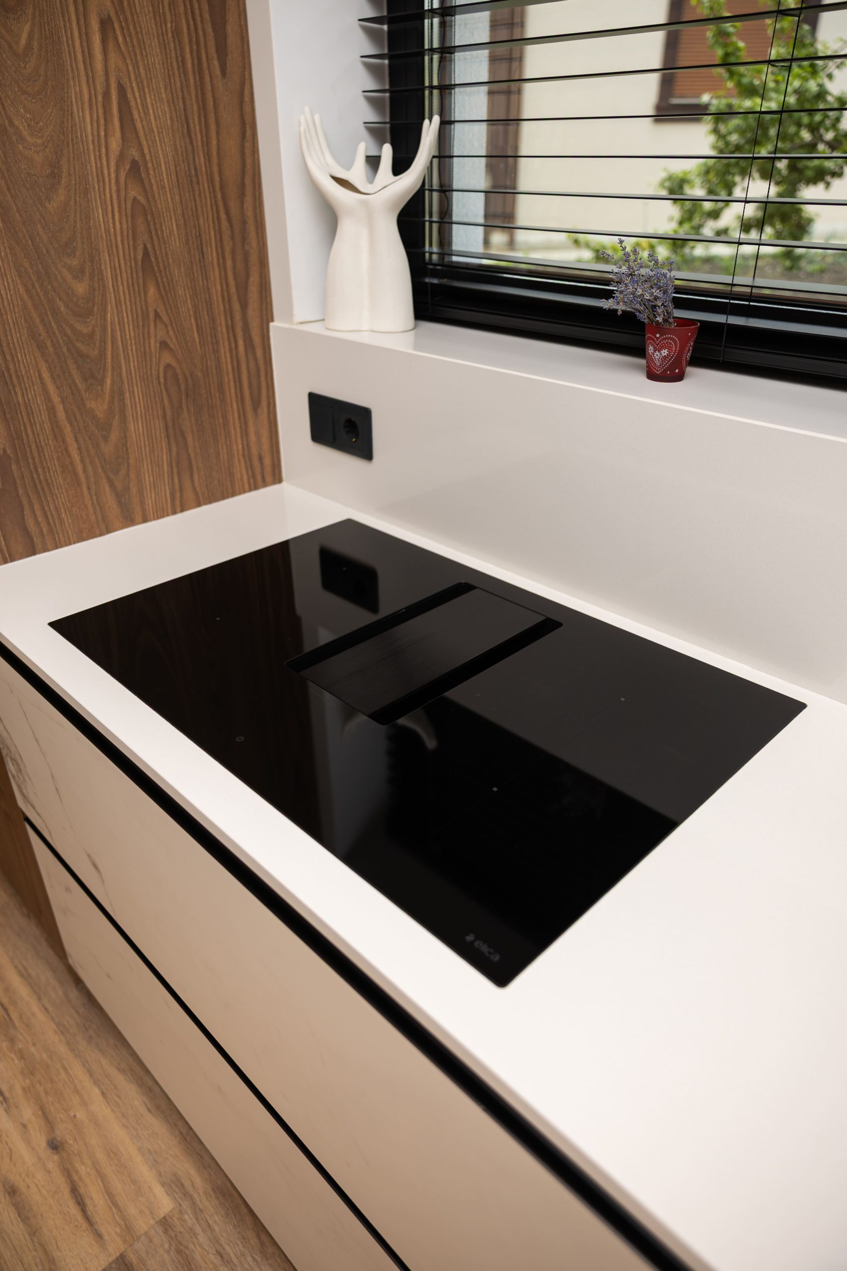 Acest proiect pune accent pe echilibrul dintre estetică și funcționalitate, printr-o amenajare completă realizată cu mobilier personalizat, adaptat fiecărui spațiu din locuință. La primul nivel, zona de living și bucătărie este definită de contraste elegante între texturi calde și suprafețe moderne, completate de soluții integrate de depozitare. Un element distinct este spațiul de sub scară, transformat într-un sistem discret și eficient de organizare. Zona de baie și spațiul de laundry completează funcționalitatea acestui nivel, fără a încărca vizual interiorul. La etaj, dormitorul matrimonial este gândit ca un spațiu relaxant, cu o garderobă bine organizată și iluminare ambientală integrată. Camerele copiilor includ birouri și spații de depozitare adaptate utilizării zilnice, iar zona de baie păstrează aceeași linie modernă, cu mobilier minimalist și finisaje atent alese.